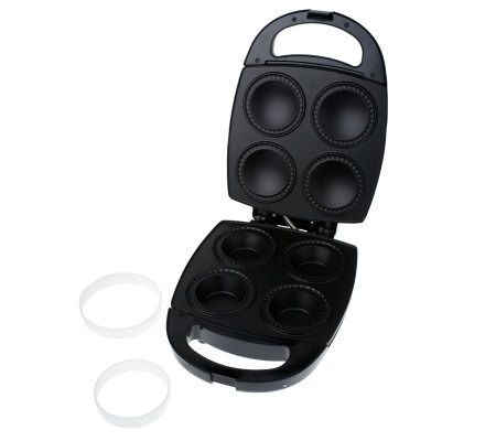Cute as pie. Bake up to four individually sized pies at the same time with this clever pie and cake maker. A locking latch and crimper ensure each pie's edges are completely sealed, while the nonstick plates allow for easy food release and quick cleanup. The included pastry cutters guarantee your crust is a perfect fit. From Cook's Essentials(R) Kitchenware.
