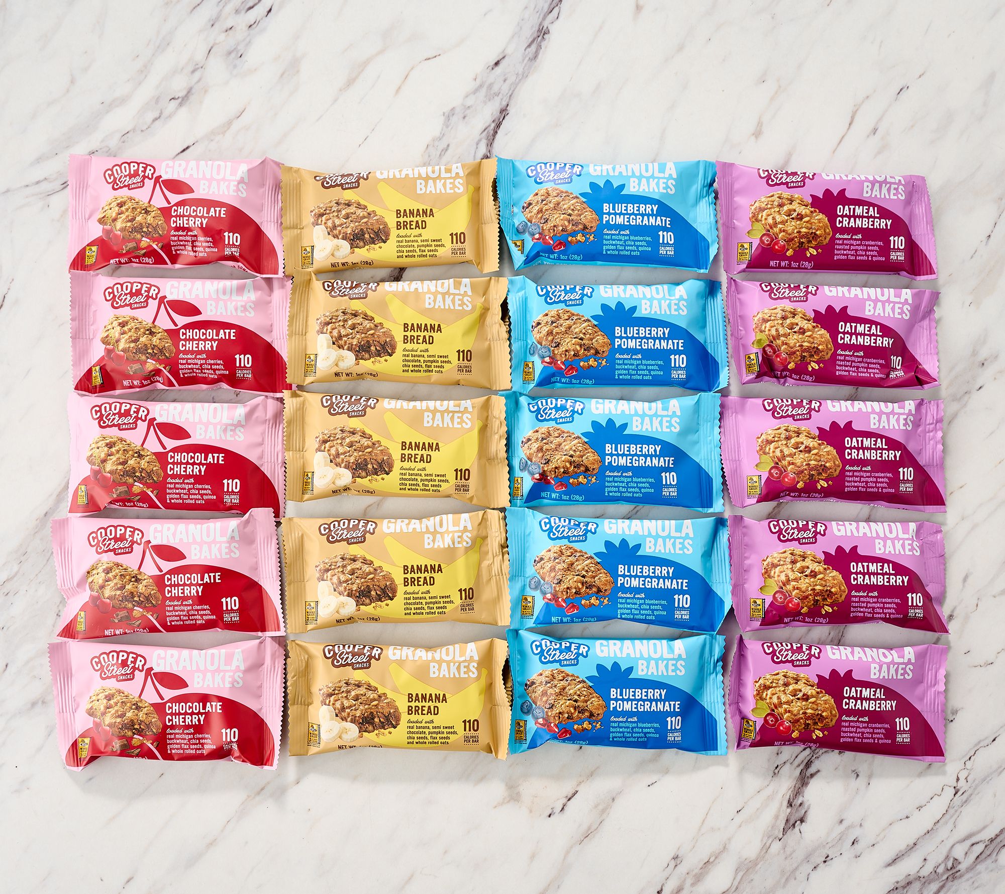 • Combo: five each of Blueberry Pomegranate, Banana Bread, Chocolate Cherry, and Oatmeal Cranberry