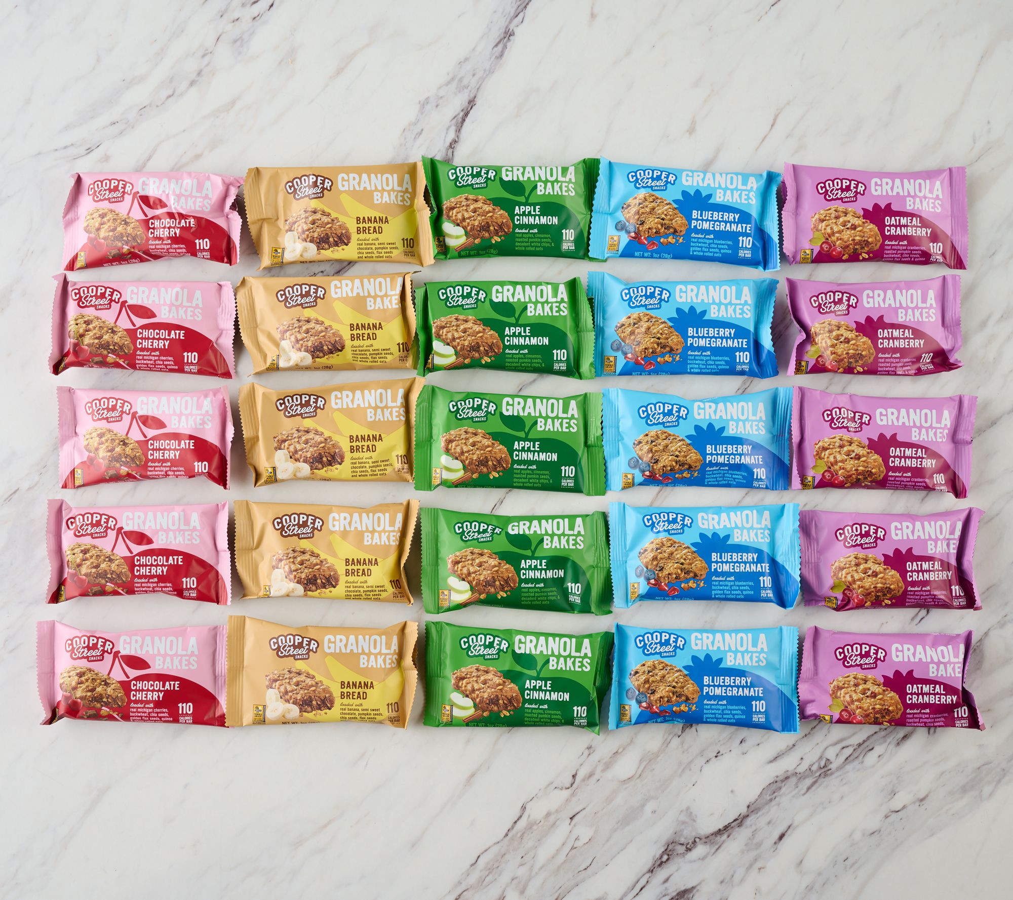 • Combo: five each of Blueberry Pomegranate, Banana Bread, Oatmeal Cranberry, Chocolate Cherry, and Apple Cinnamon bars