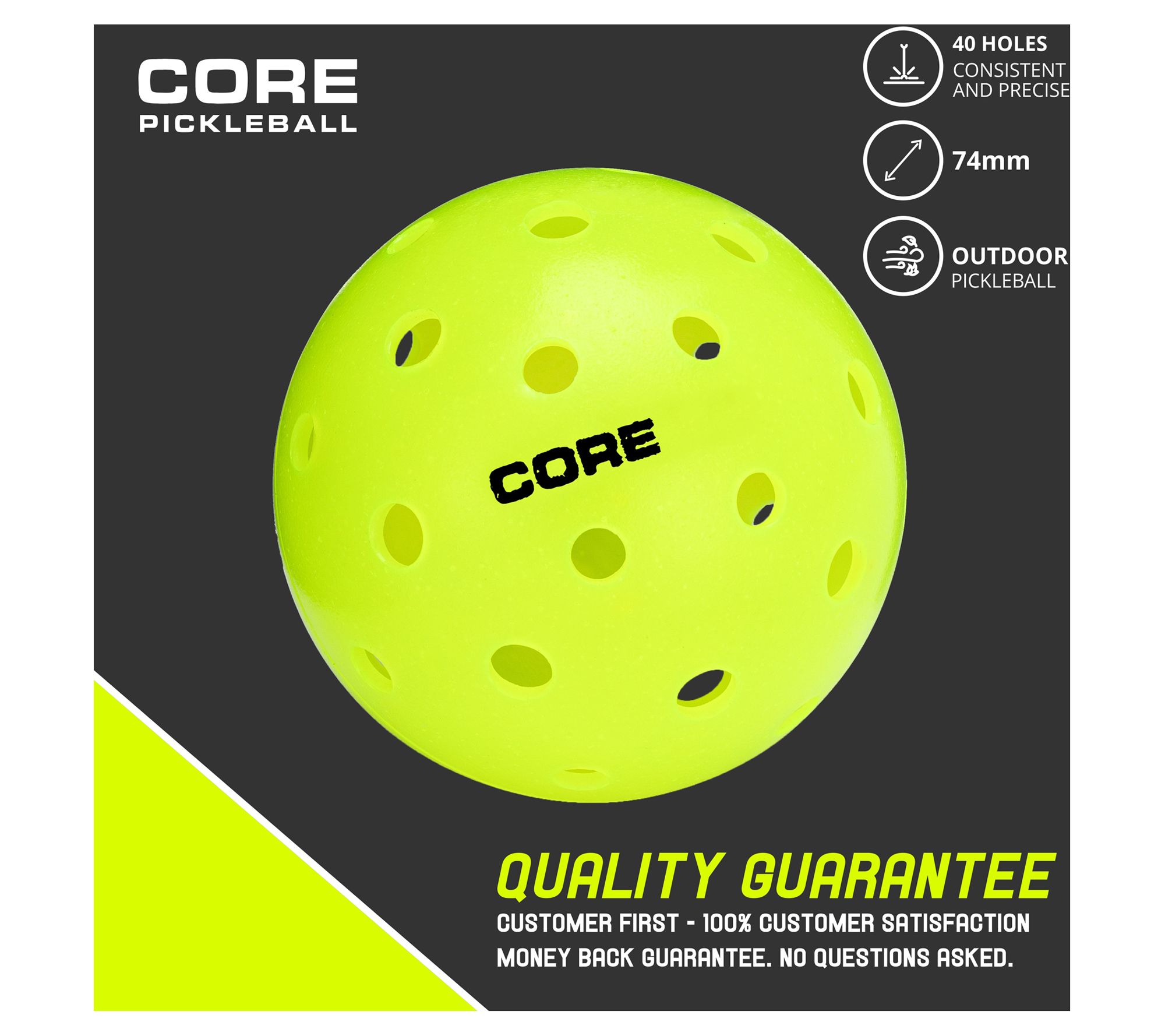 Bring a vibrant edge to your outdoor games with these neon green pickleballs. Thanks to precision-drilled holes, wind won't stand in the way of your victory, while their reliable bounce ensures each shot counts. Designed for all-weather play, these balls keep you confident on the court, no matter the conditions. From CORE Pickleball.