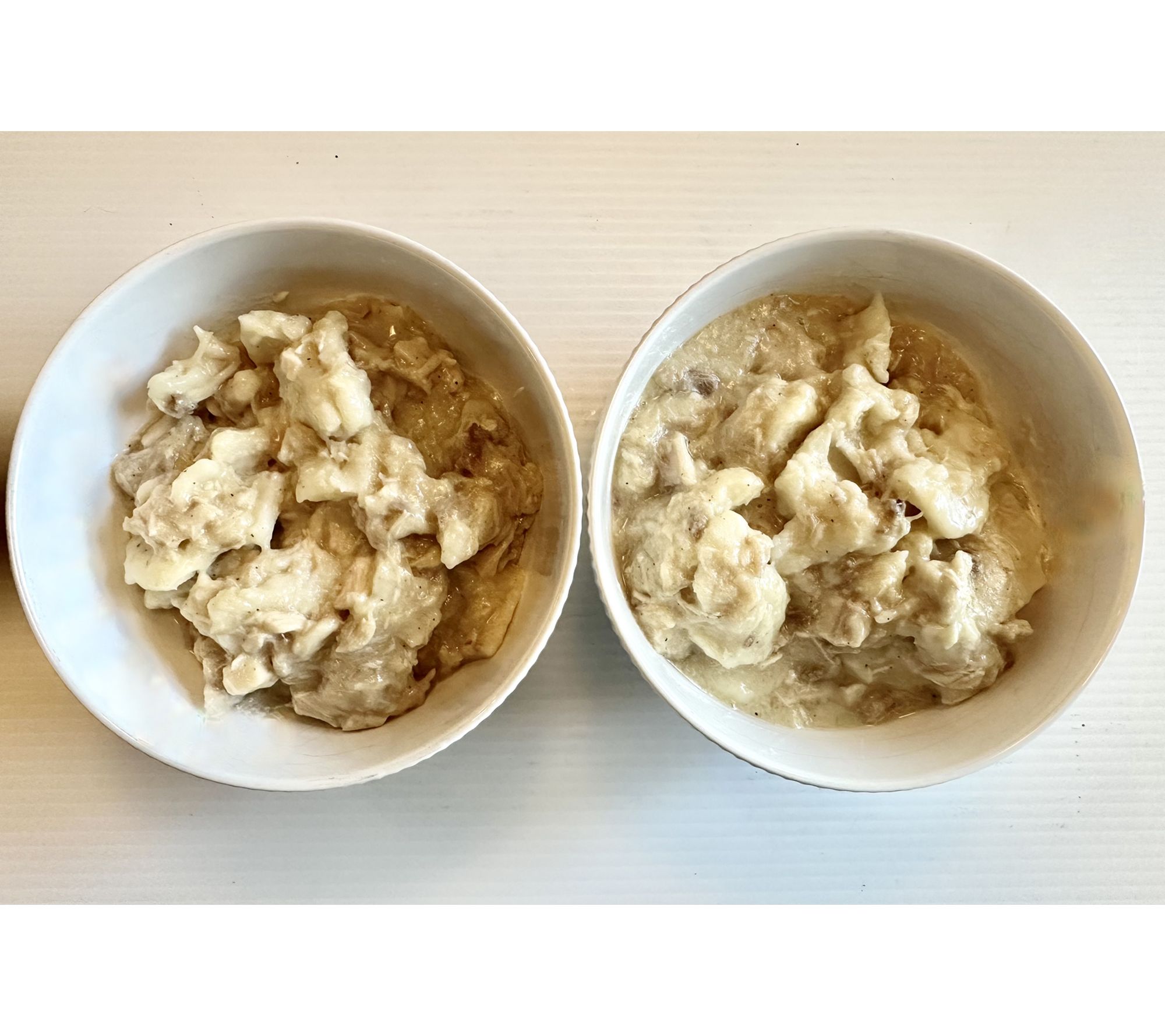 Made with dark and white chicken, flour dumplings, and chicken broth gravy