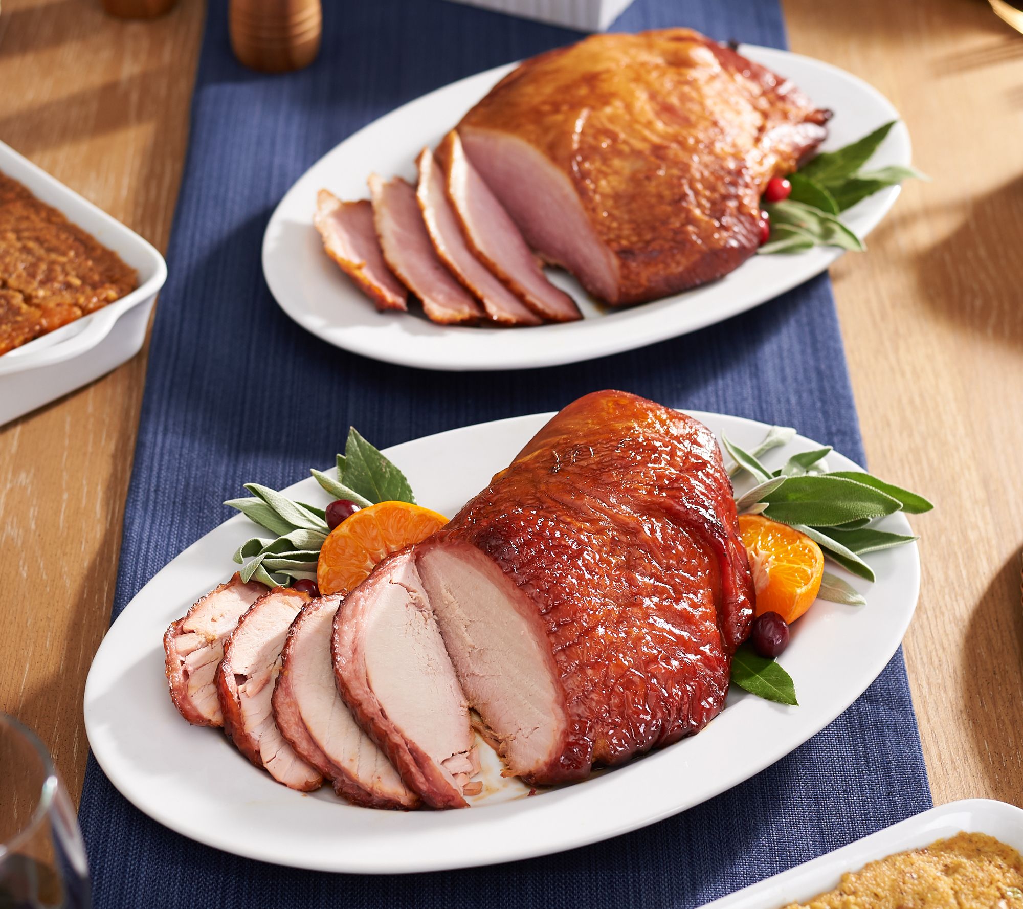 Ham: applewood-smoked, boneless, carving board-style ham covered with honey brown sugar glaze; thaw and oven bake at 350F for 75 minutes