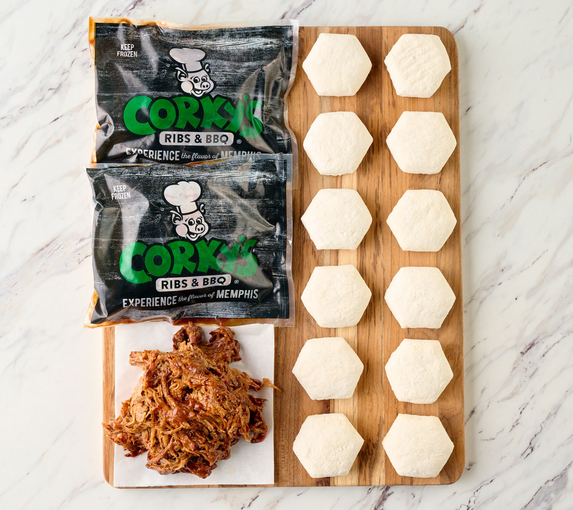 • Includes three 1-lb packs of pulled pork or pulled chicken and 12 2.5-oz homestyle take-and-bake biscuits