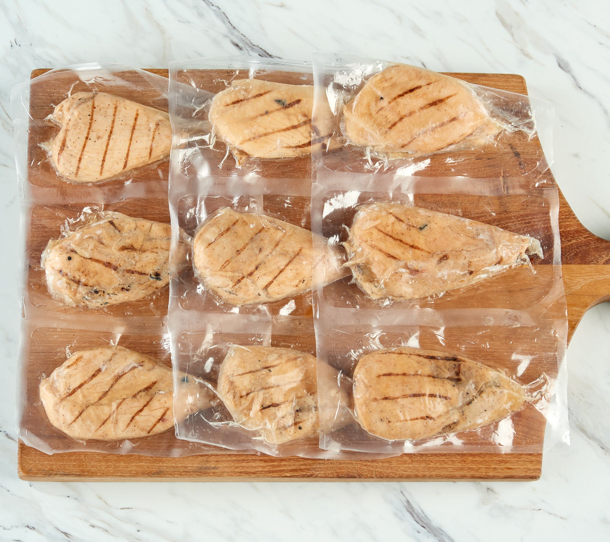 Includes nine 4-oz pre-grilled BBQ marinated chicken breasts