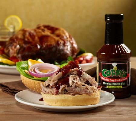 Includes 4.5-lb hickory smoked barbecue pork shoulder and bottle of barbecue sauce