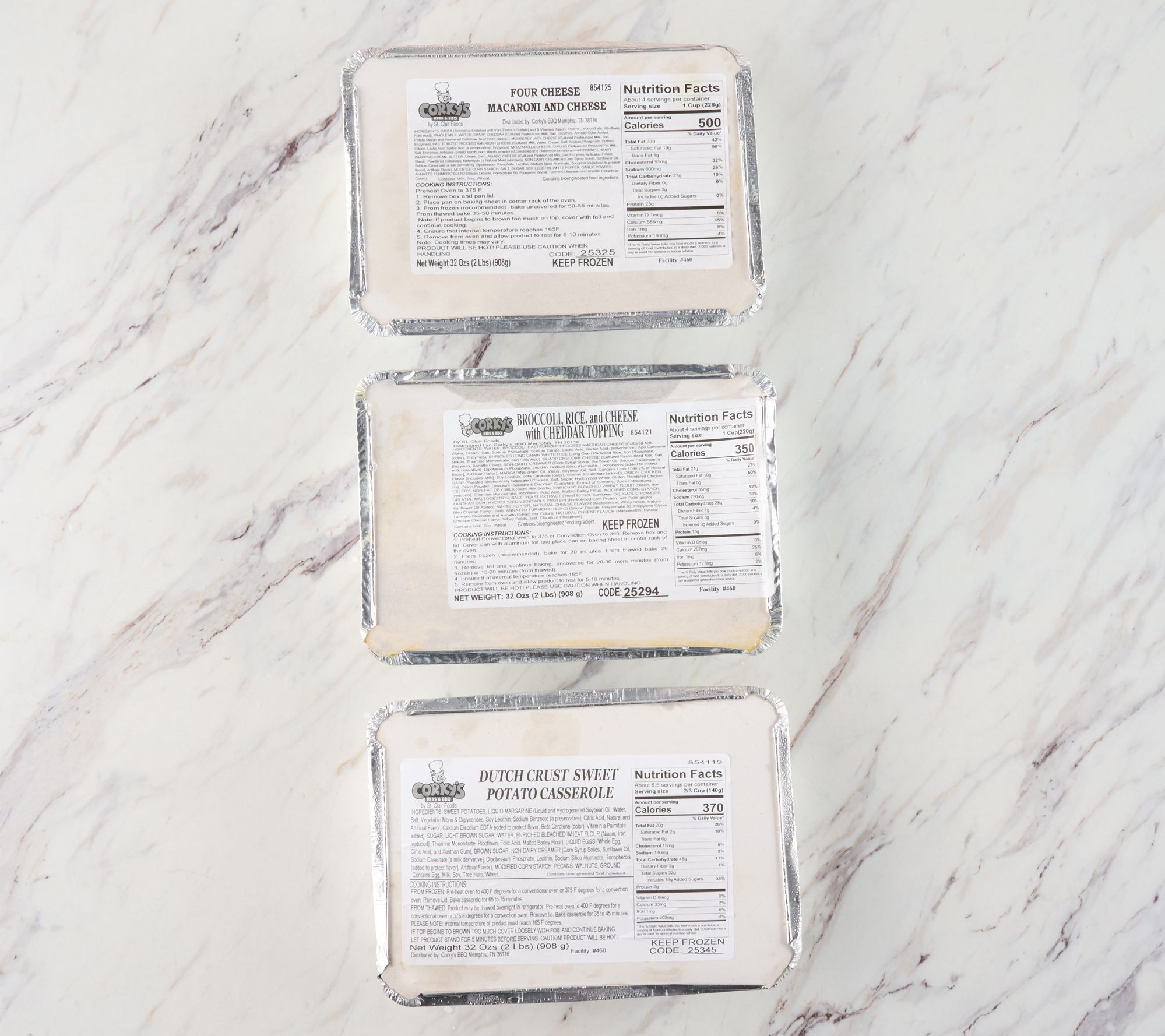 • Includes three 2-lb side dishes: one tray each of four cheese mac & cheese, Dutch crust sweet potato casserole, and broccoli rice with cheese