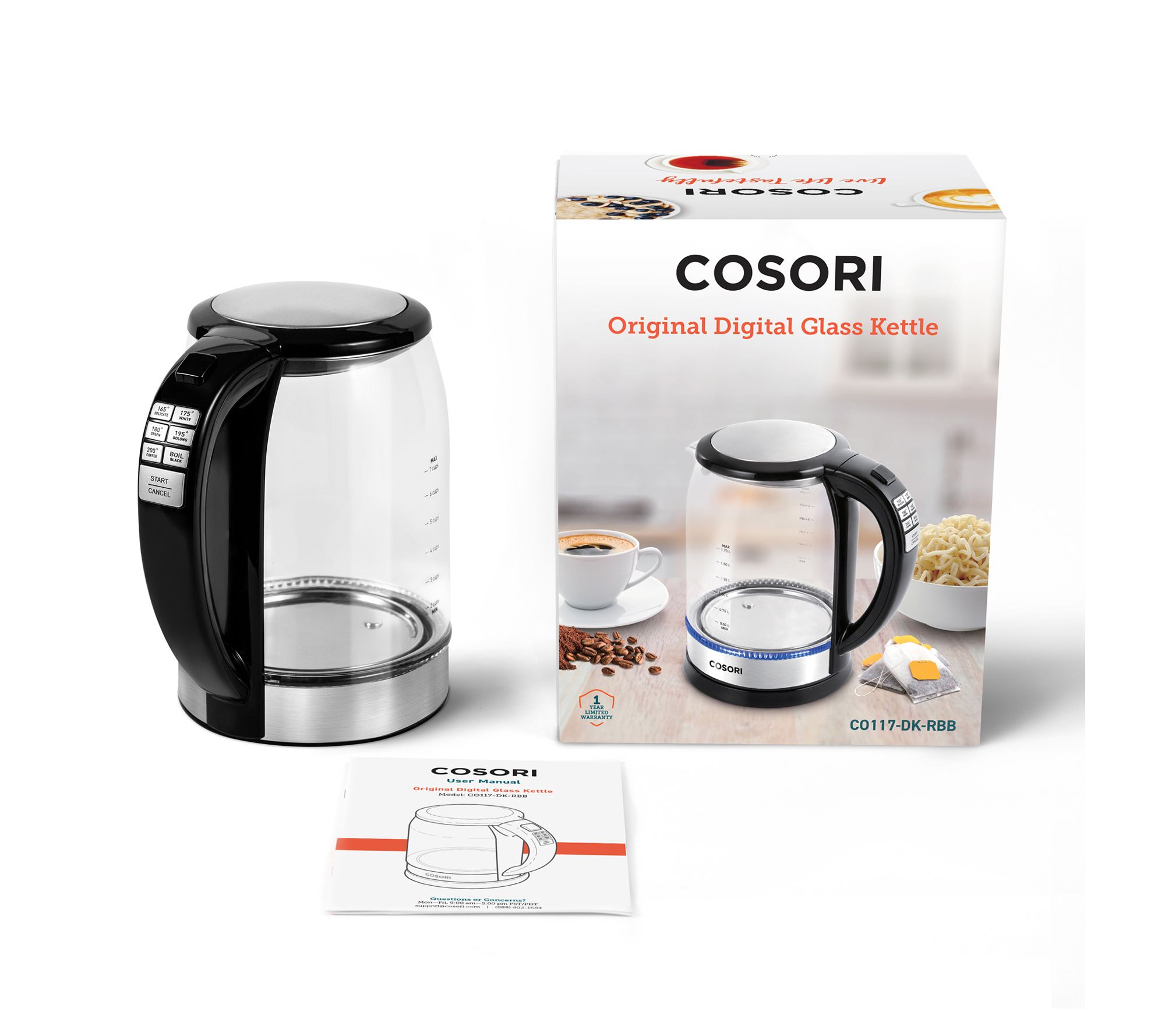 • Includes 1.7-liter electric kettle, 1500W power base, and user manual