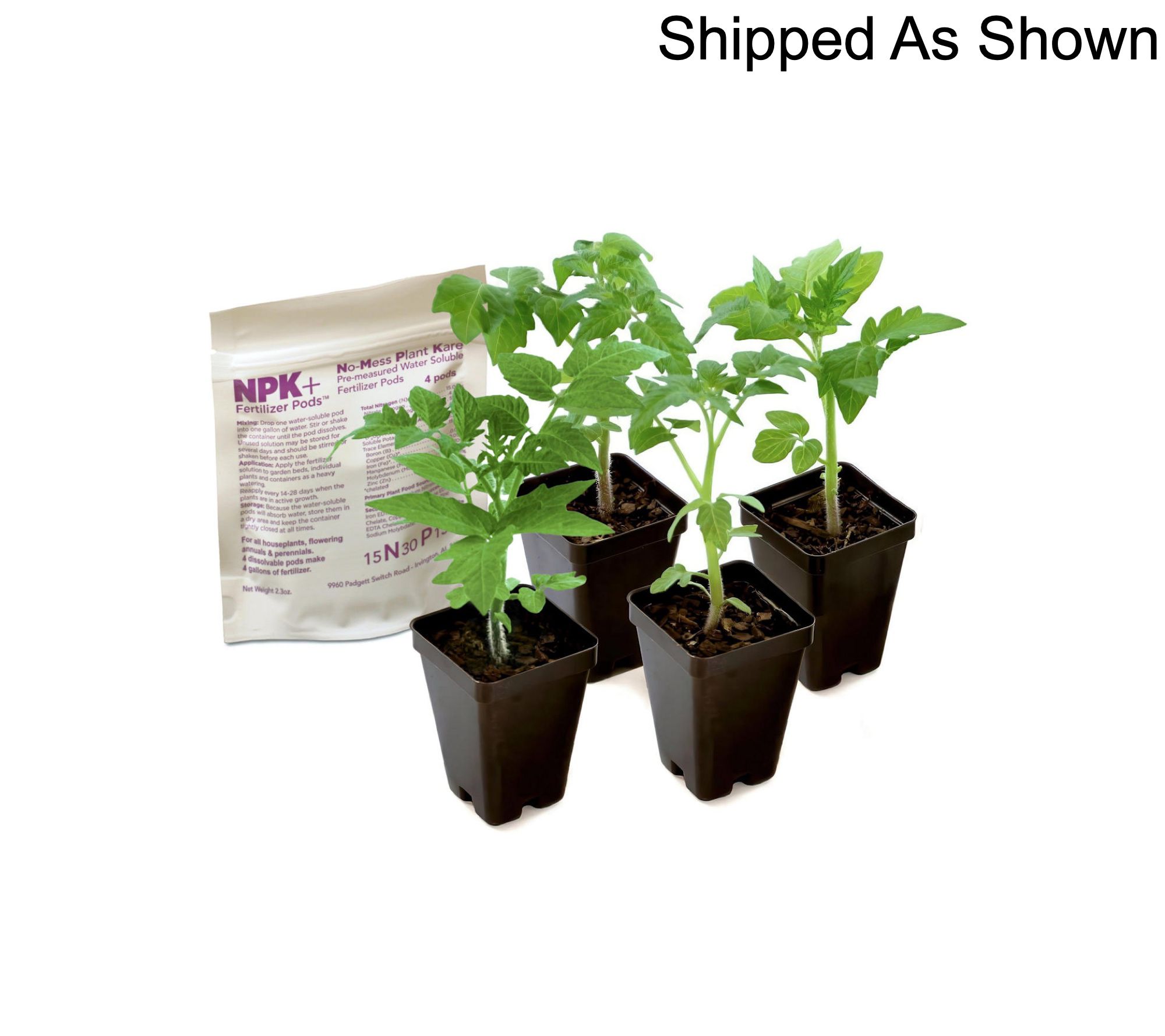 • Shipped as: four live tomato plants in 2.5" pots: one each of German Johnson, Paul Robeson, San Marzano, and Sungold; and one four-count NPK fertilizer pods for fruits and vegetables