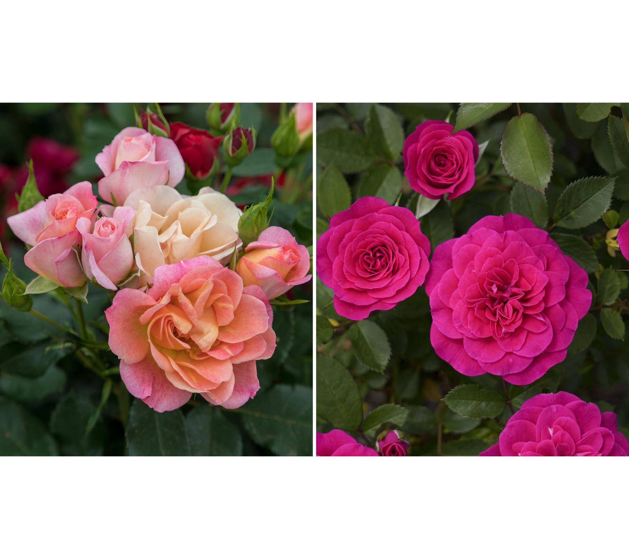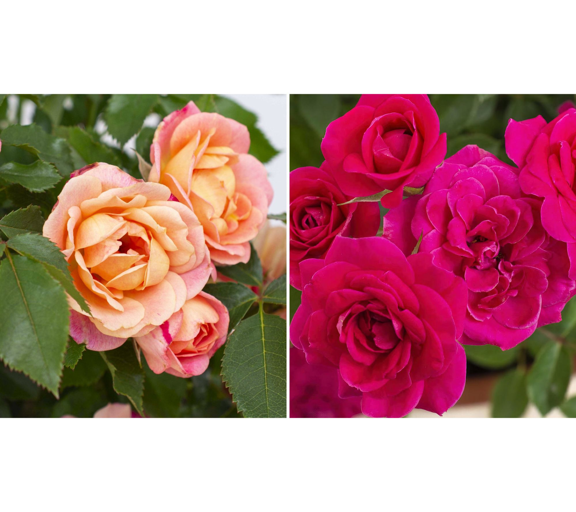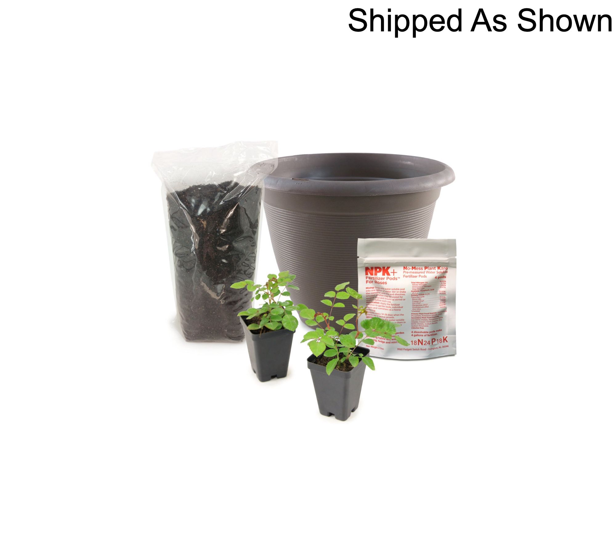 Two bold flower colors in a patio-ready kit. Create a stunning 2-N-1 effect on the patio or deck and enjoy abuntant blossoms from spring to fall. Winter hardy and suitable for any part of the country. Includes one each of Dragon Fruit Sunblaze and Peach Sunblaze in 2.5" pots, one 4ct NPK+ Fertilizer Pods for Roses, one 13qt bag of soil, and one 11 plastic Cappuccino planter. Perennial; Winter hardy in zones 4-10; Shipped as potted plants; Plant in spring; Cannot ship to PR, HI, VI, AK, Guam