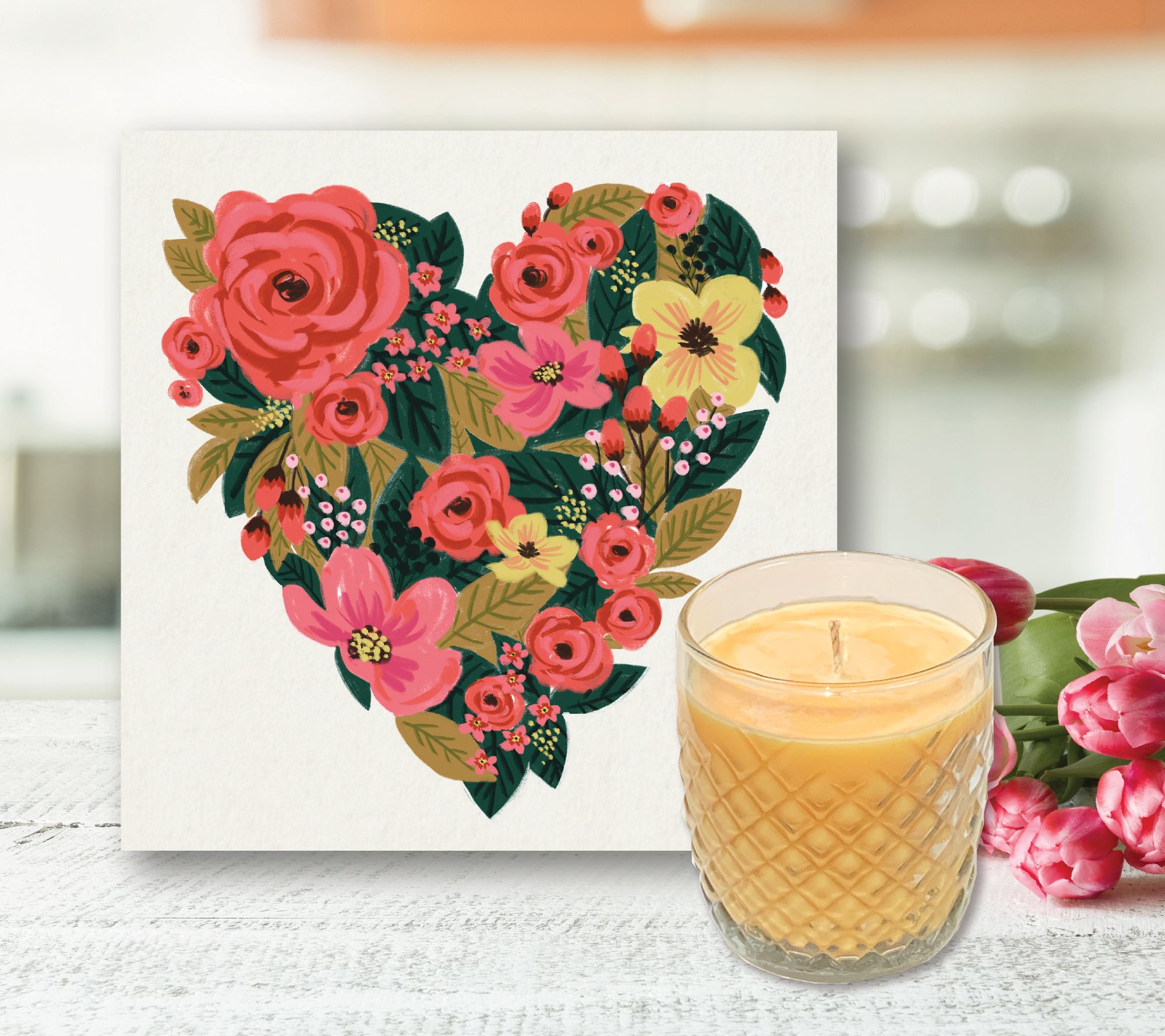 Offering a lilac scented candle in textured glass and a beautiful floral heart print, this art board set is a colorful way to add a touch of romance to your space. From Courtside Market.