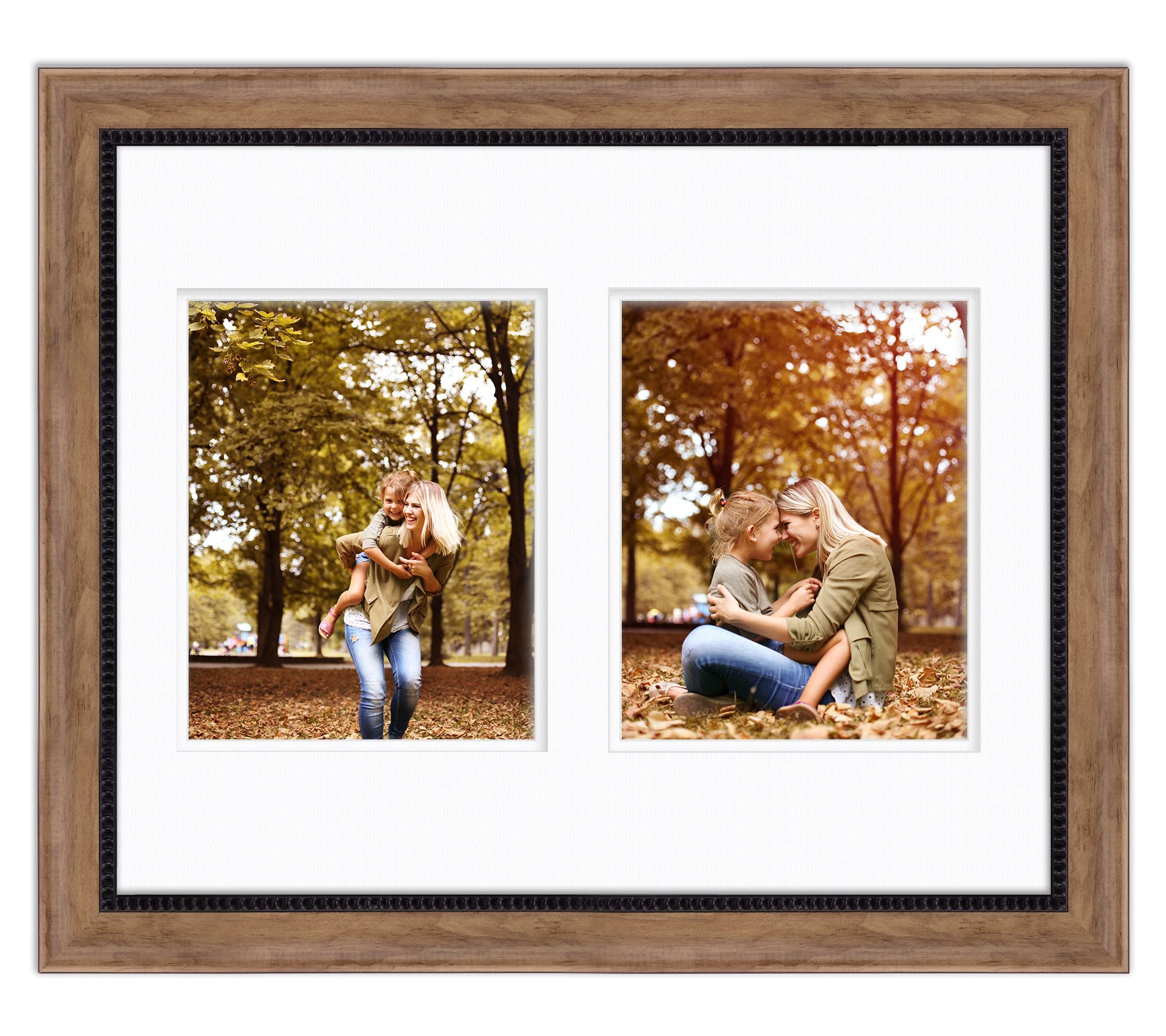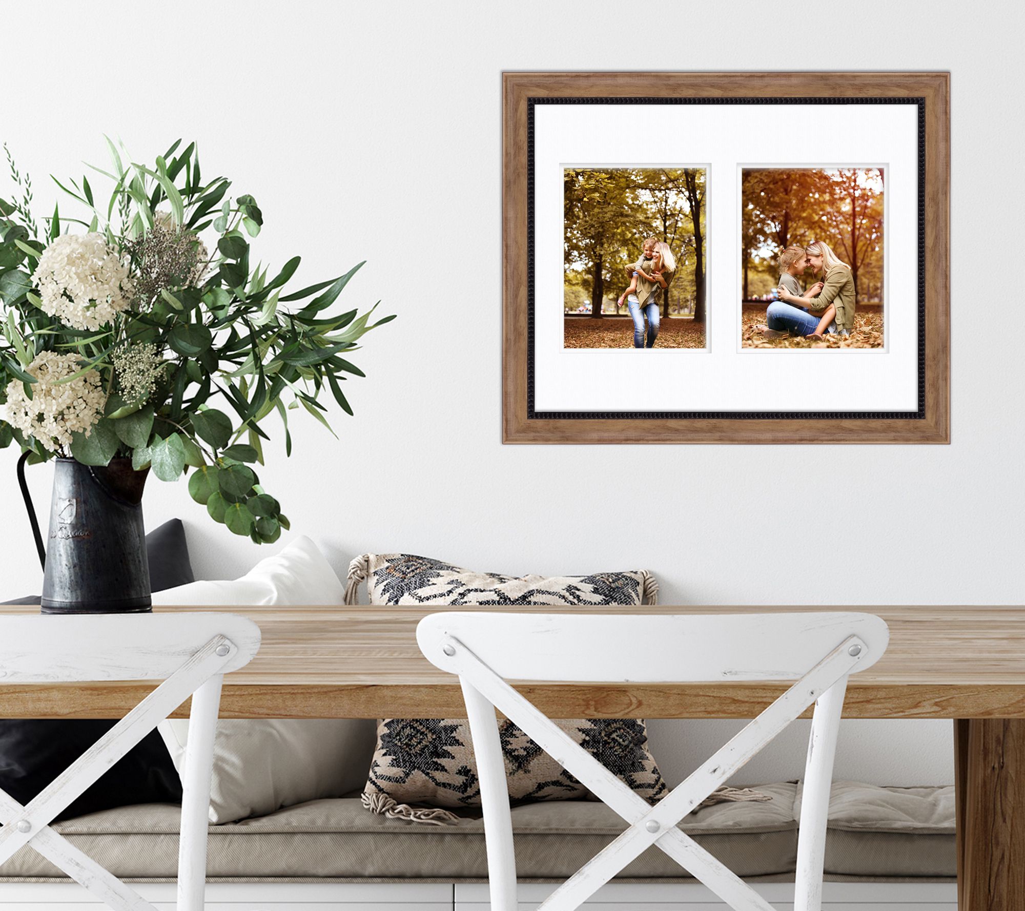 Showcase your cherished memories or images and transform your wall space with this beautiful wood frame that holds two 8" x 10" photos side by side in a double mat design. This elegant oak and black frame is ready to hang right out of the box. From Courtside Market.