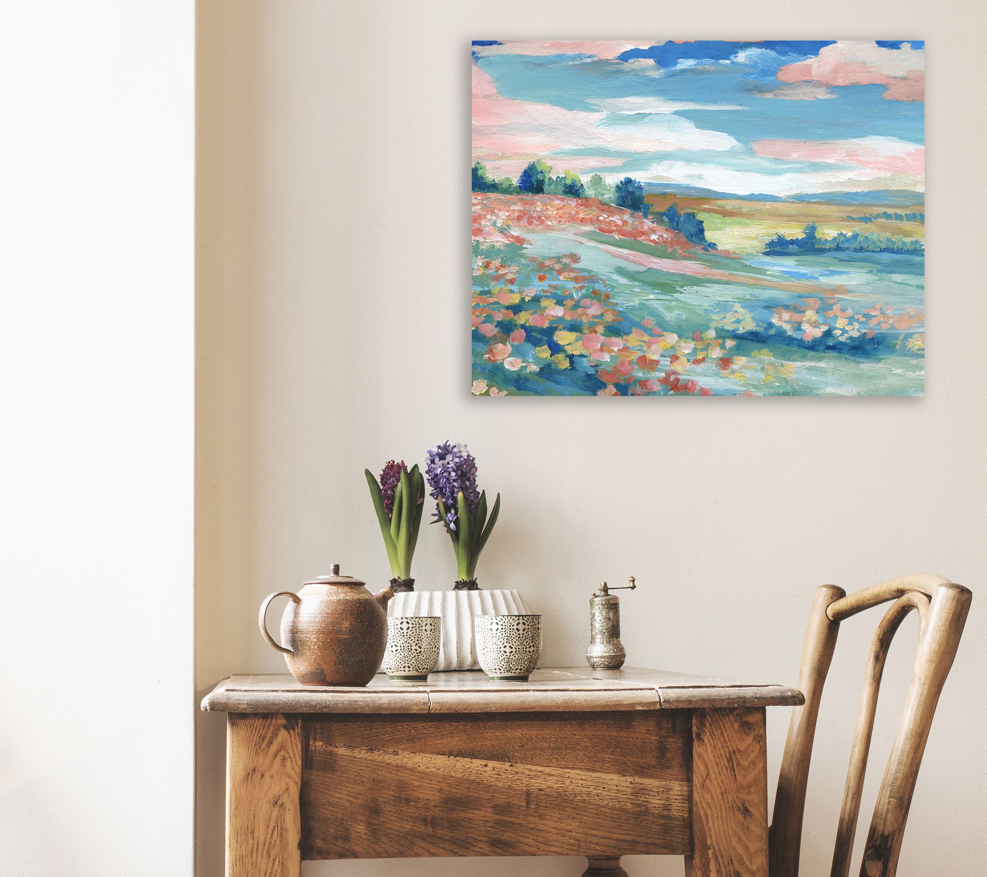 With a clear blue sky, fluffy clouds and rolling hills adorn with colorful flowers, this Pastoral canvas can bring a vibrant countryside to your home instantly. From Courtside Market.