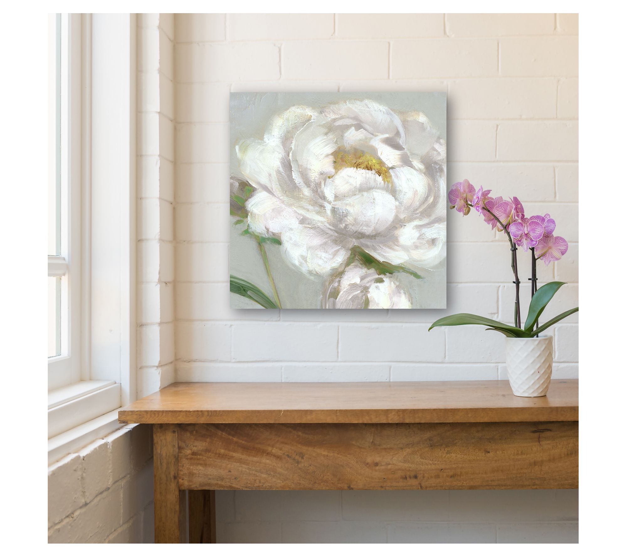 Delicate and beautiful, this classic white peony is set against a soft gray background with pops of leafy green, perfect for adding subtle elegance to your wall art collection. From Courtside Market.
