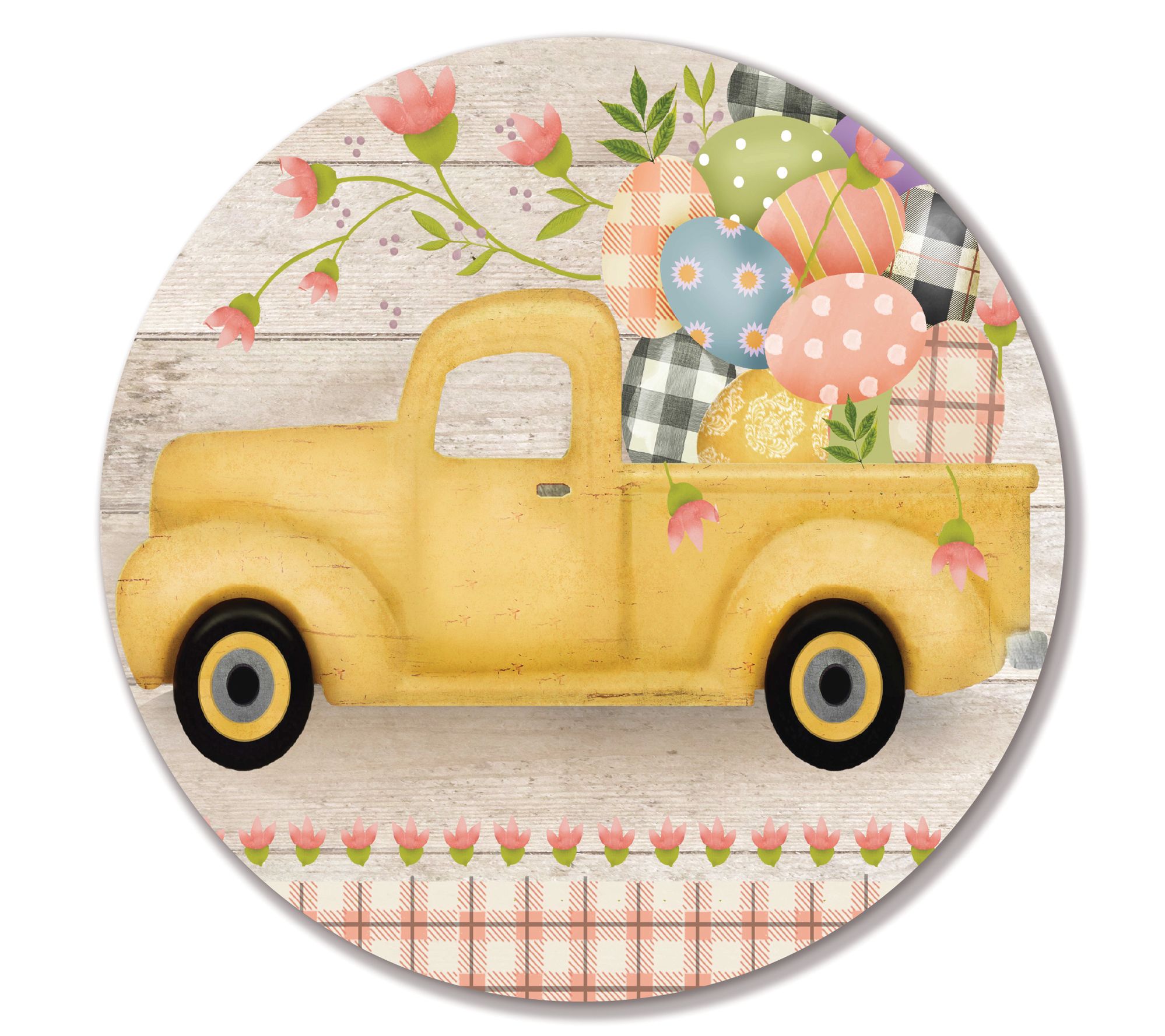 Bring a touch of Easter charm to your home with this delightful circular artboard featuring a beautifully detailed truck design. Ready to hang and perfect for any room, this eye-catching piece adds seasonal festivity to your indoor or outdoor space. Enjoy the excellent quality and warp-resistant design that ensures long-lasting enjoyment. From Courtside Market.