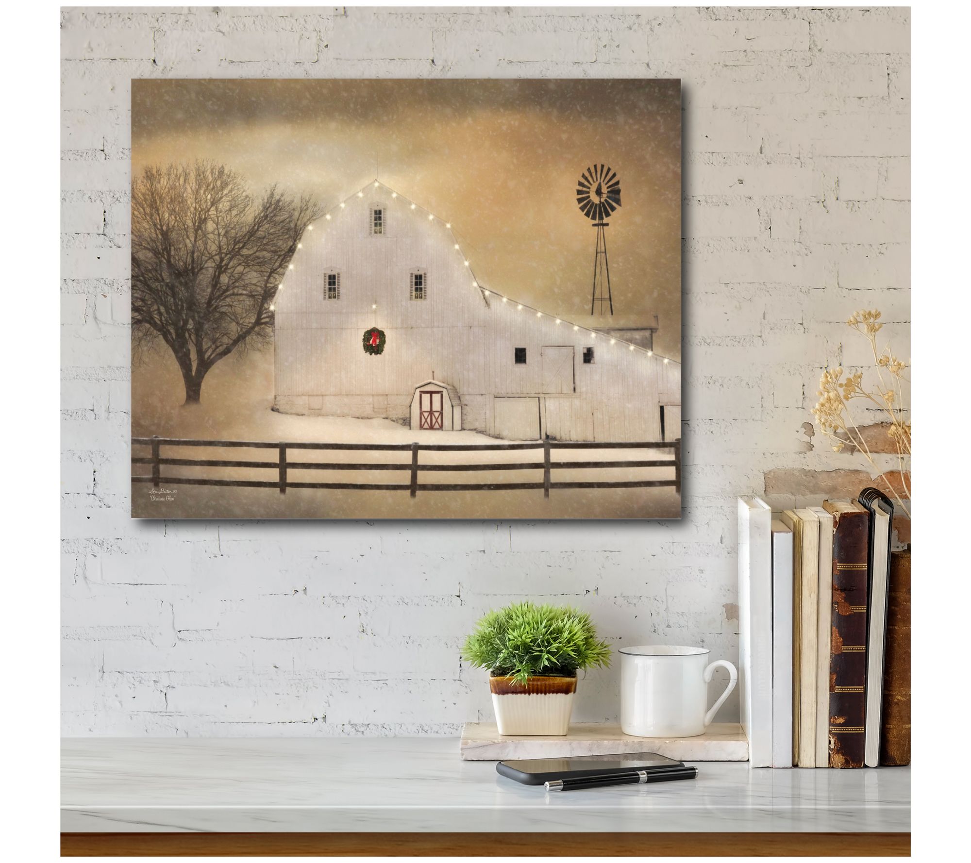 You can practically hear the soft snowfall land on the roof of the old white barn when you add this season-right print to your cozy home setting. From Courtside Market.