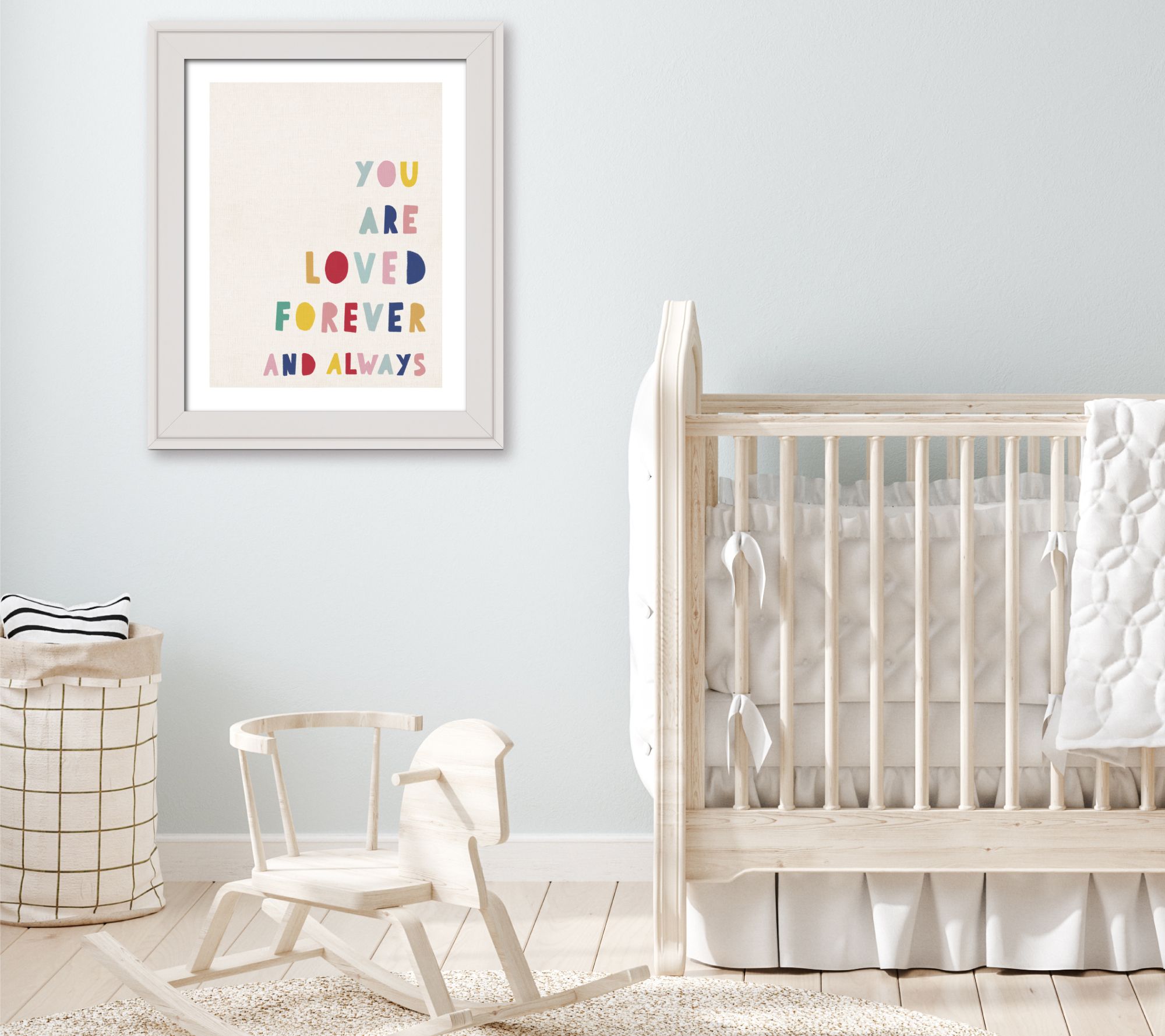 A sweet way to add a pop of color to your space, this beautiful framed giclee print is a beautiful reminder that you are loved forever and always. From Courtside Market.