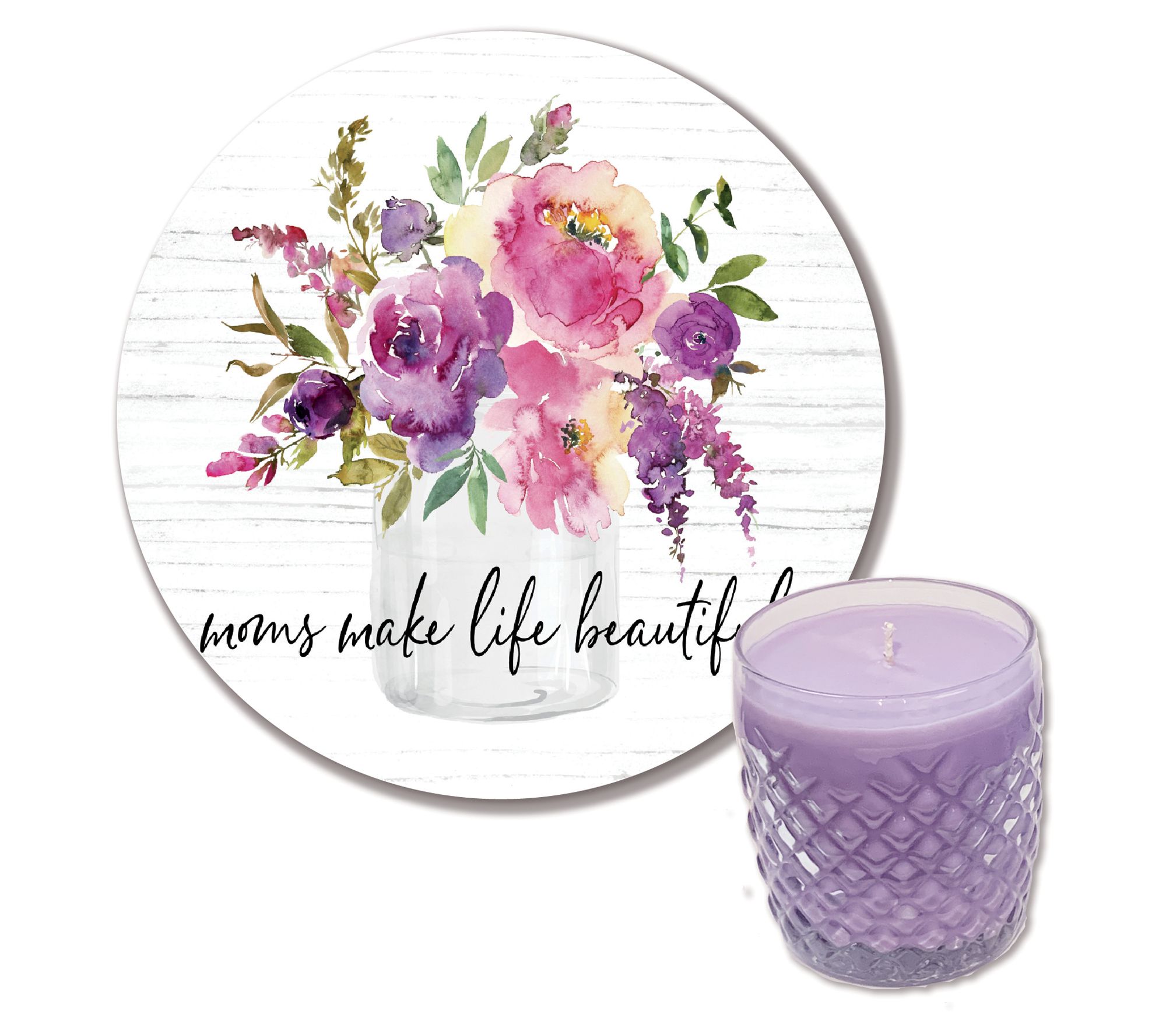 Celebrate the joy that moms bring to a child's life with this two-piece set, featuring a lilac scented candle, a sweet message, and a lovely mix of pinks, purples, and fresh green. From Courtside Market.