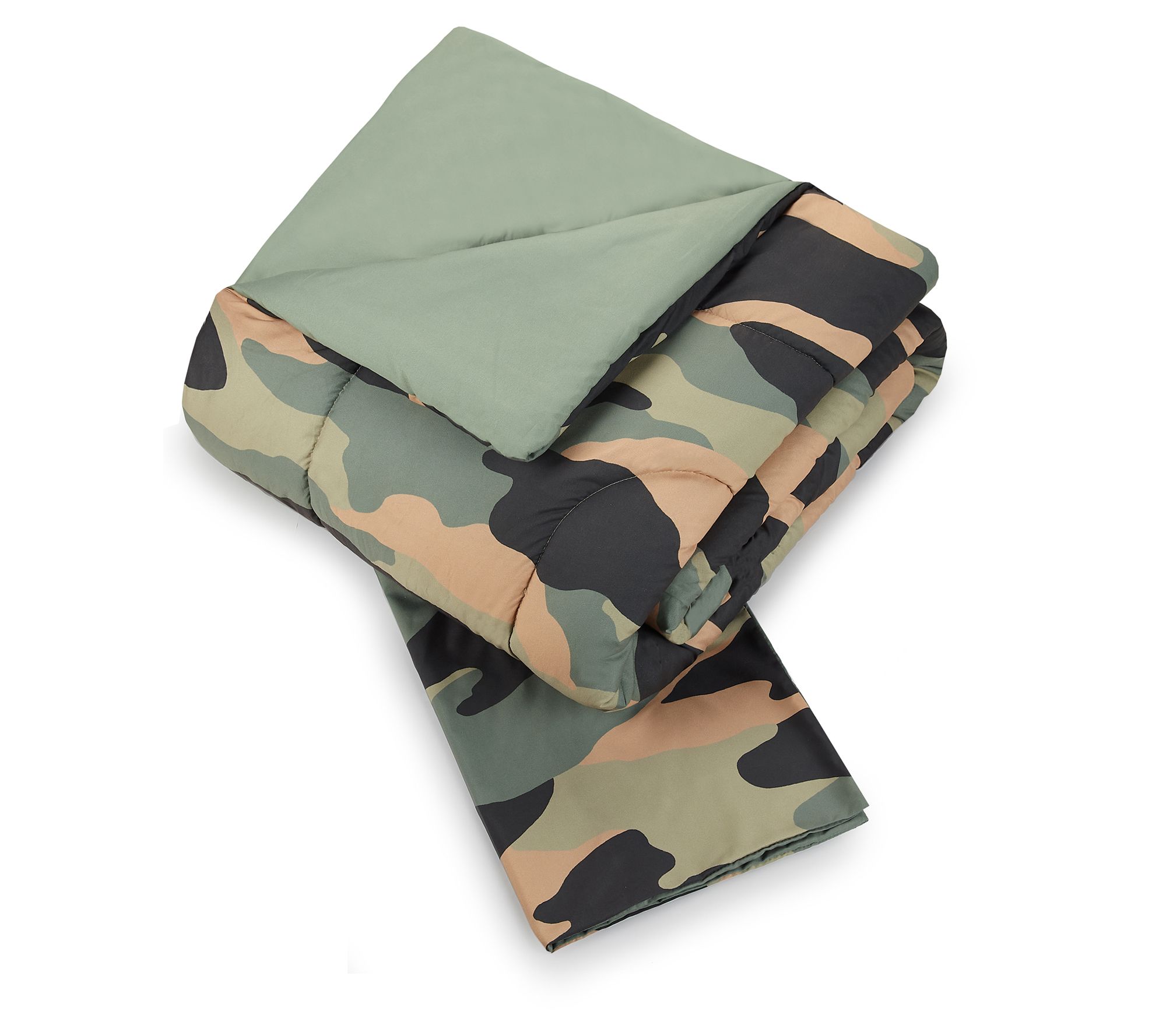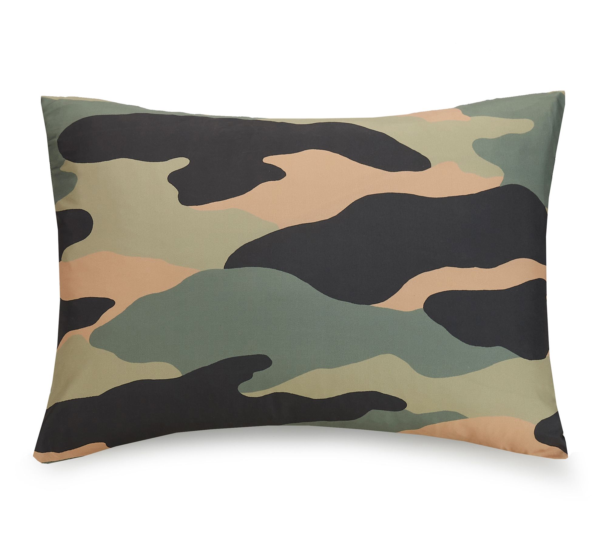 With its bold camouflage pattern that reverses to reveal an army green solid, this fun comforter set brings rugged style to your bedtime routine. From Urban Playground.