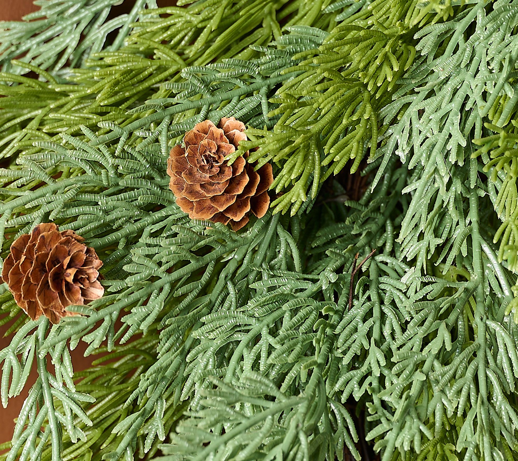 Welcome guests and create a welcoming atmosphere with this lifelike cypress and pinecone wreath, beautifully designed to bring the charm of a woodland retreat to your entryway or living space. Its full, lush greenery and pinecones add a cozy touch, whether displayed indoors or on a covered porch. From Cozy Cottage by Liz Marie.