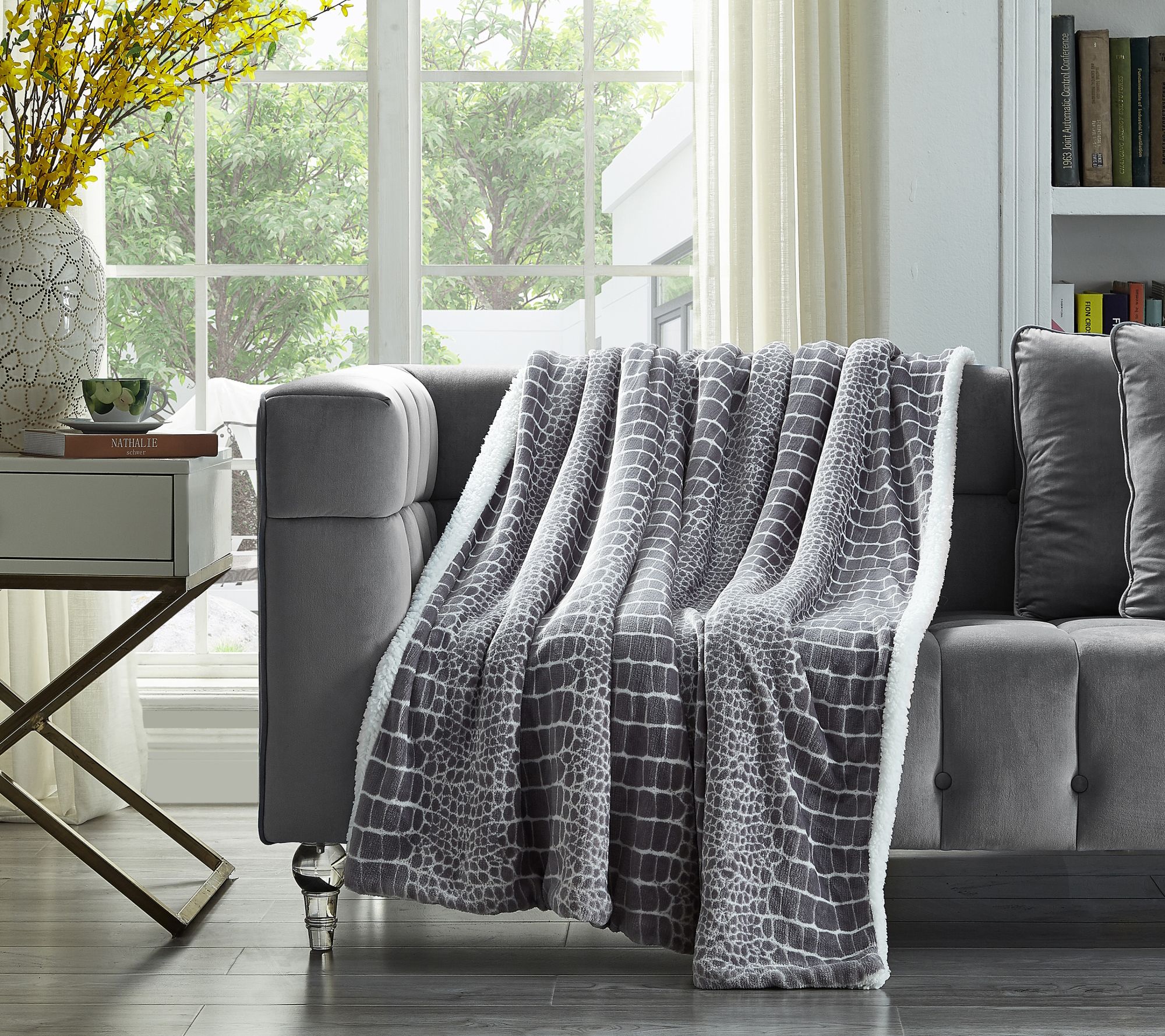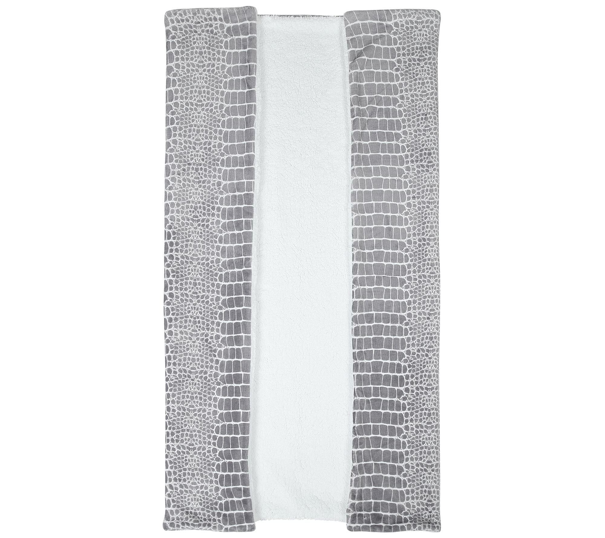 • Flannel animal print reverses to solid-color sherpa