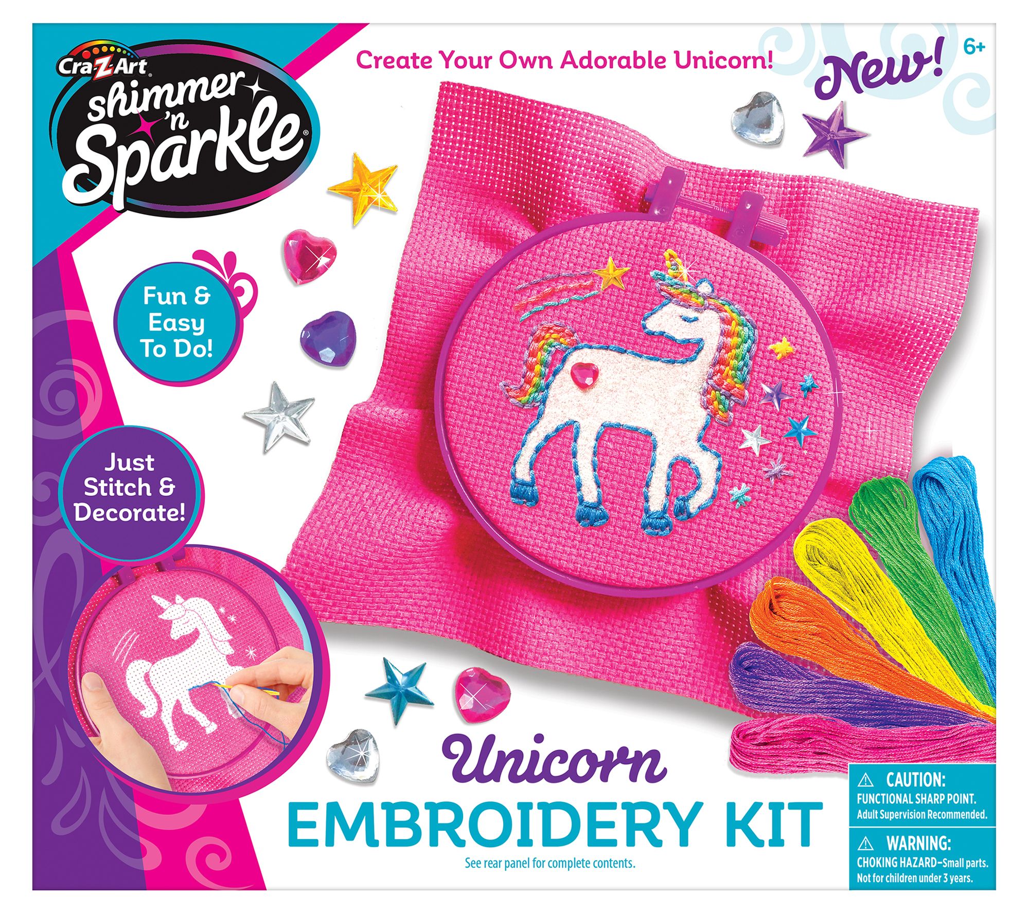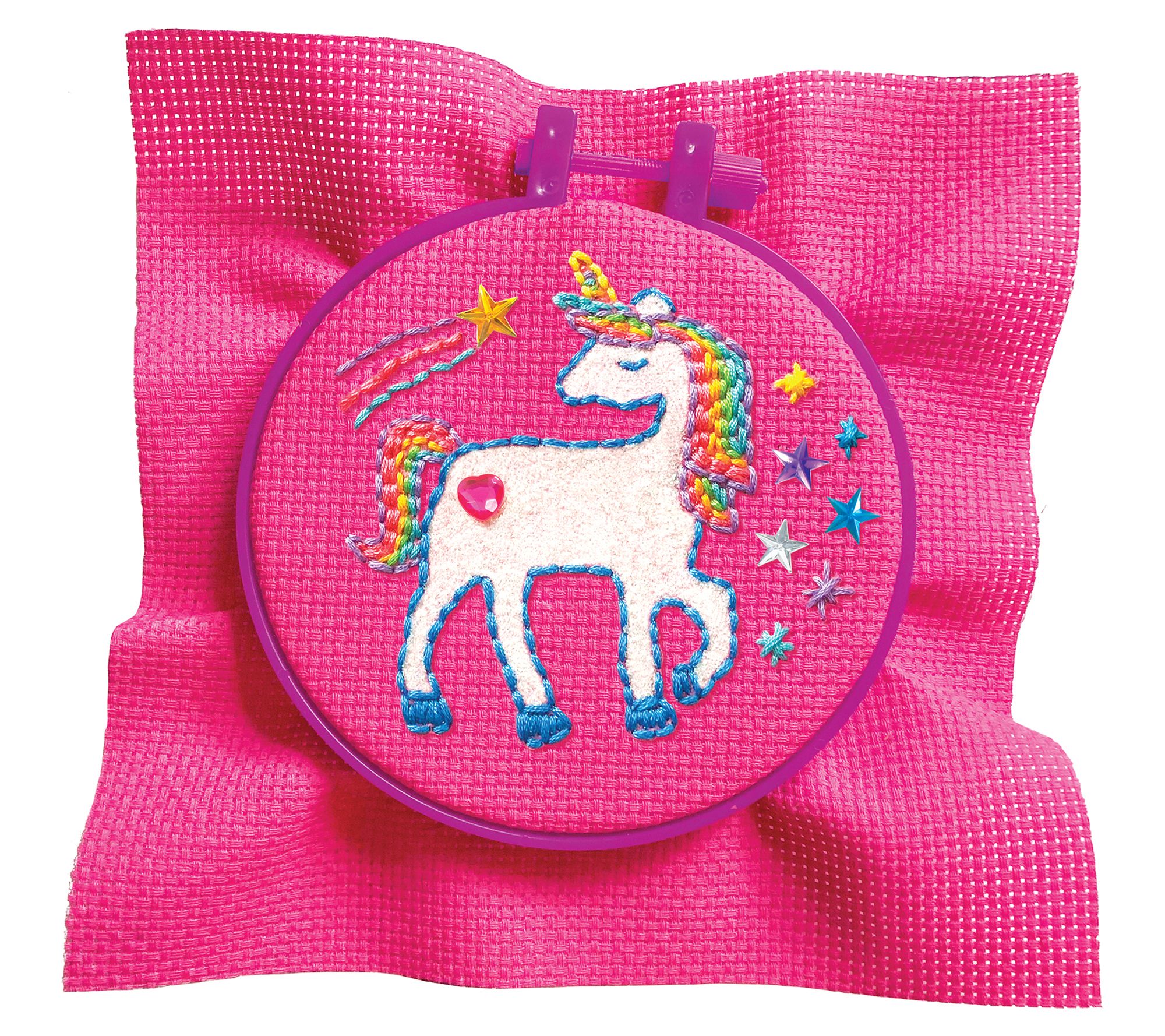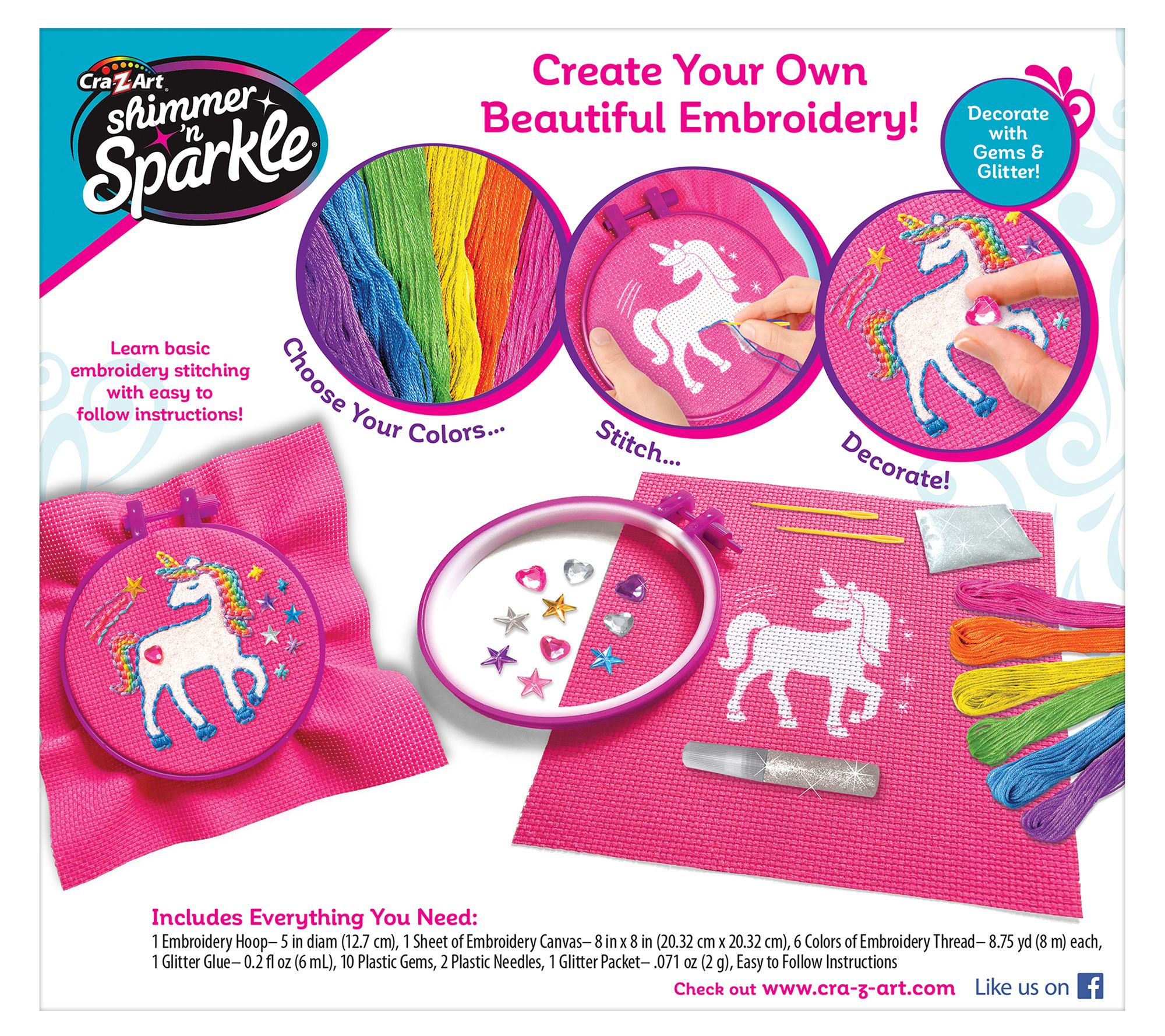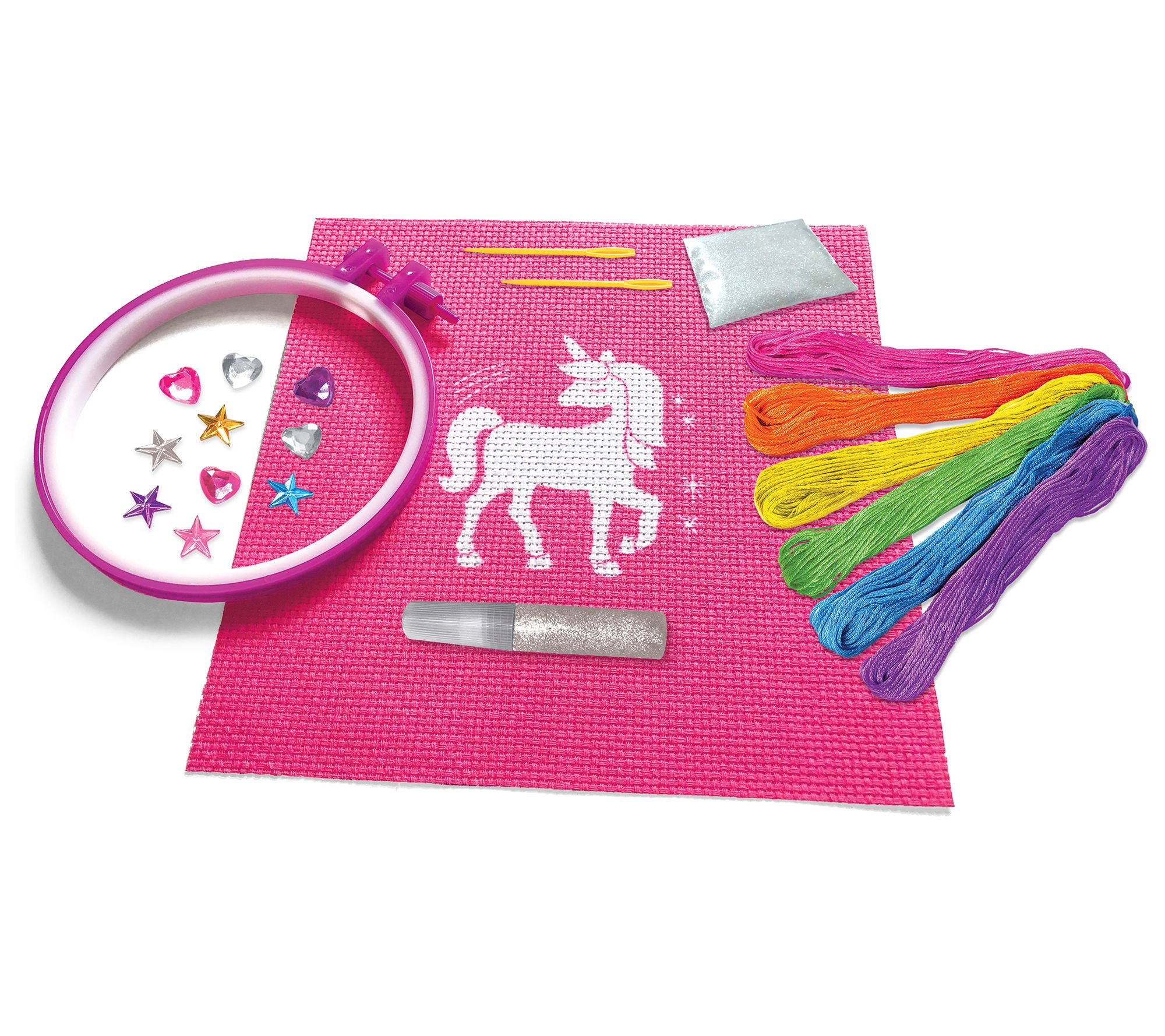 • Includes embroidery hoop, sheet of canvas, six colors of embroidery thread, glitter glue, 10 plastic gems, two plastic needles, and glitter packet