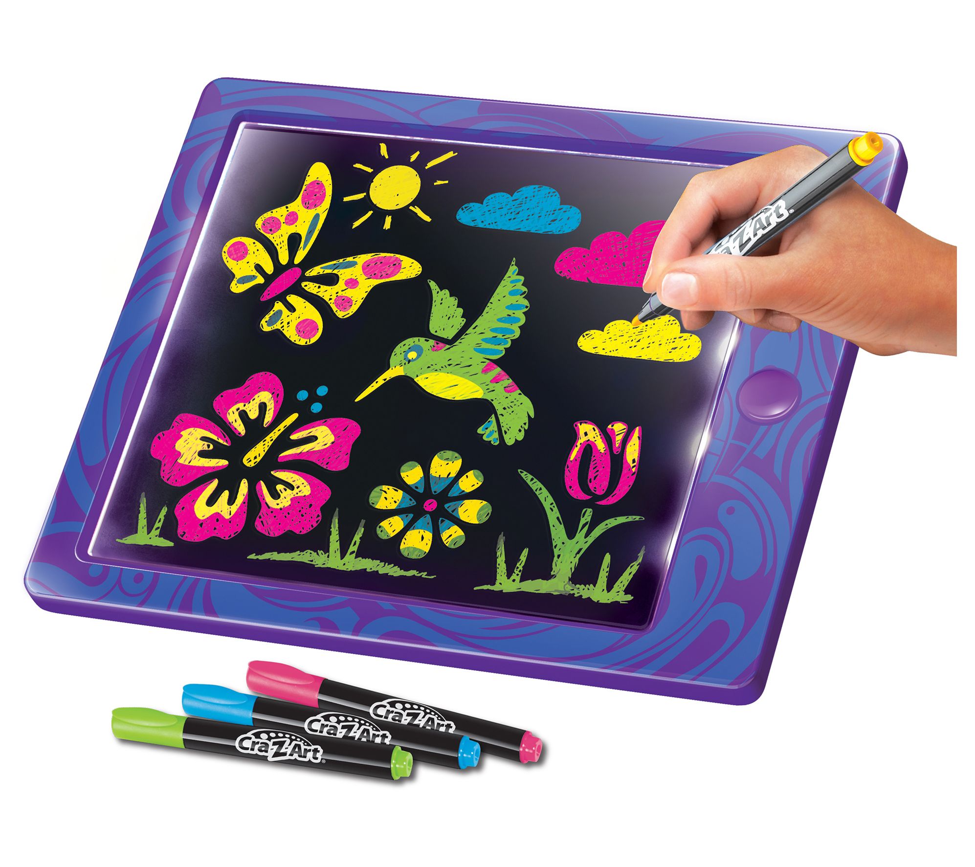 Let your child's creativity shine with the Cra-Z-Art super light-up design board. This vibrant drawing board features neon glow markers and stencils that bring their artwork to life in glowing colors. Perfect for budding artists, it's a fun and reusable way to create dazzling designs. From Cra-Z-Art.