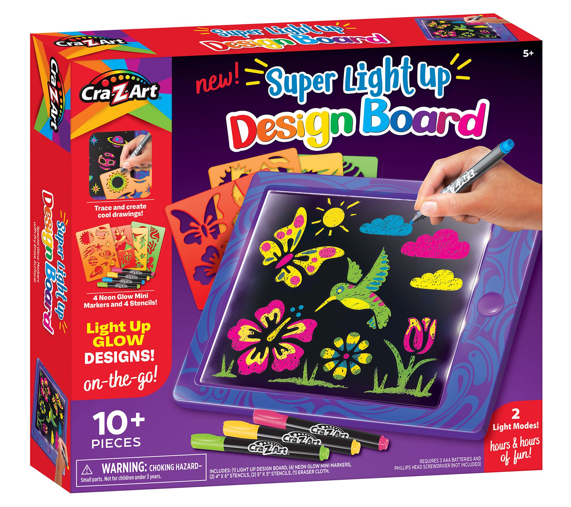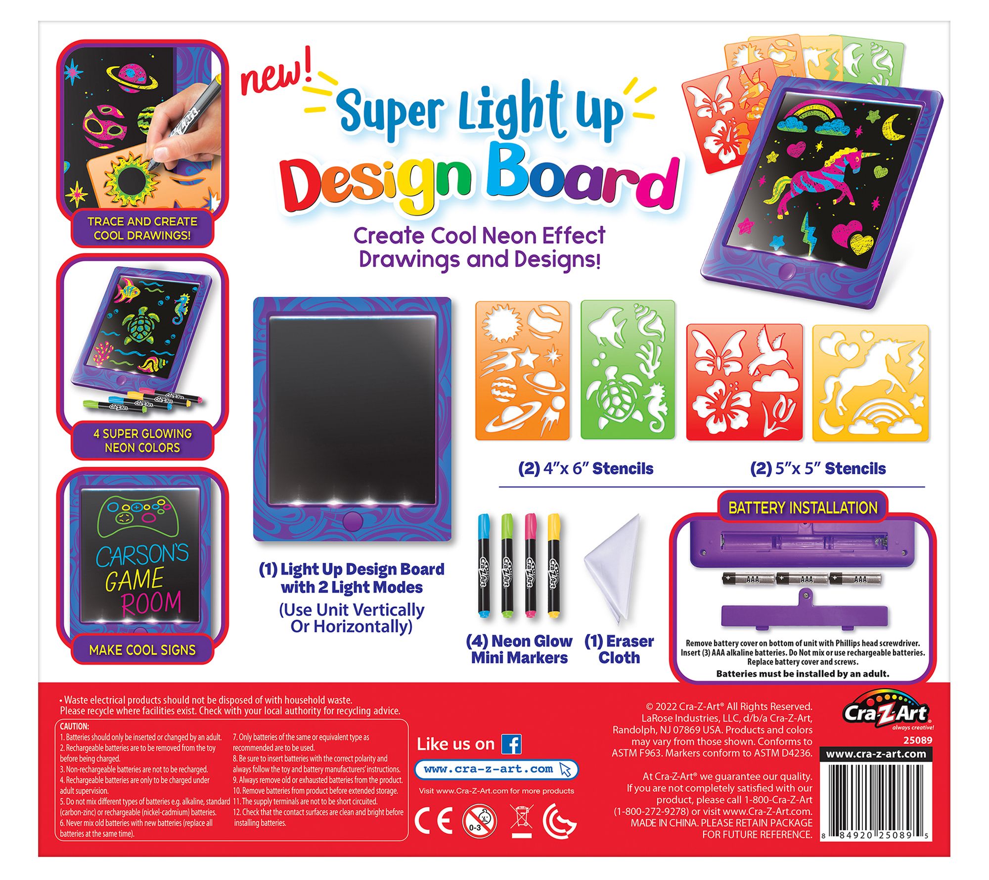 • Includes light-up design board, four stencils, four neon glow mini markers, and eraser cloth