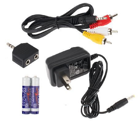 Includes CTFT751tk portable DVD player with AC/DC adapter, A/V cable, audio splitter, two sets of earbuds, remote control with 2 AAA batteries, and a soft carrying case; gift box