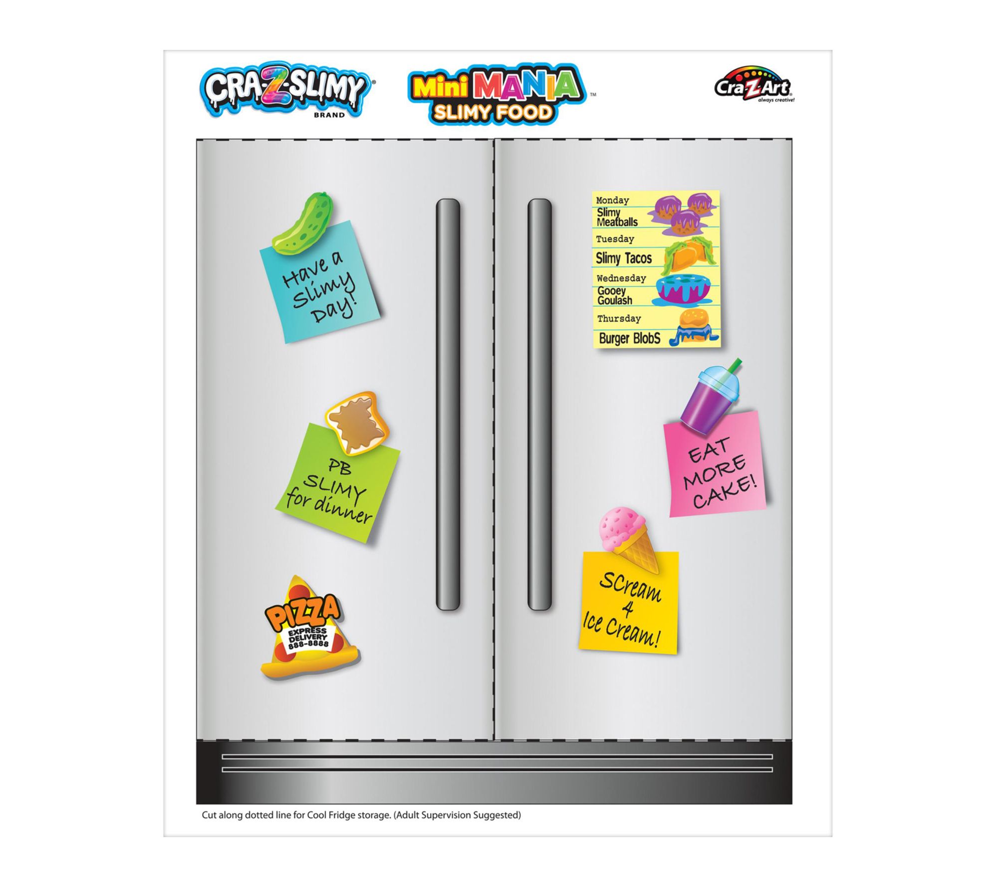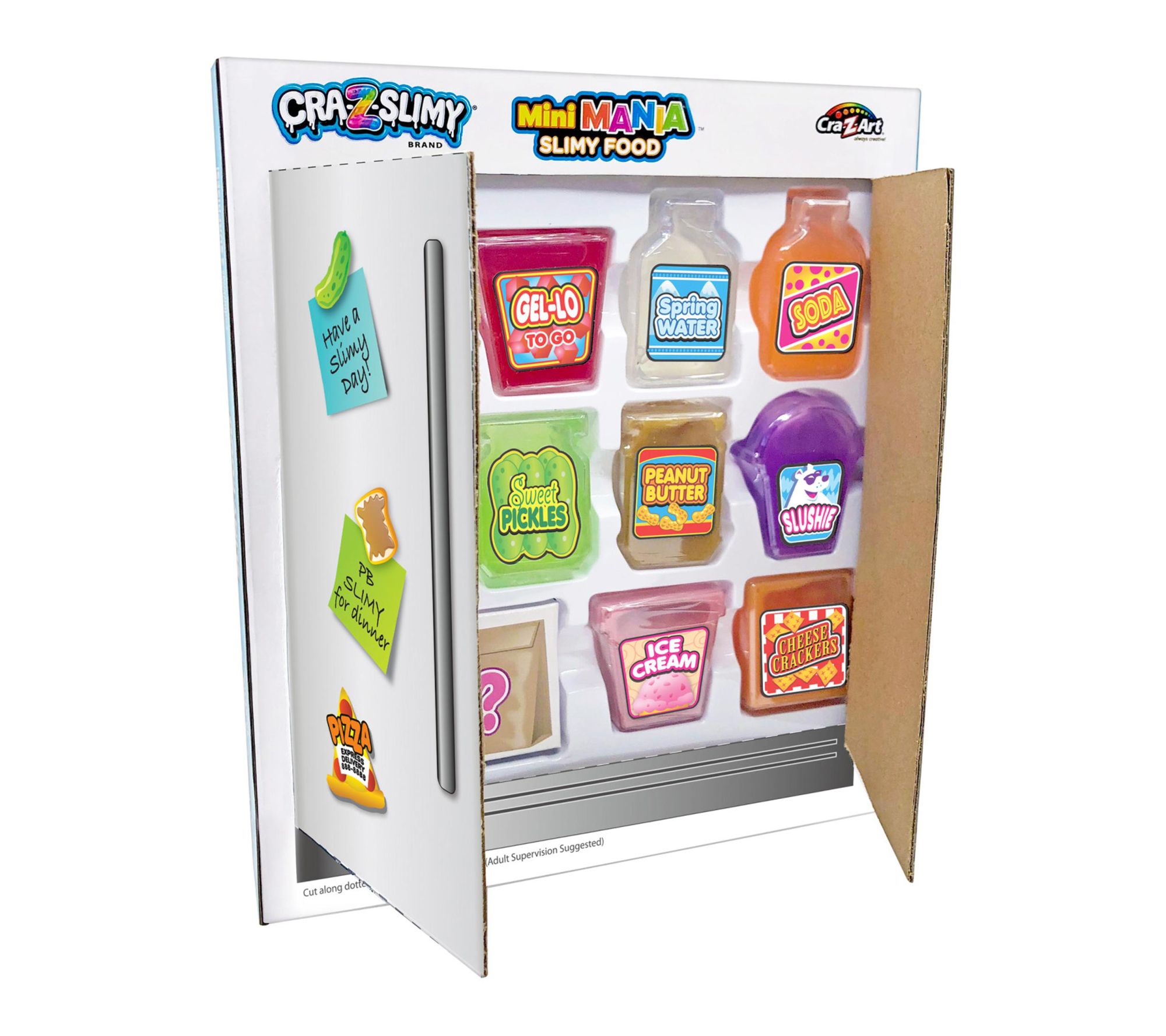 Tiny hands get big smiles with this slimy mini grocery set packed with fun scents and vibrant colors. Each adorable food-shaped container holds a super gooey, scented slime -- just open, squish, stretch, and store for endless creative play. Kids, tweens, and teens will love the surprises waiting inside and the playful option to transform the package into a fridge-themed storage space. From Cra-Z-Slimy.