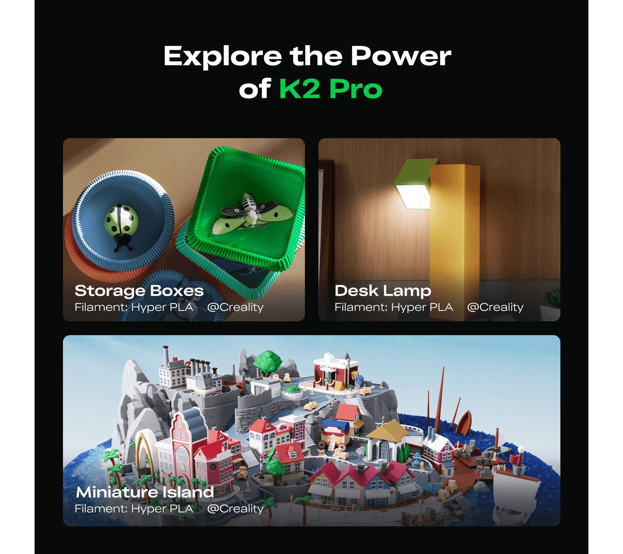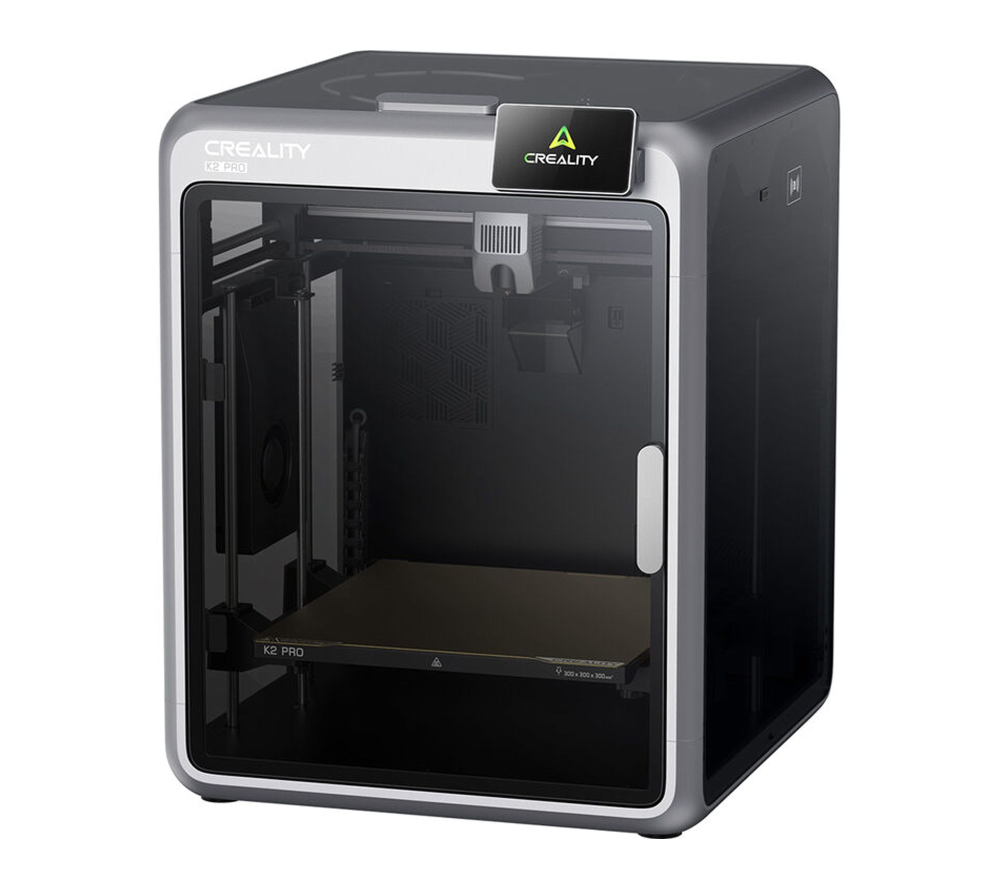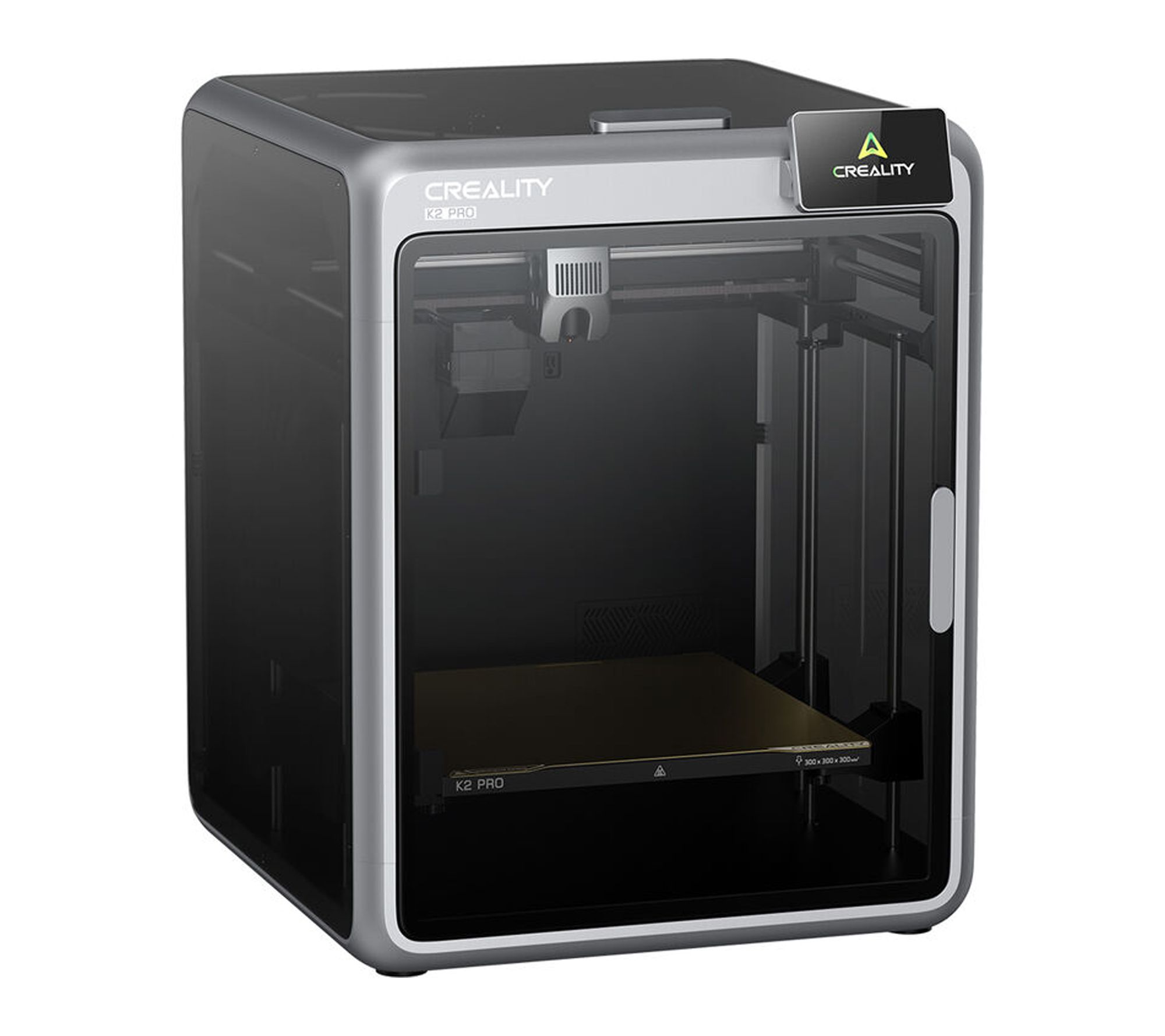Includes K2 Pro enclosed 3D printer, touch screen, screen base, spool holder, filament, PTFE tube, power cable, tool box, and quick guide