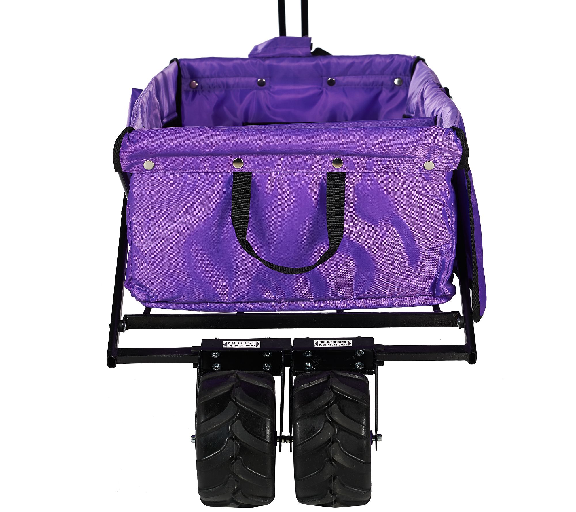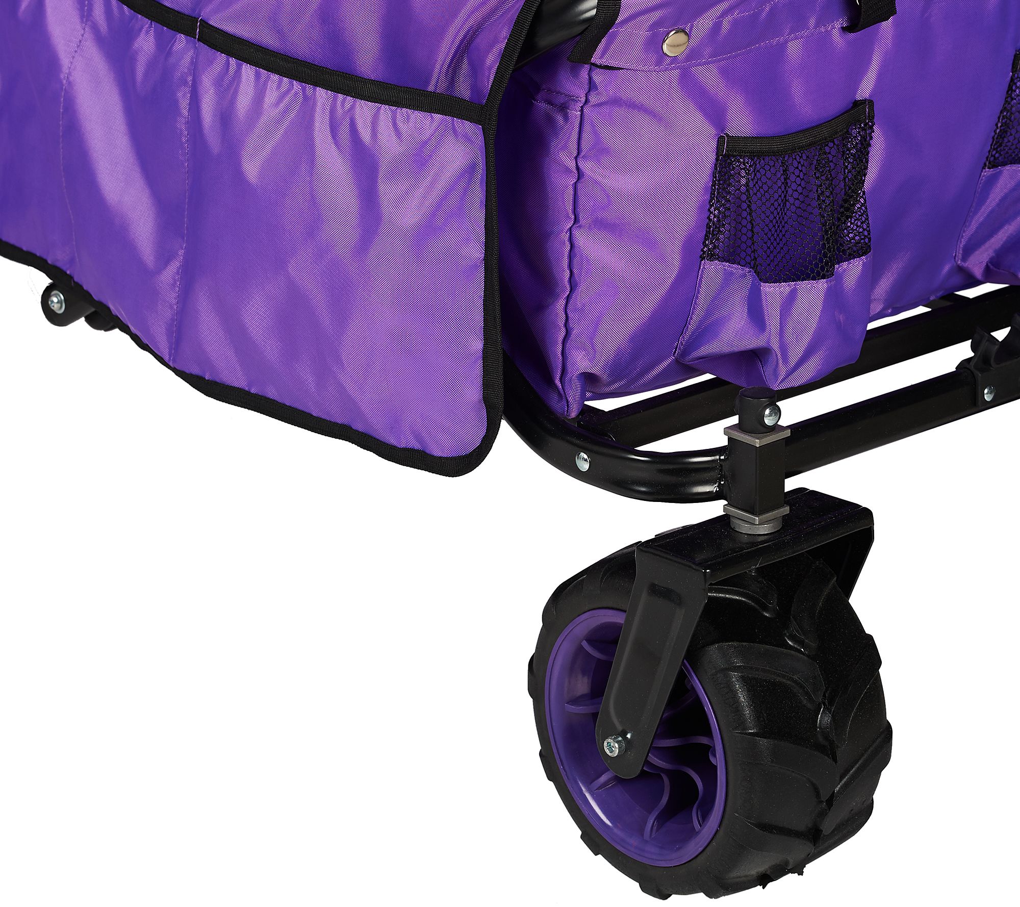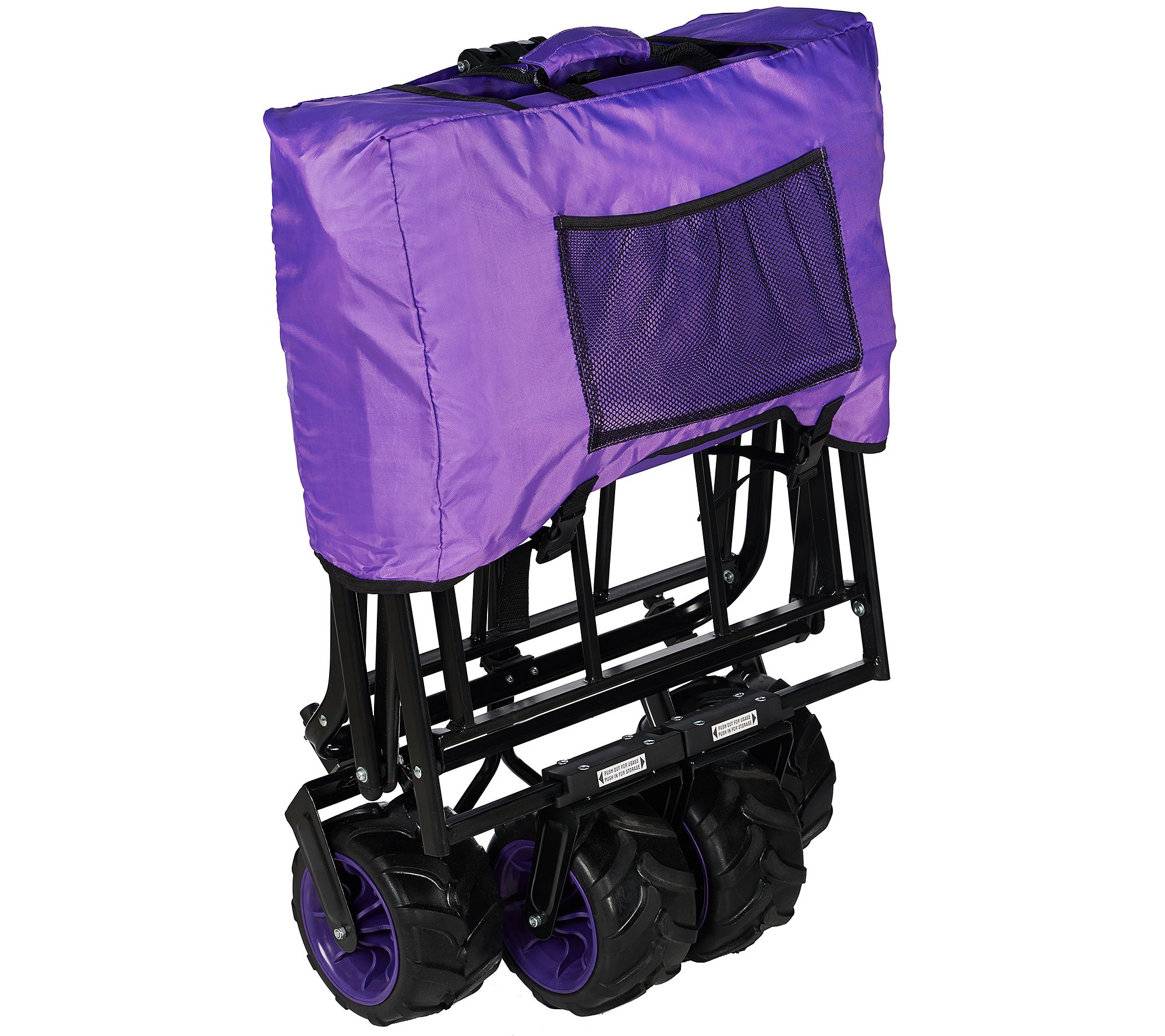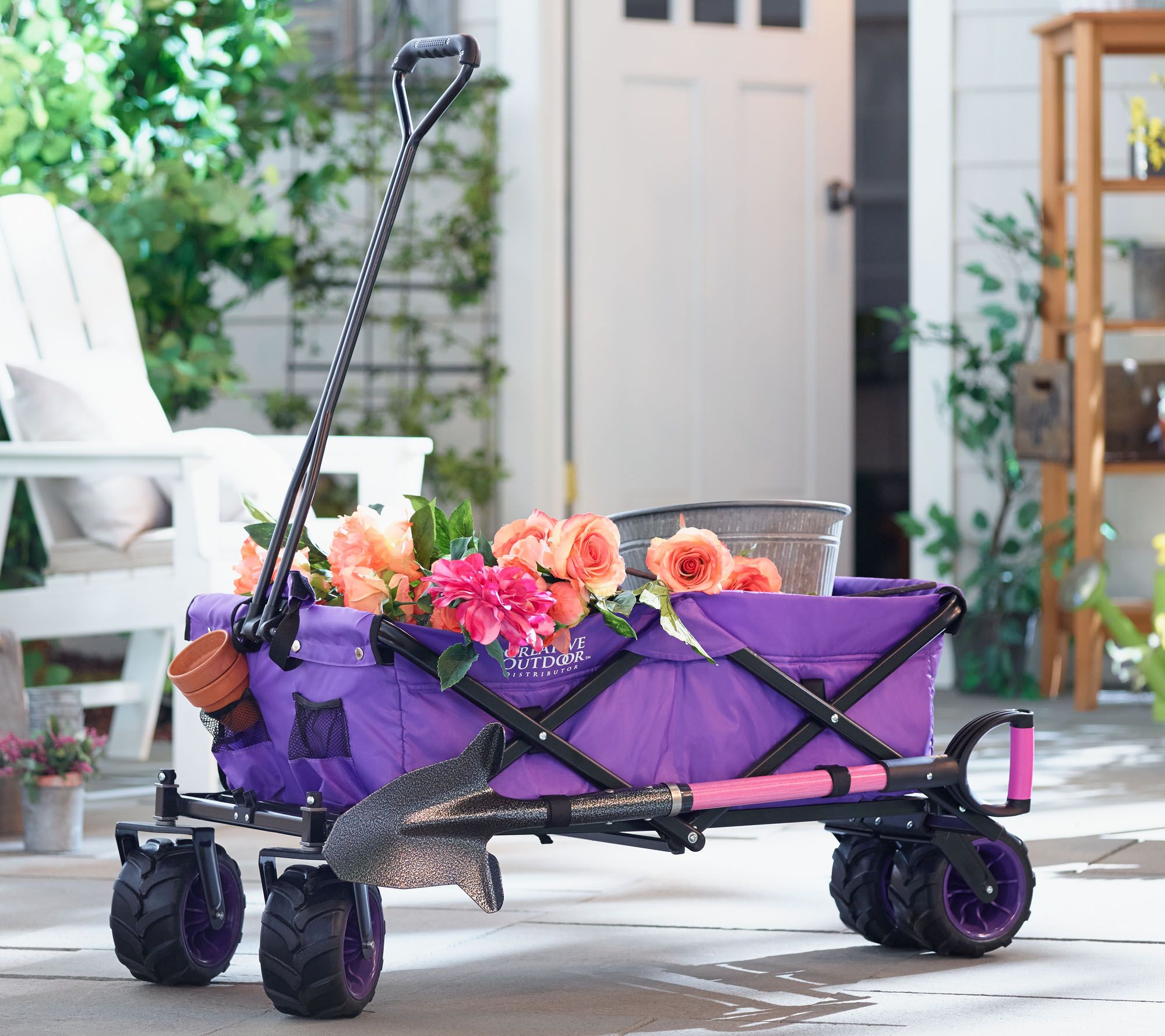 This all-terrain folding wagon by Creative Outdoor goes everywhere you do--to the garden, the tool shed, the grocery store, the kids' soccer games--even the beach--toting all of your essentials in a single trip! The collapsible utility wagon design lightens your load, transporting up to 150 lbs over grass, gravel, sand, unpaved surfaces, and patios with its extra-wide, steerable rubber wheels. A removable divider lets you separate and secure contents, while a long handle in front gives you room to walk comfortably without banging your heels or shins. From Creative Outdoor.