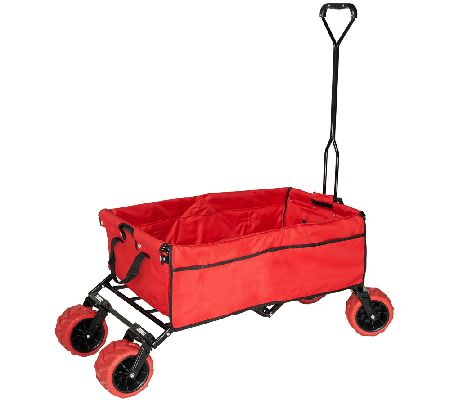 So many ways to use it, only one trip to make! This All-Terrain Folding Wagon goes everywhere you do--to the garden, the tool shed, the grocery store, the kids' games--even the beach--toting all of your essentials in a single trip! Instead of making several time-consuming treks back and forth, this collapsible utility wagon lightens your load, transporting up to 150 lbs over grass, gravel, sand, unpaved surfaces, and patios with its extra wide, steerable wheels. A long handle in front gives you room to walk comfortably without banging your feet or shins. And when you're finished, just fold it up and put it in the garage, the trunk, or the shed for easy storage.