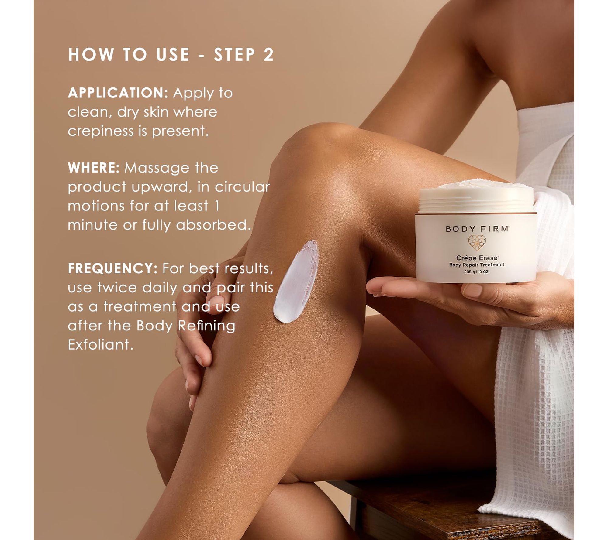 How do I use it: Apply pre-treatment to moist skin in the shower or bath. Gently massage in circular motions. Rinse and pat dry. Apply repair treatment liberally to clean, dry skin where crepey skin is present. Massage in upward, gentle circular motion for one minute or until fully absorbed. Use twice daily.
