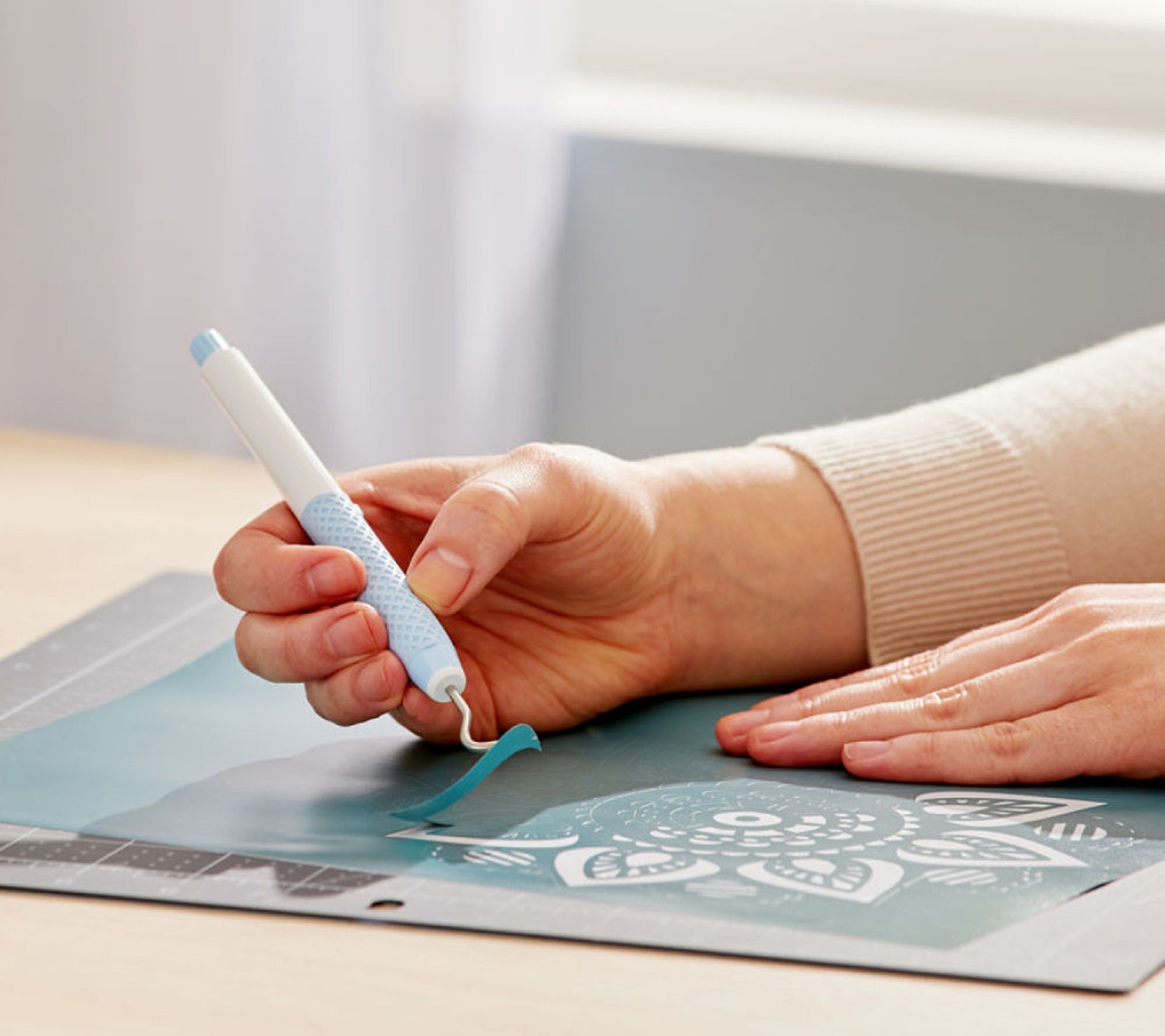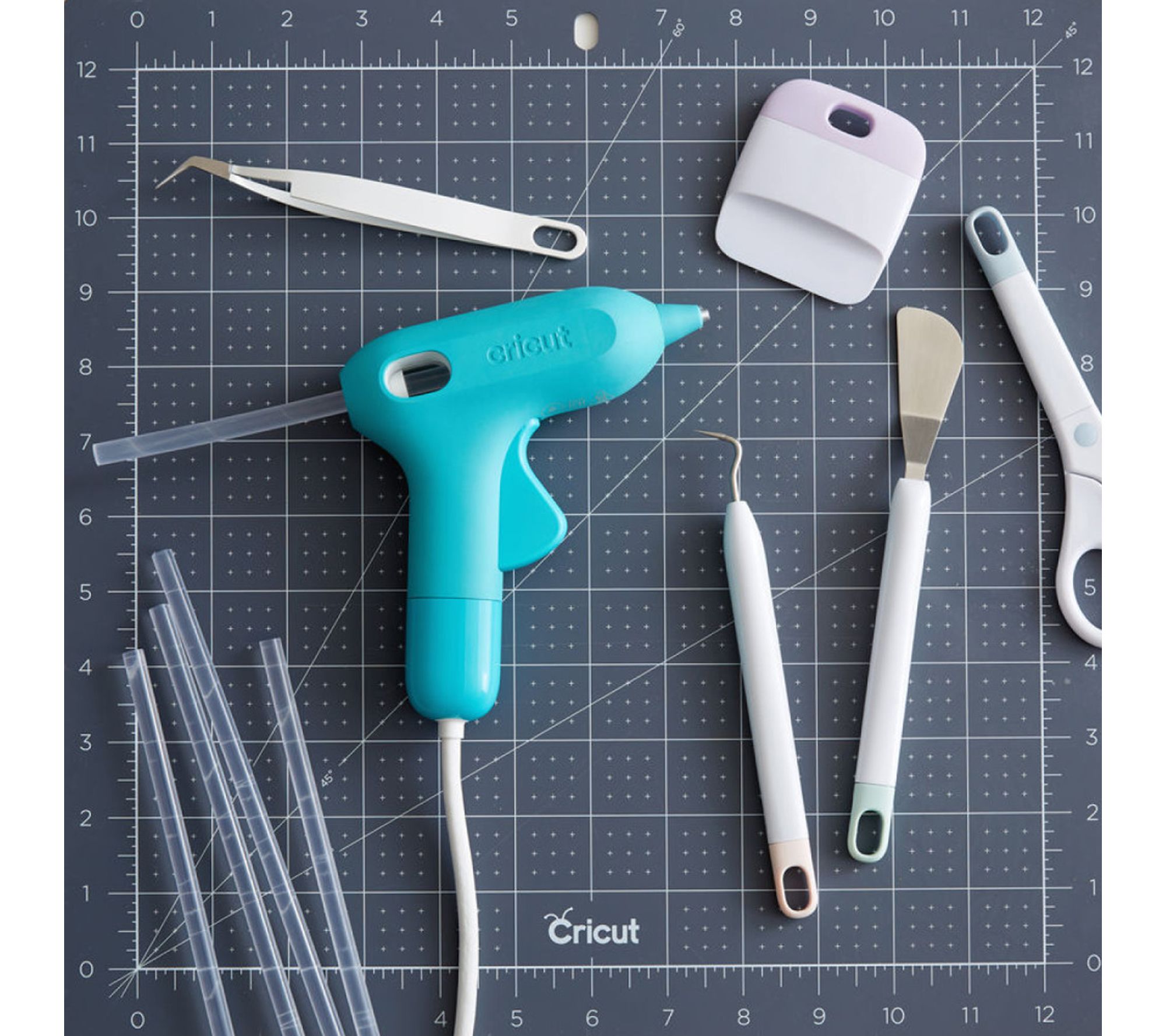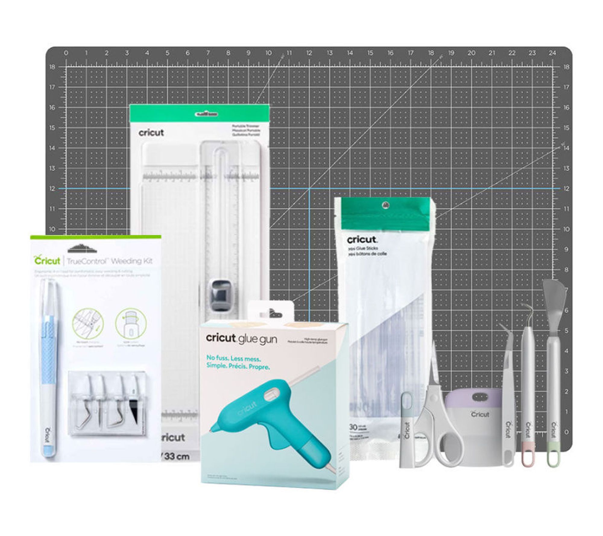 • Includes Cricut Glue Gun, Mini Glue Sticks (30 count), Portable Trimmer, TrueControl Weeding Kit in Blue, Basic Tools Set, Self-Healing Mat