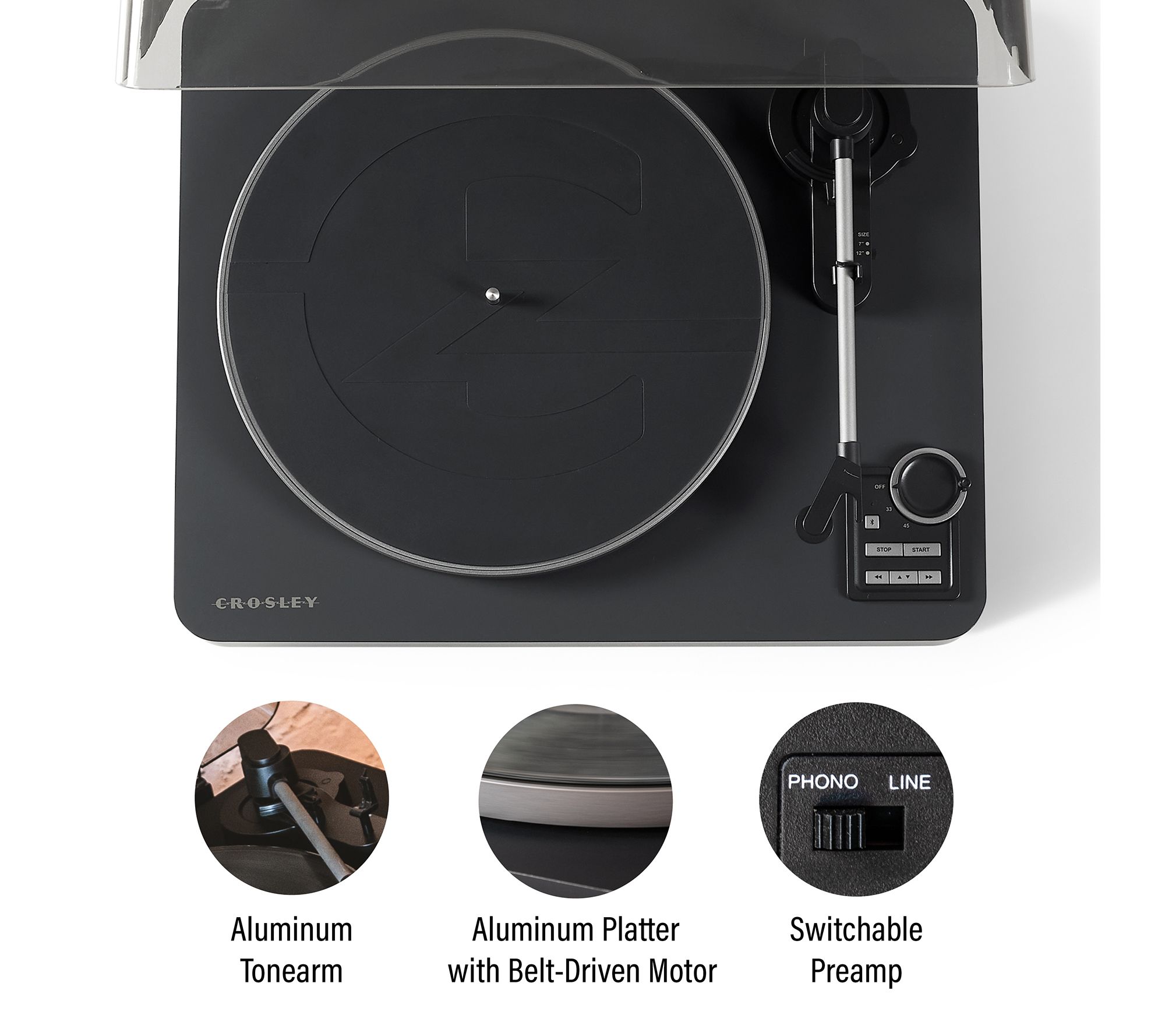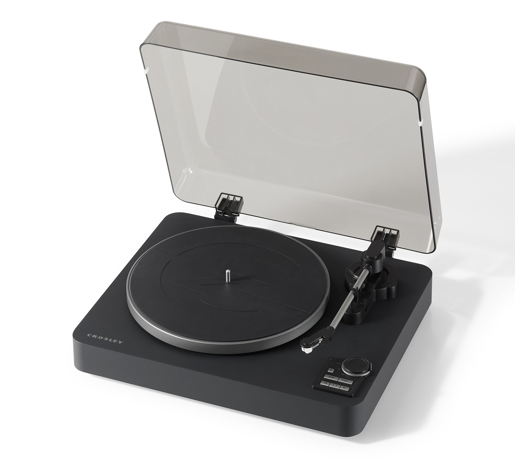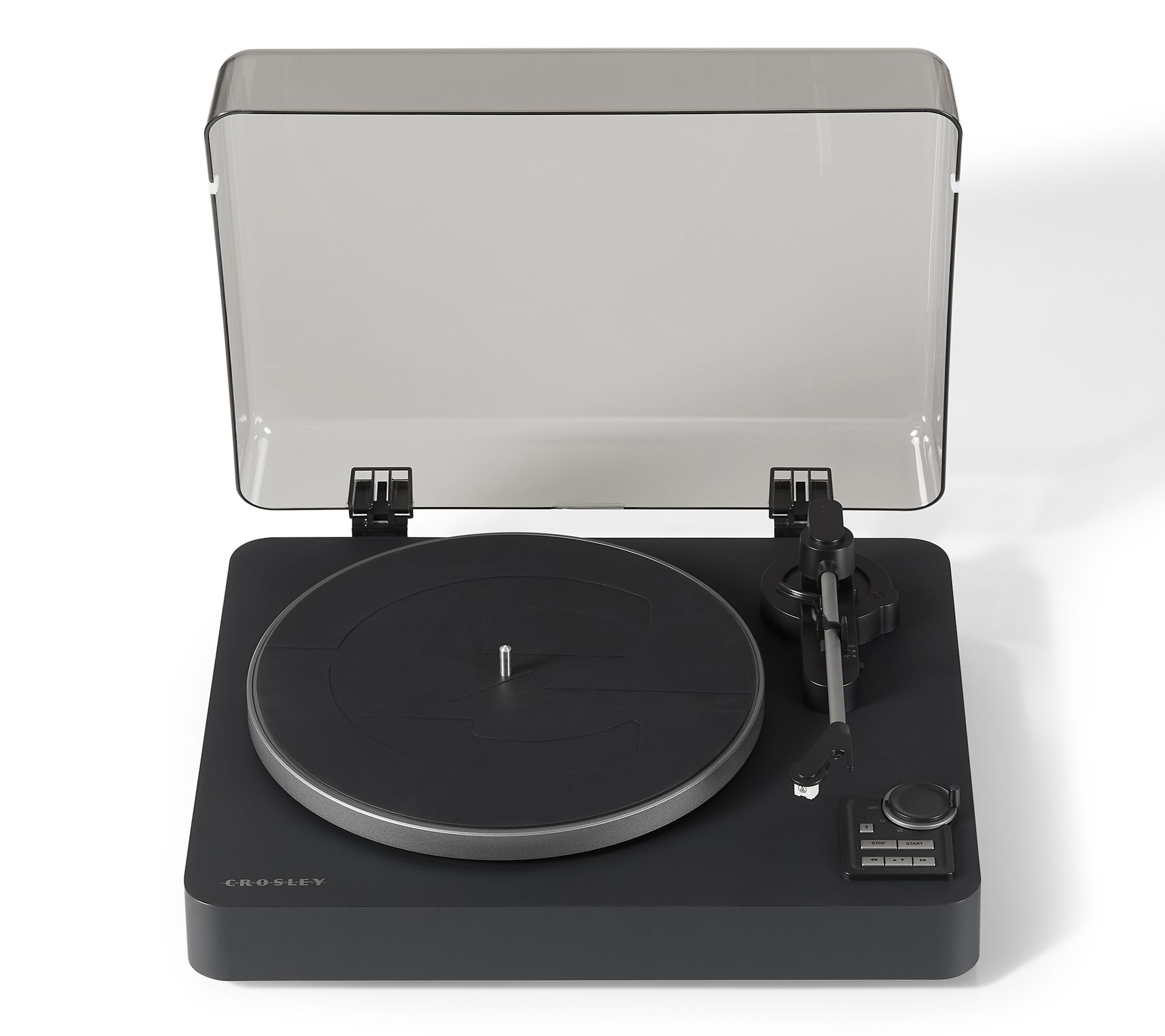 Let the Crosley C300 fully automatic turntable handle all the details, so you can focus on the music. With a press of a button, the Audio-Technica needle drops perfectly on the first track every time, and returns to its cradle when the record is over. Bluetooth pairing lets you stream wirelessly to speakers or headphones, while the soft-touch finish and modern curves bring a premium look and feel to any room. From Crosley.