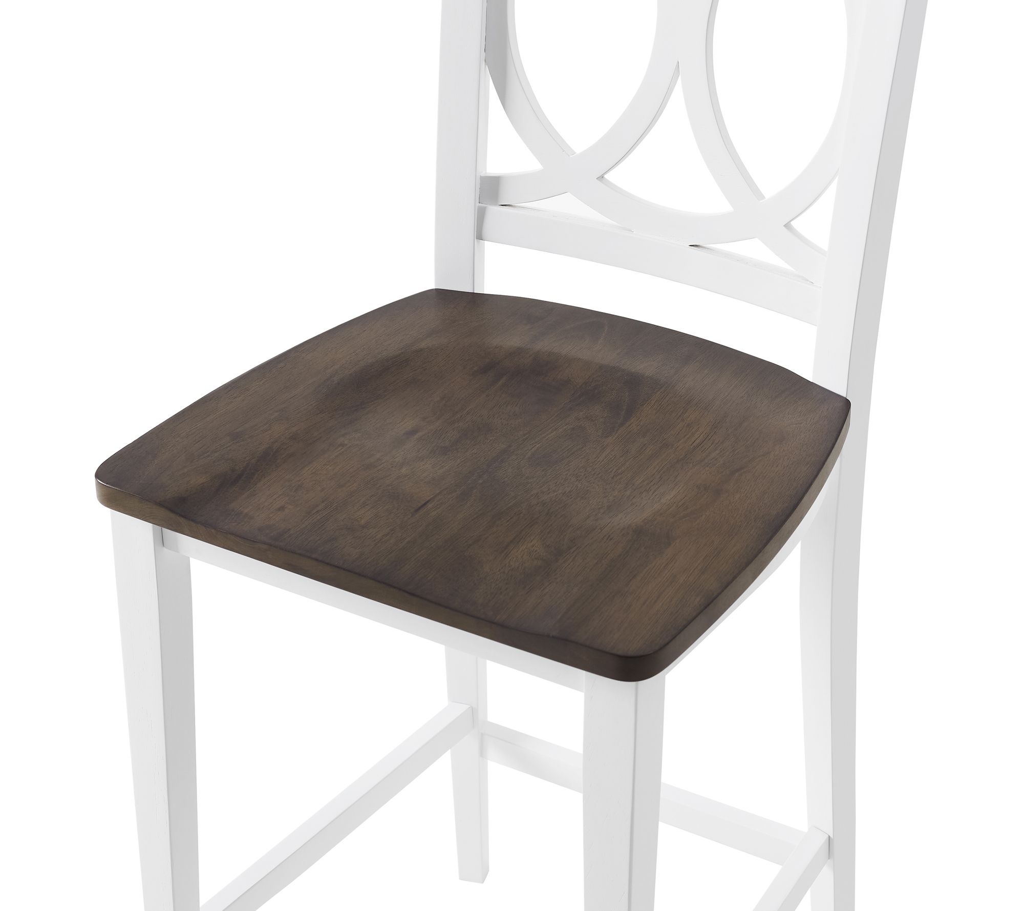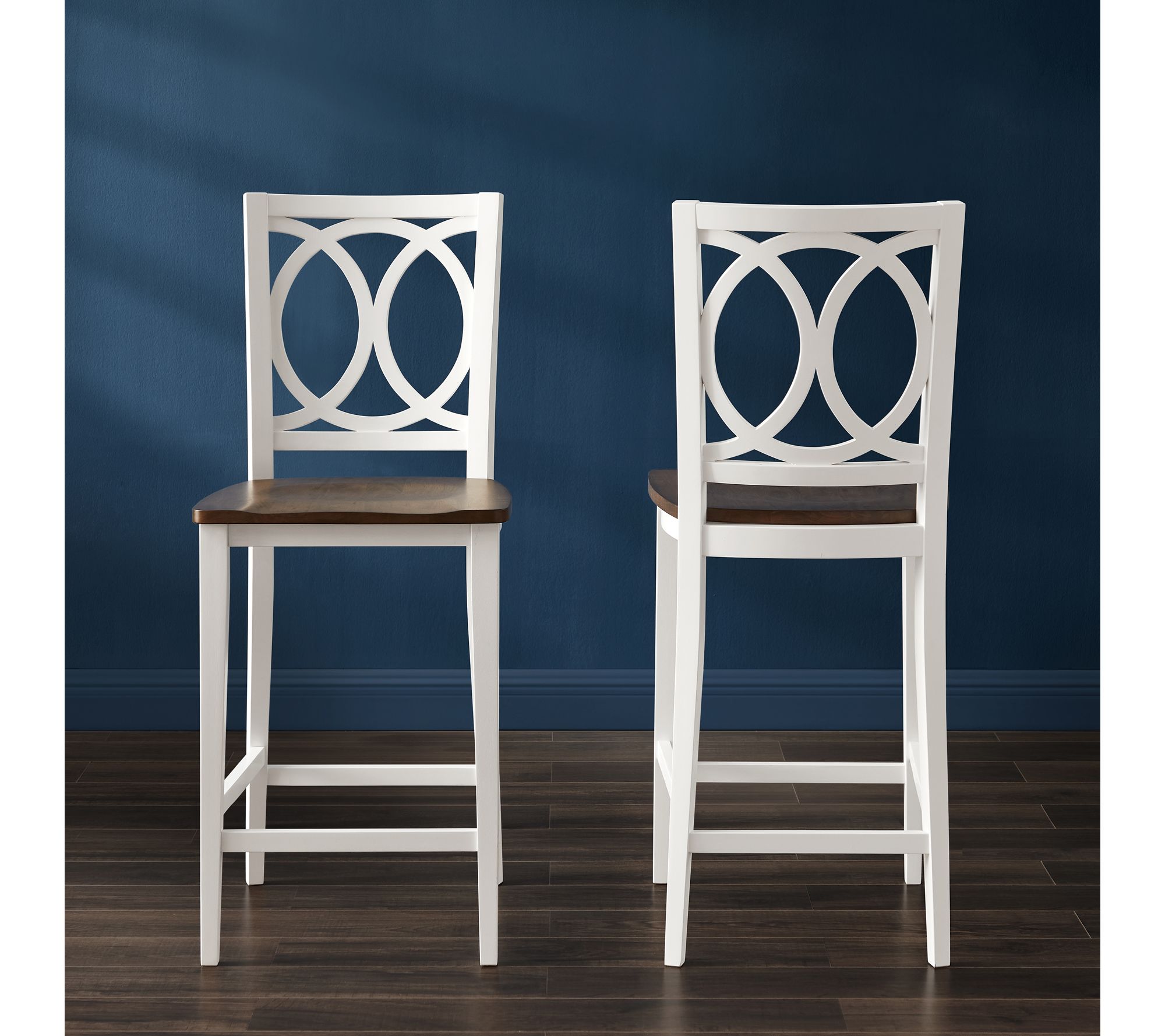 Add the Crosley Charlotte 2-Piece Counter Stool Set to your kitchen or dining room for classic seating. These counter height bar stools feature contoured wood seats and interlocking circle designs on the backs. From Crosley.