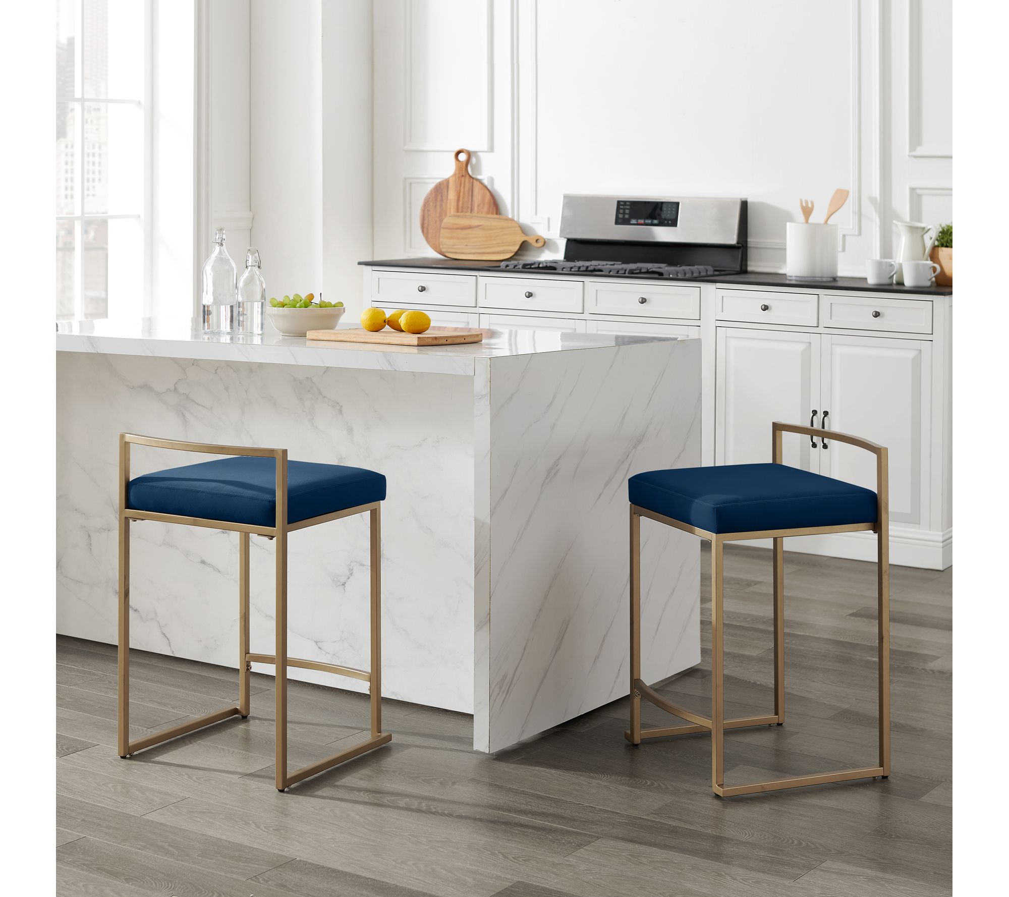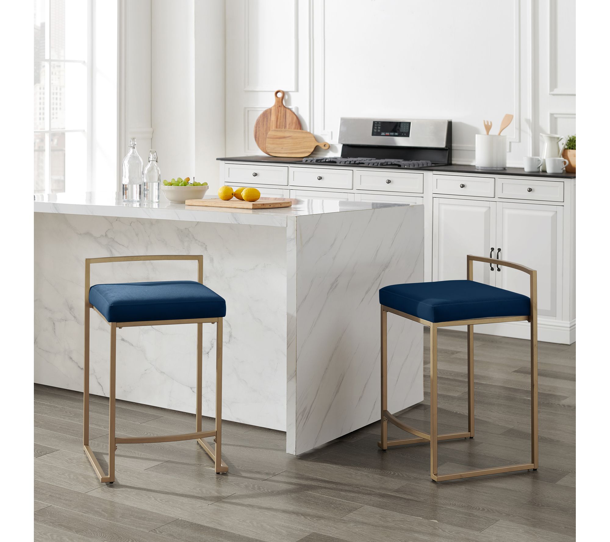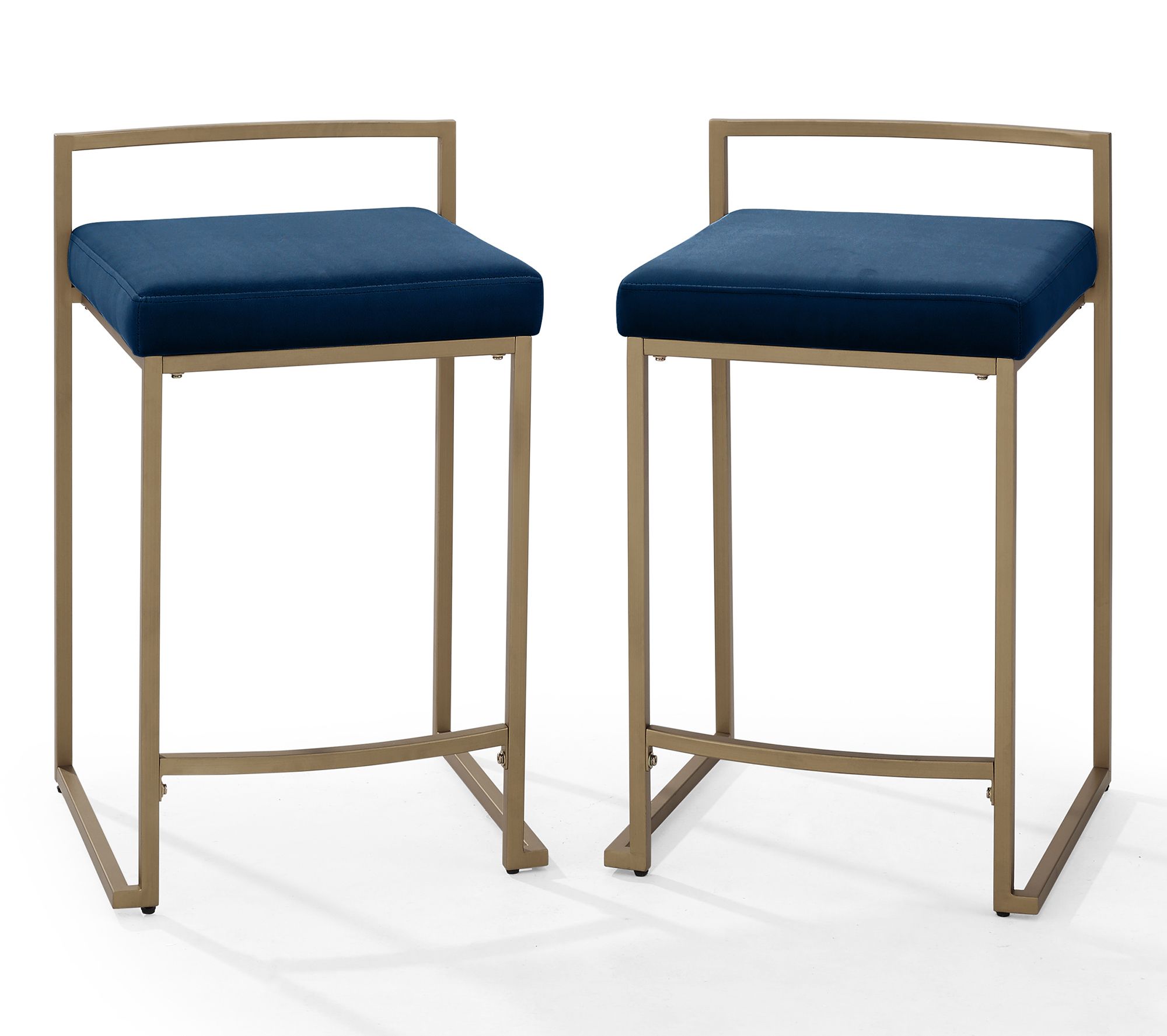 Add a touch of luxury and modern flair to your kitchen island or counter-height table with the Crosley Harlowe 2-piece Counter Height Bar Stool Set. Featuring a sleek modern base with a soft gold finish, these navy velvet-upholstered stools offer both style and comfort. From Crosley.