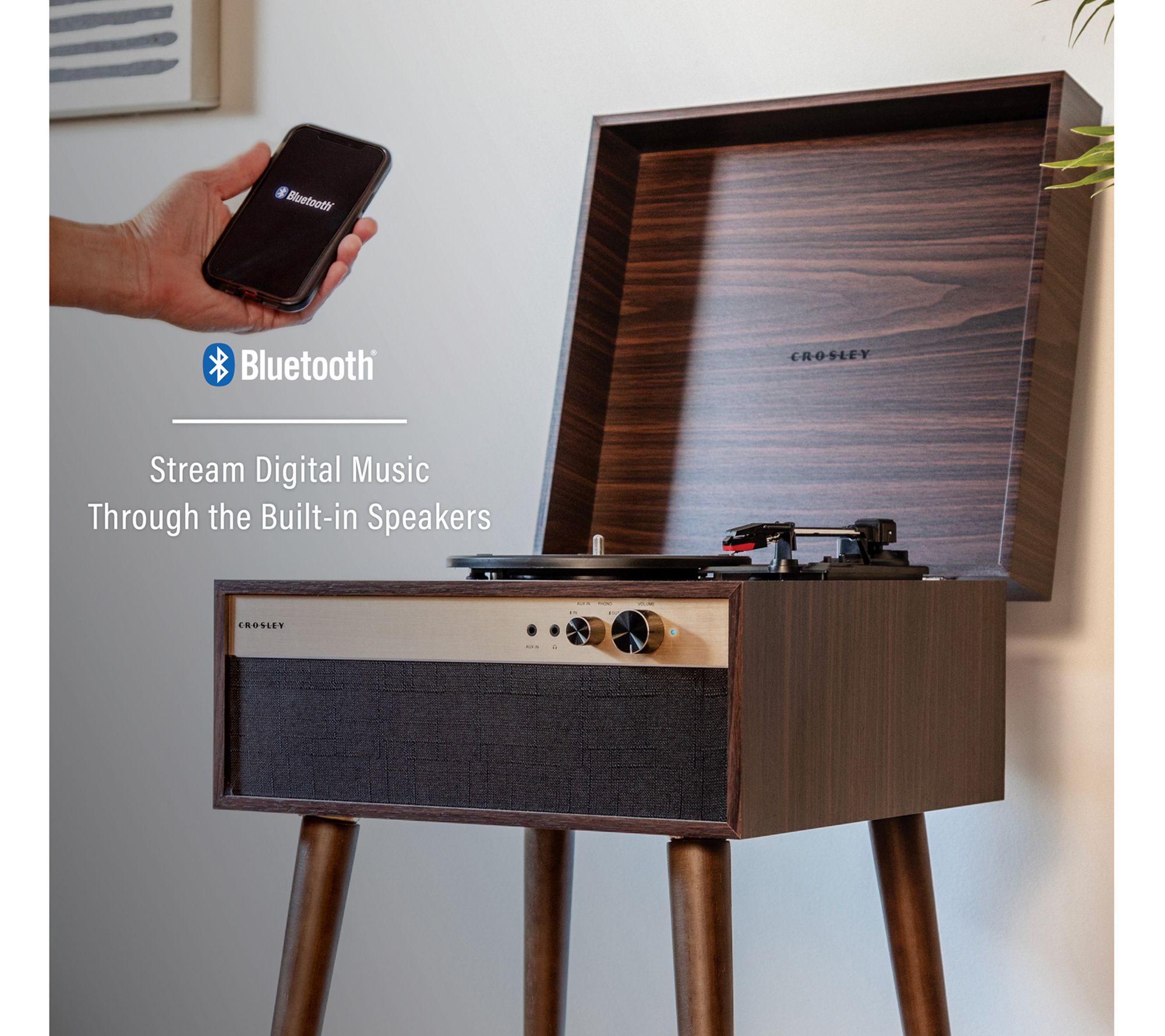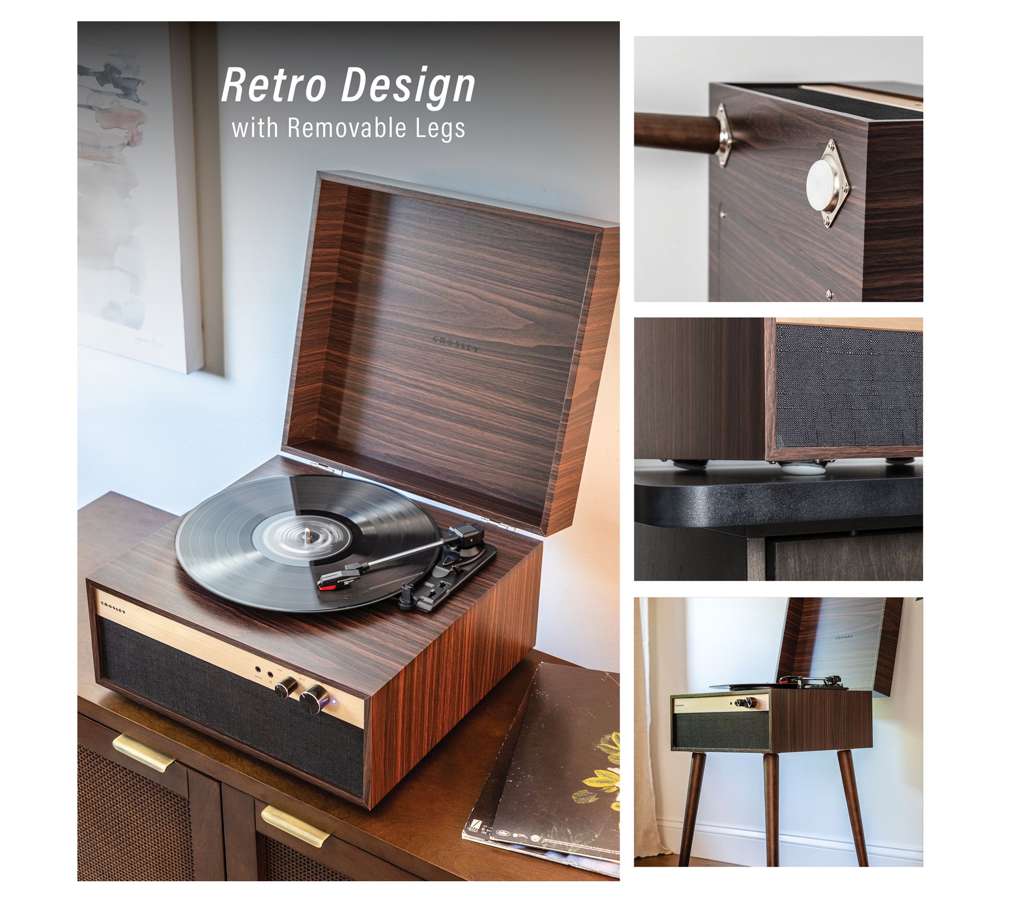 Whether you're displaying it without legs for a minimalist vibe or attaching the sleek tapered legs for a classic mid-century look, the Jasper record player makes a statement in any room. With modern features like a three-speed turntable, built-in Bluetooth receiver, headphone jack, and aux input, it's both stylish and functional. The rich walnut finish with goldtone accents packs a punch of retro charm. From Crosley Radio.