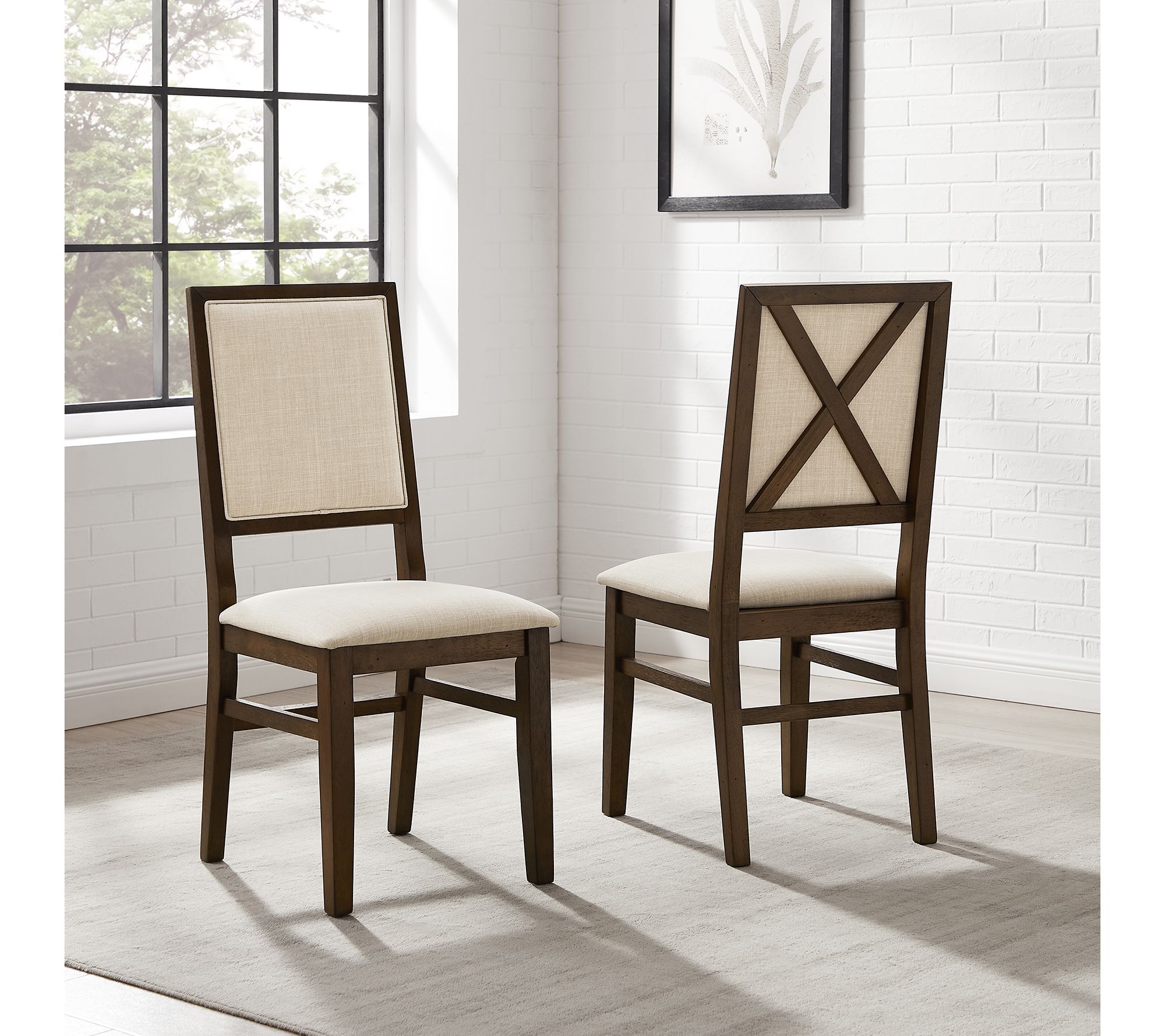 Bring farmhouse charm to your dining area with the Joanna two-piece upholstered dining chair set. Featuring a rustic modern farmhouse design and dark oak finish, these chairs are perfect for various dining settings. The comfortable upholstered back and seat, combined with a unique wooden X design on the back, add character and style. From Crosley.