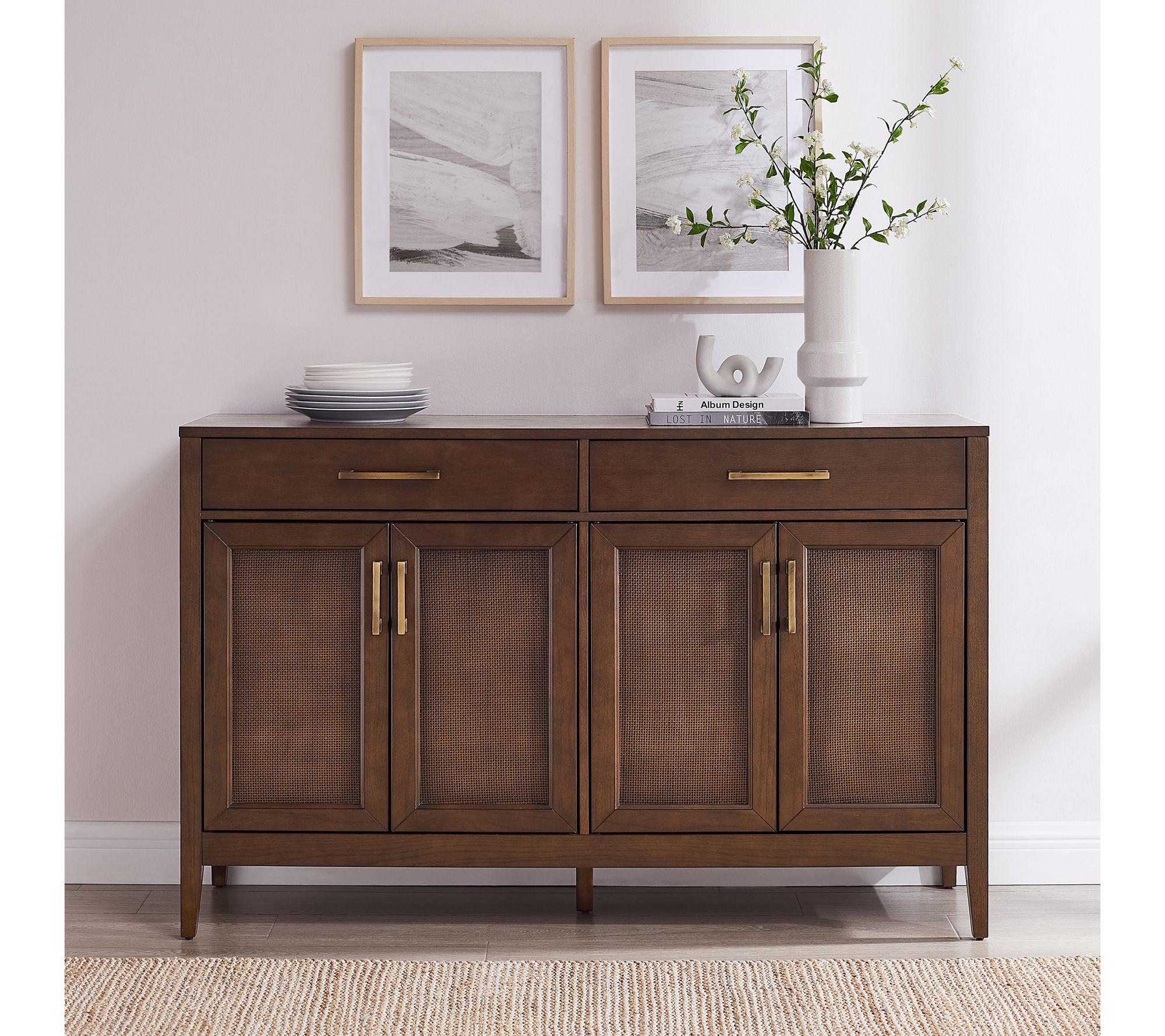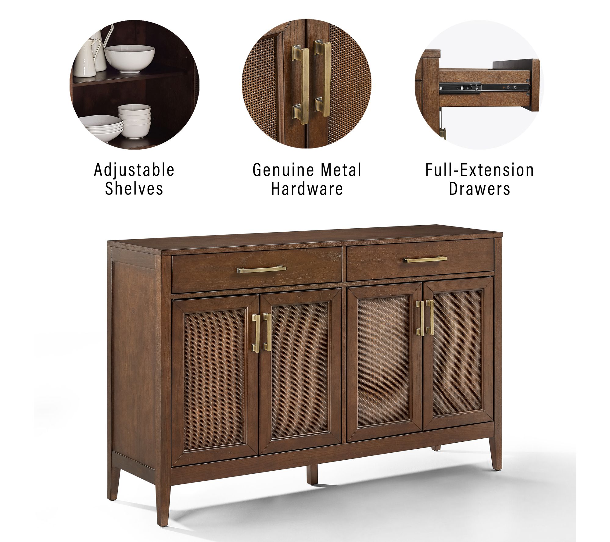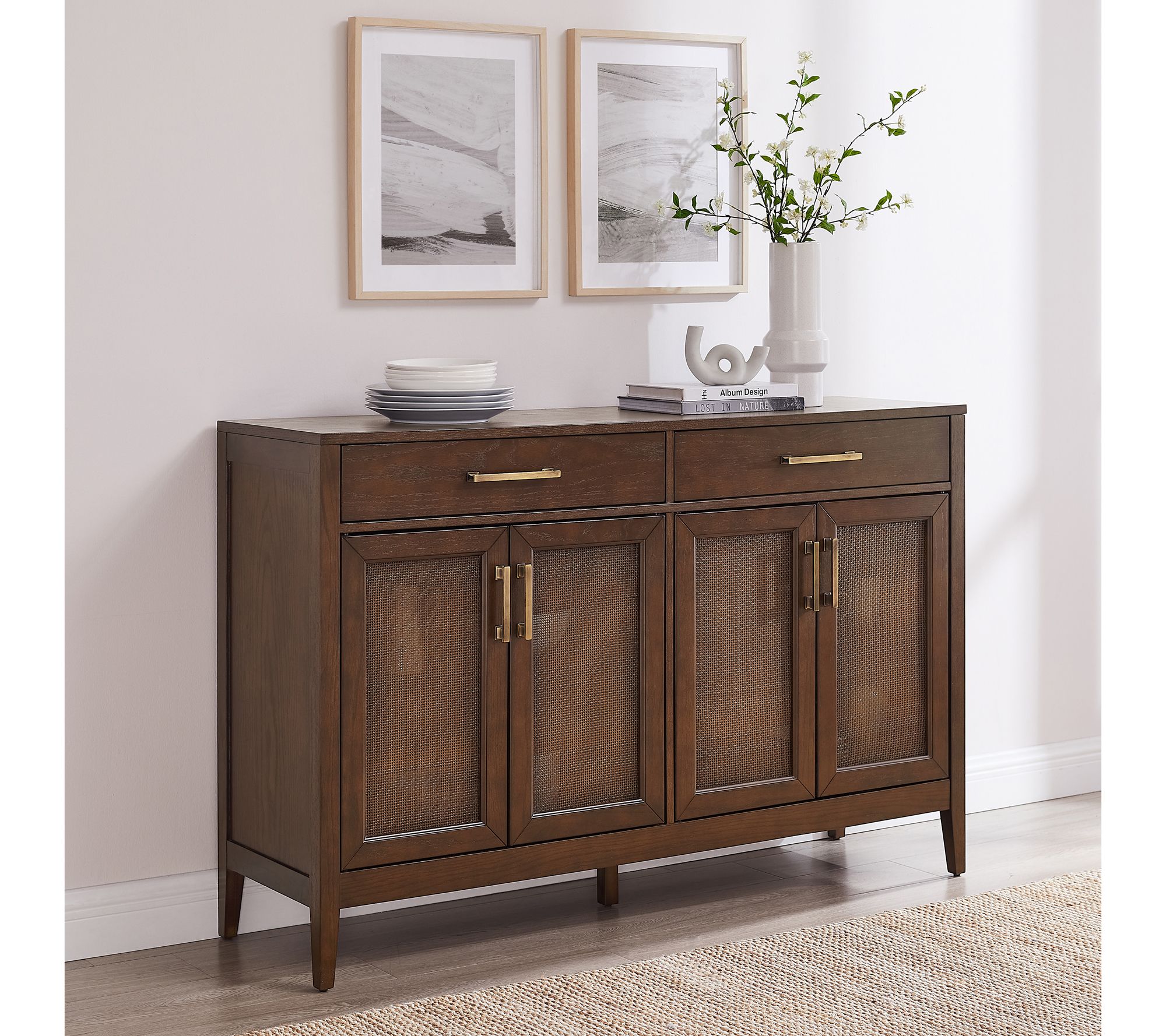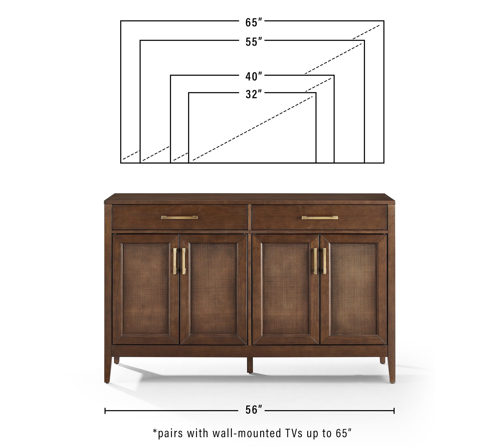 Whether you're entertaining guests or enjoying a quiet evening at home, the Crosley Milo sideboard is the versatile addition your home needs. With its modern design and distinctive poly-rattan mesh cabinet doors, this sideboard can serve as a bar cabinet, coffee bar, or even a TV stand for a 65" TV. From Crosley.