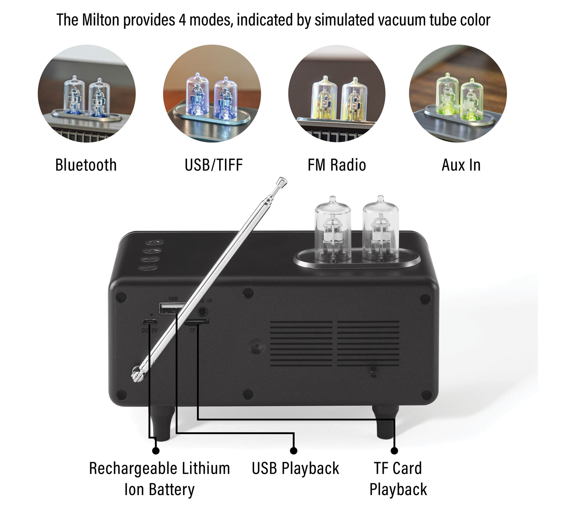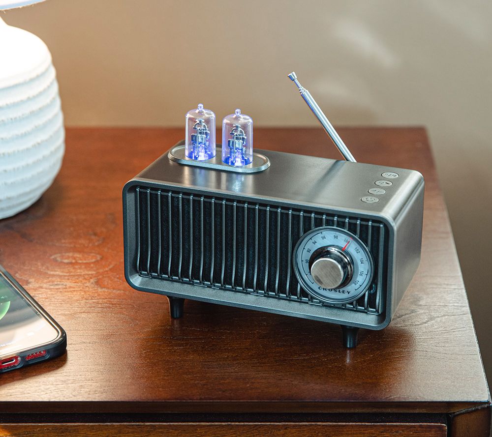 Step back in time with the Crosley Milton, a radio that combines vintage-style charm with modern functionality. Its simulated vacuum tubes glow in different colors to indicate the mode, adding a nostalgic touch while you enjoy FM radio, USB playback, or stream your favorite tunes via Bluetooth wireless technology. From Crosley.