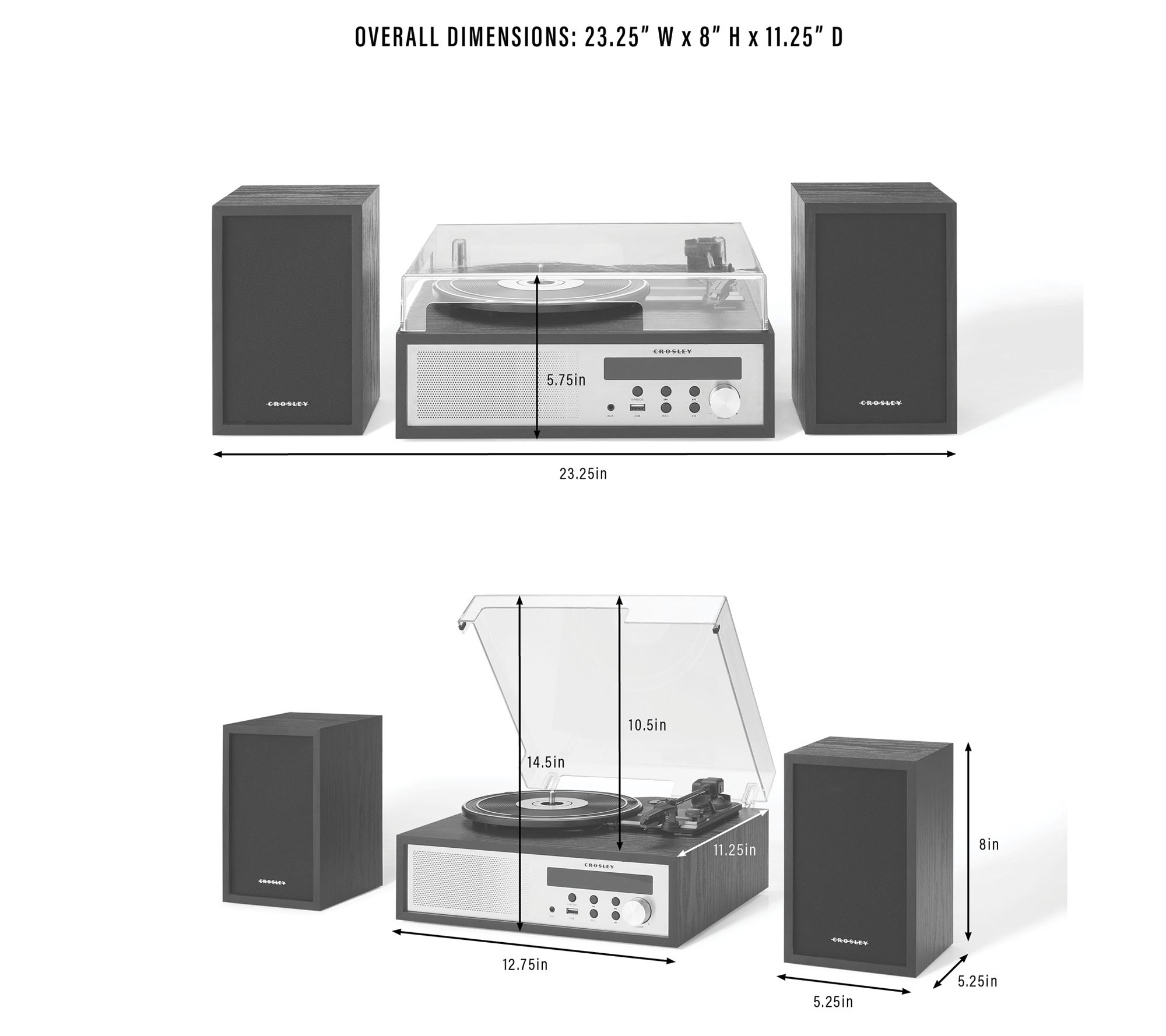 Approximate measurements: Turntable 12.75"W x 5.75"H x 11.25"D; Speakers 5.25"W x 8"H x 5.25"D, weighs 9.12 lbs; Cord 4.92'L
