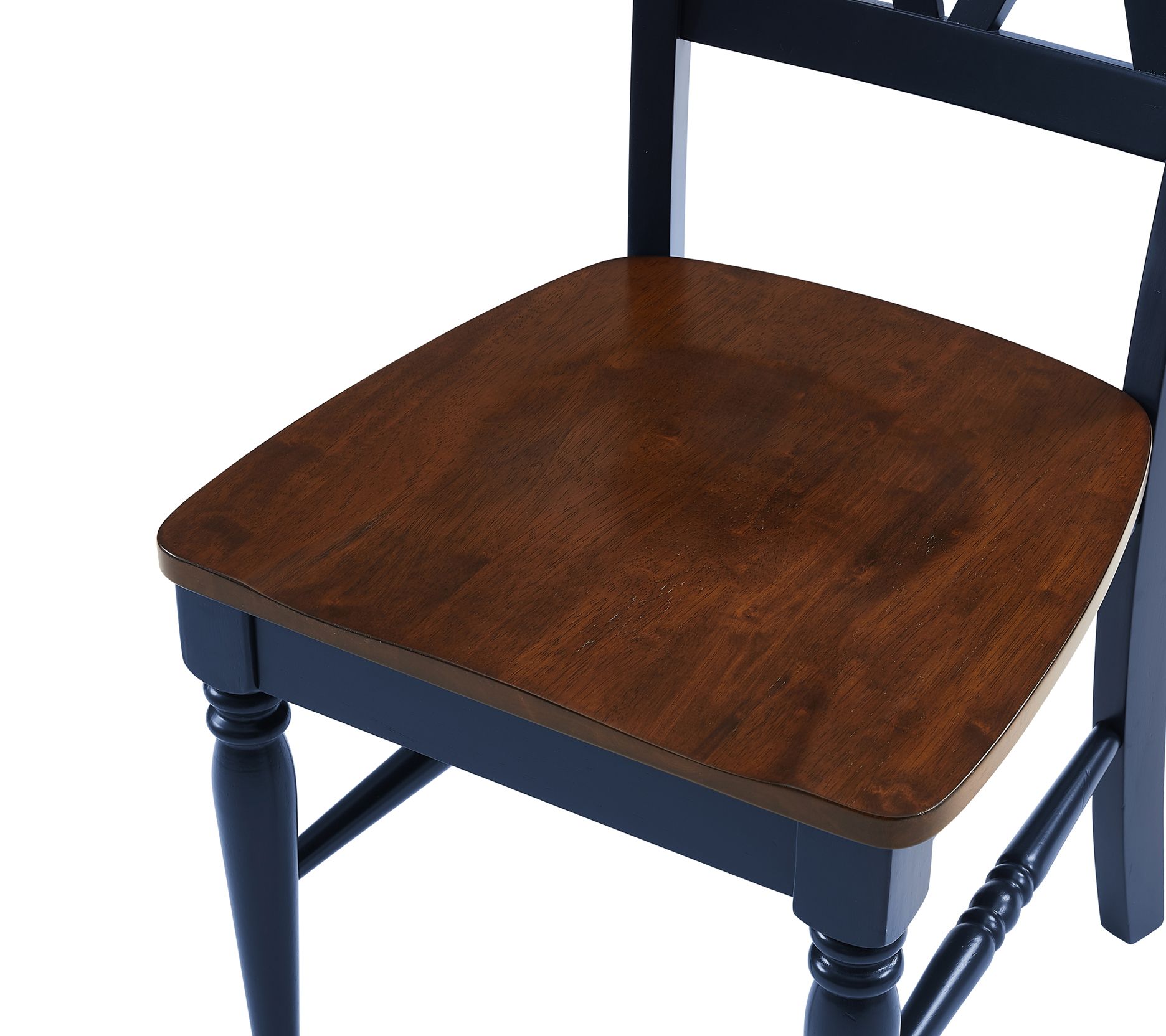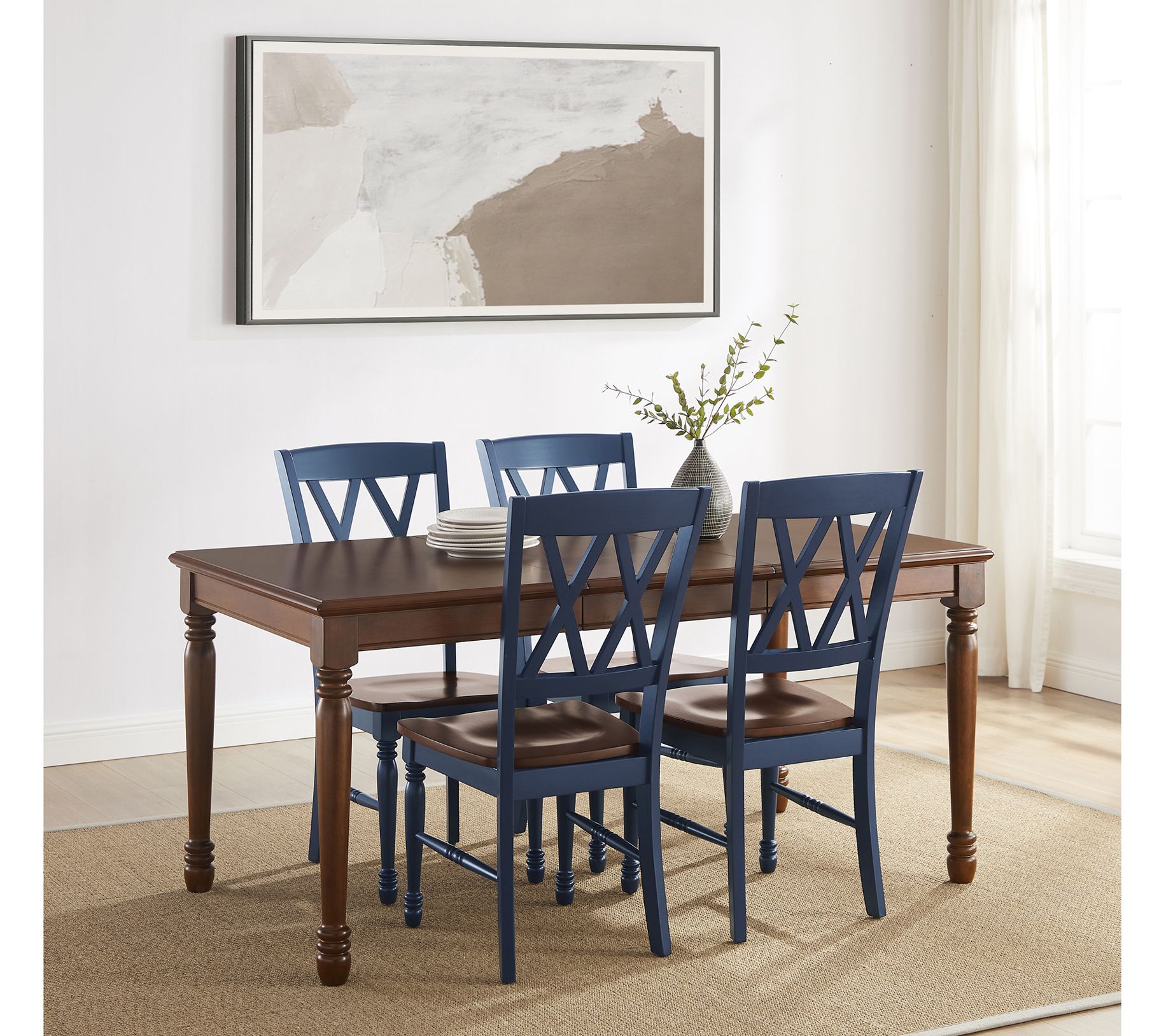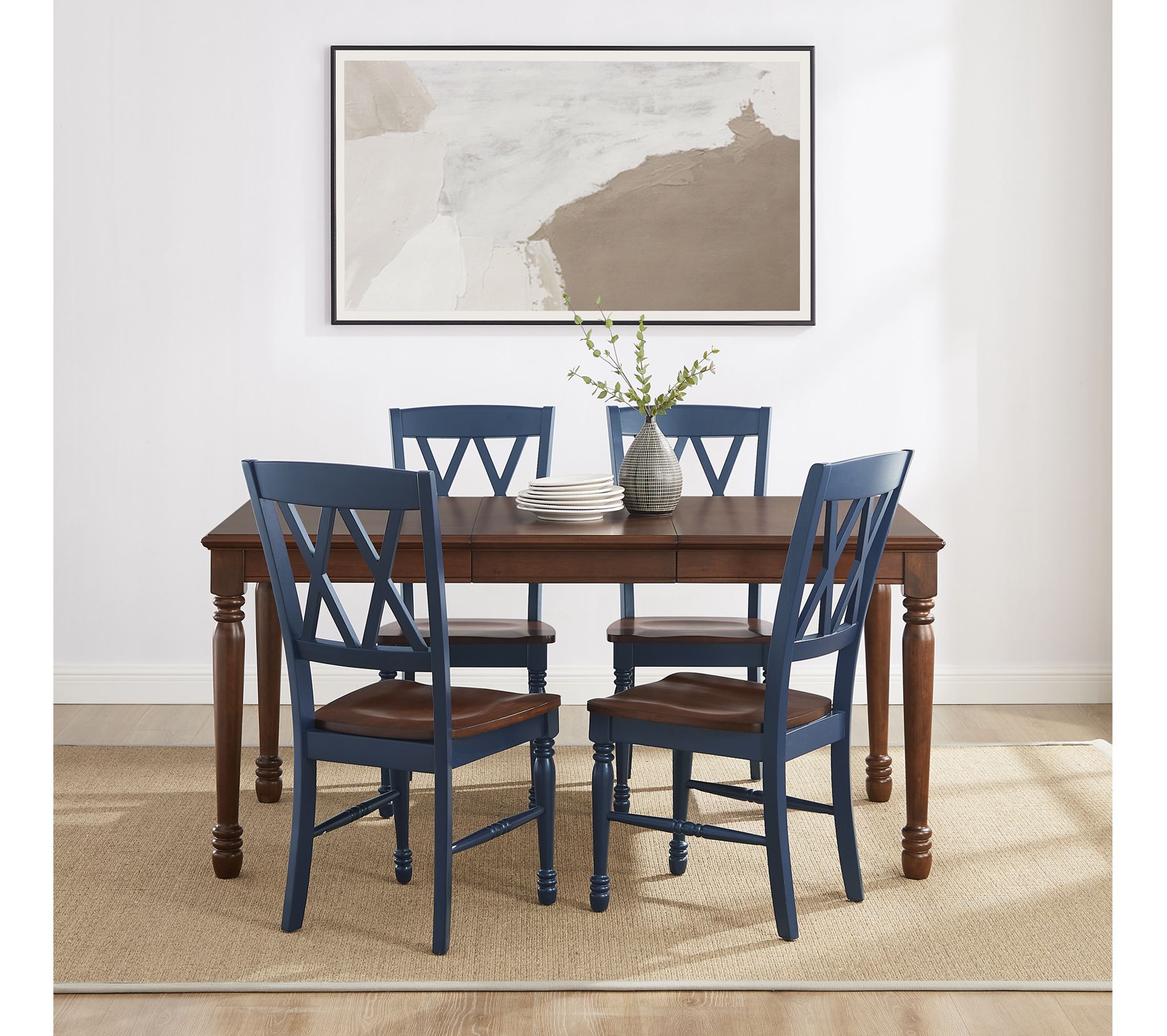 Transform your dining space with the Crosley Shelby navy blue 5-piece dining table set. Featuring an 18" drop leaf and classic turned legs, this set expands to accommodate up to four diners, perfect for family meals. The open double x-back dining chairs add a touch of elegance and comfort. From Crosley.