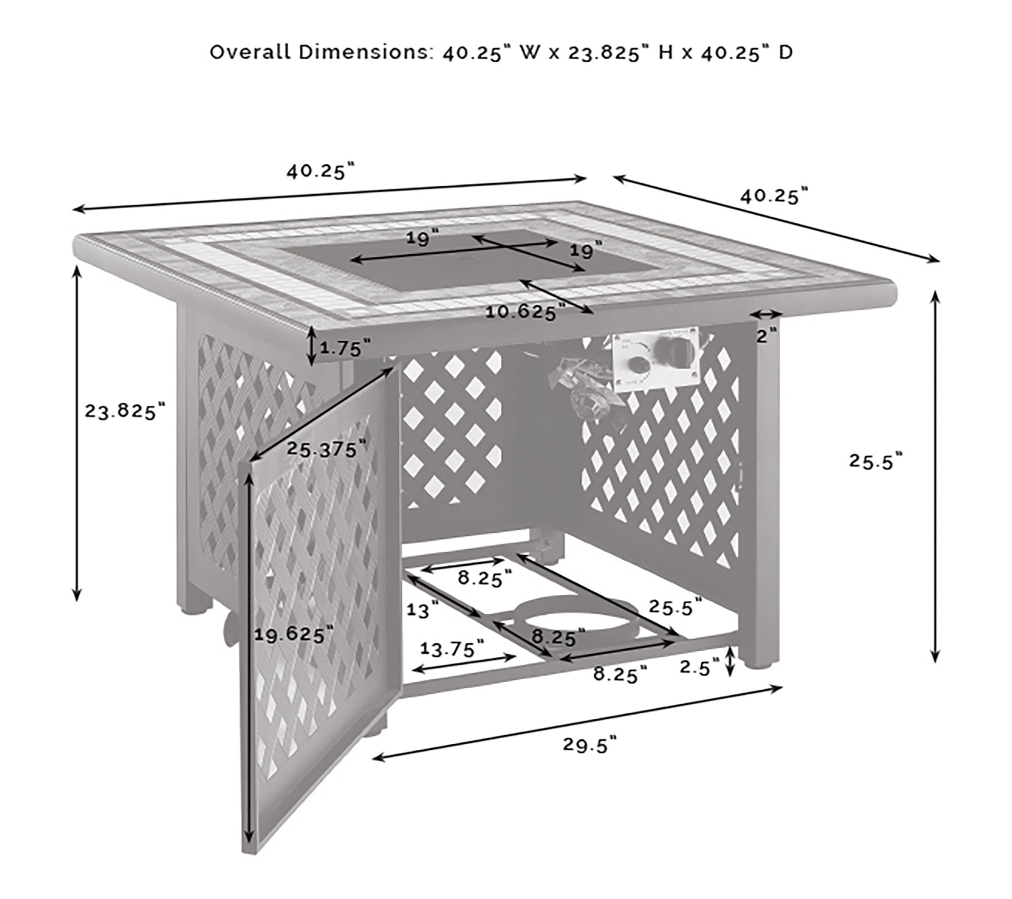 • Measures approximately 40.25" x 40.25" x 25.5"