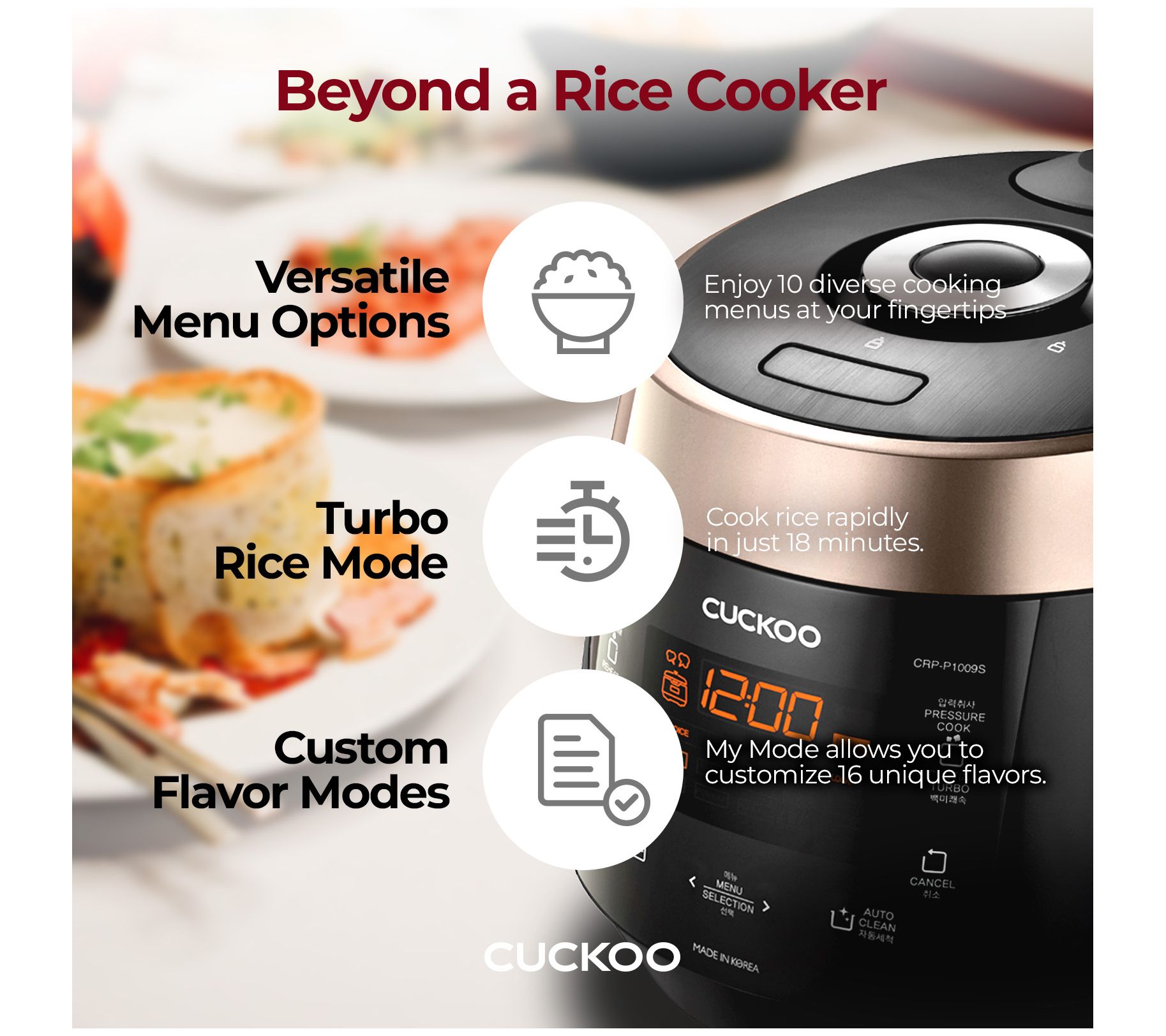 Easily make gourmet dishes at the touch of a button with the CUCKOO rice cooker, featuring smart technology and voice navigation. Serve delicious meals with convenience and precision using its customizable menu options and reheat and keep-warm functions. It's perfect for effortless meal preparation any night of the week. From CUCKOO.