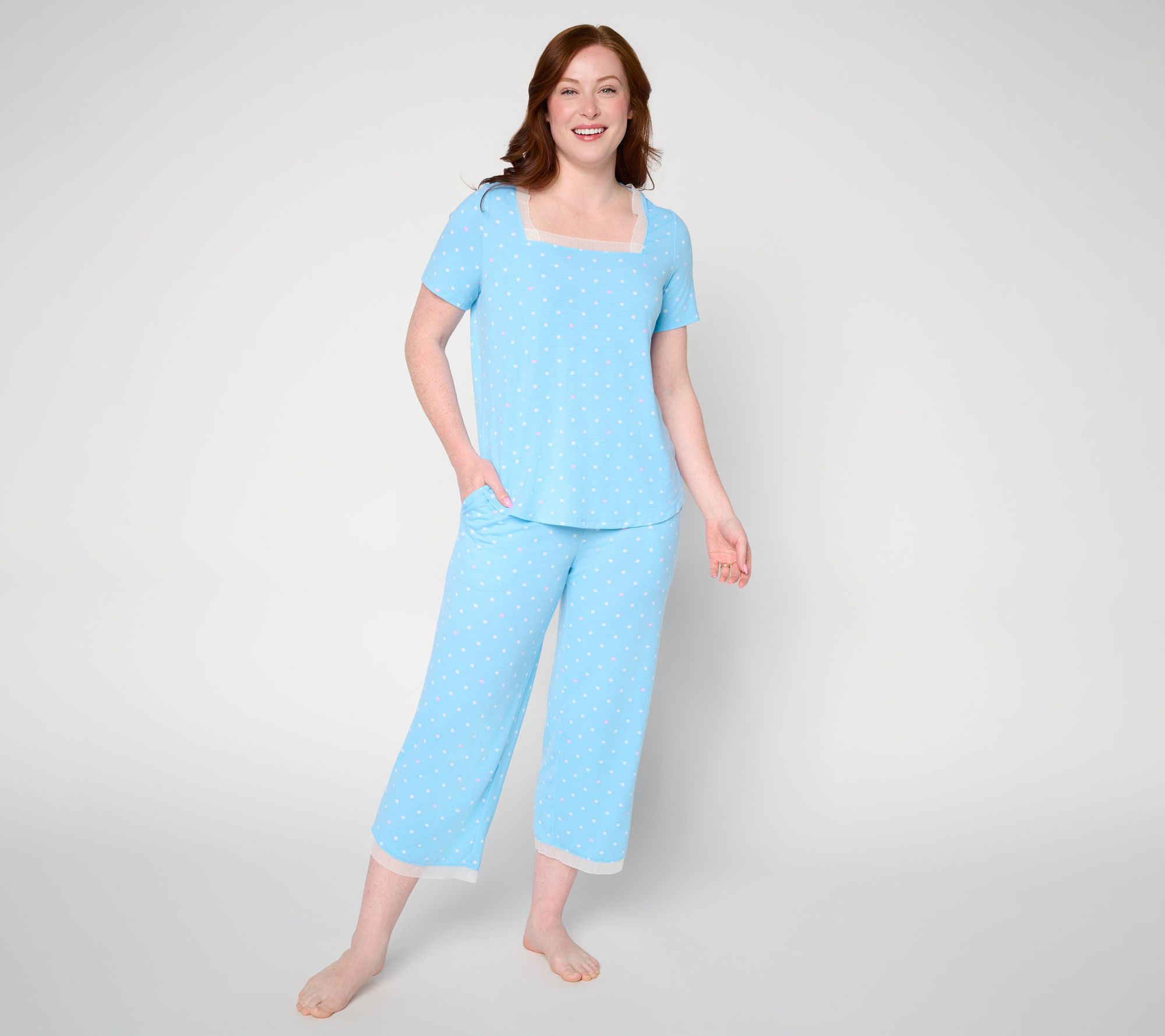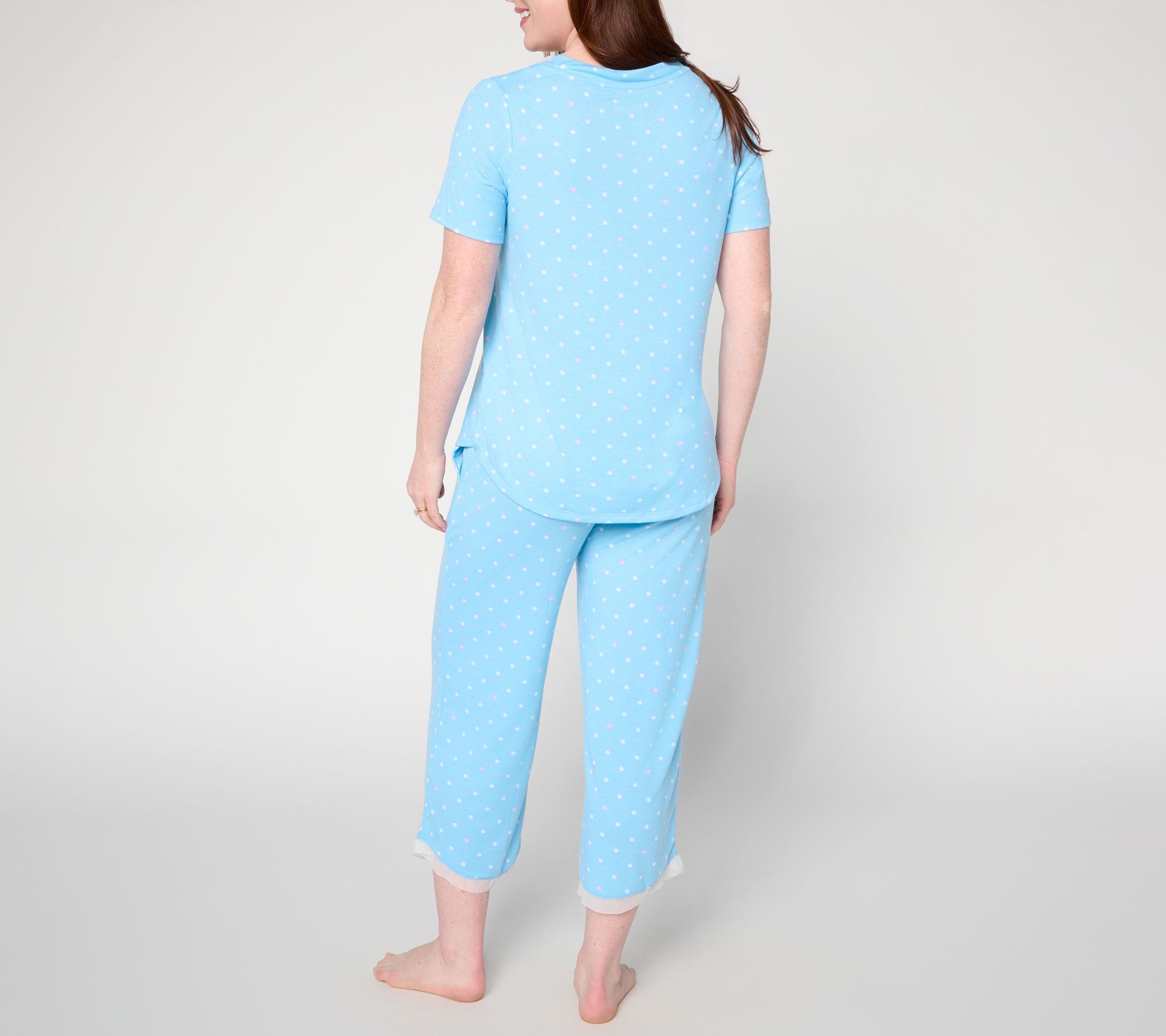 A restful night starts with this pajama set, featuring a soft knit top and straight-leg pants accented by mesh trim and satin details. It's the ideal set for curling up or winding down. From Cuddl Duds.