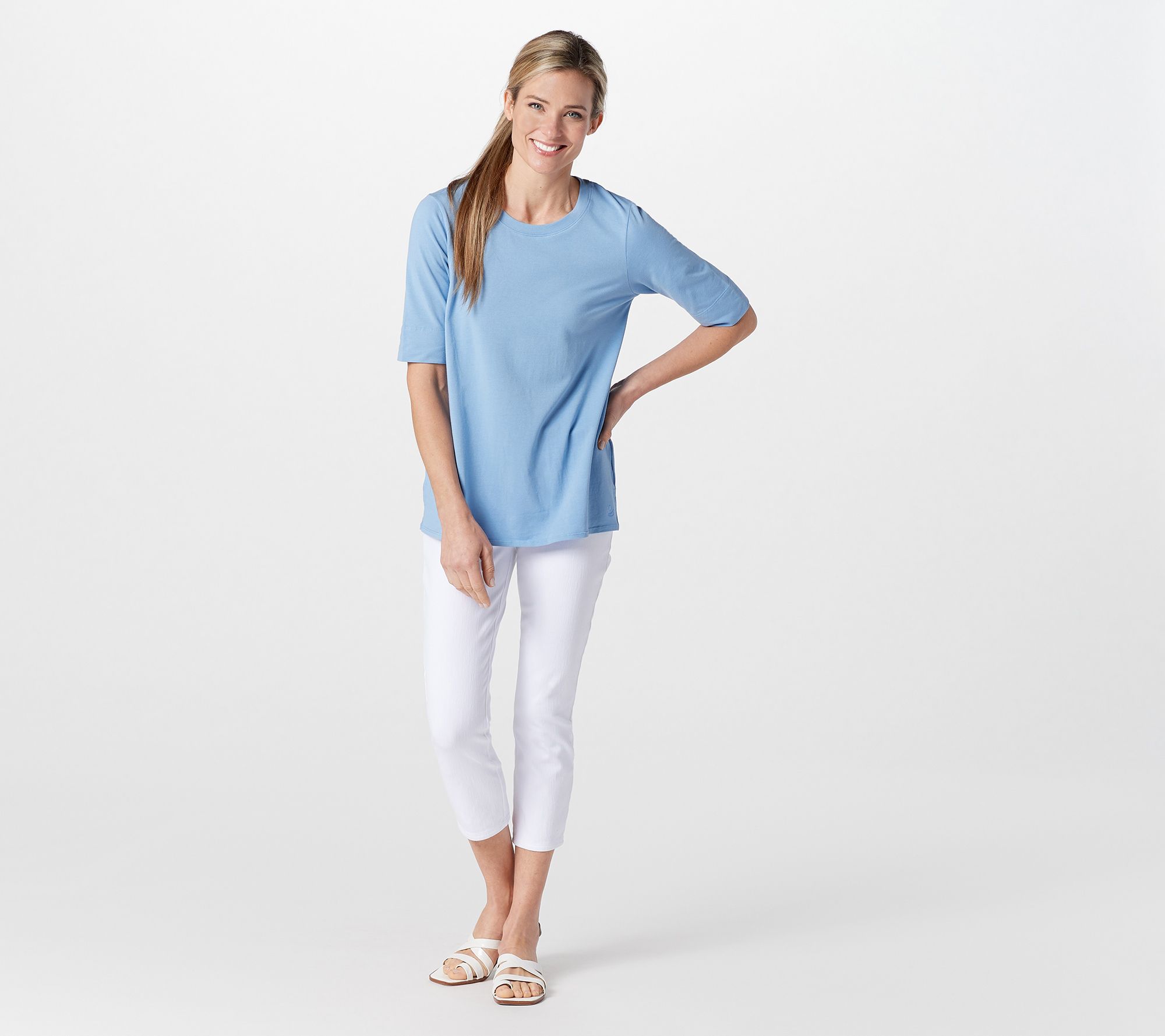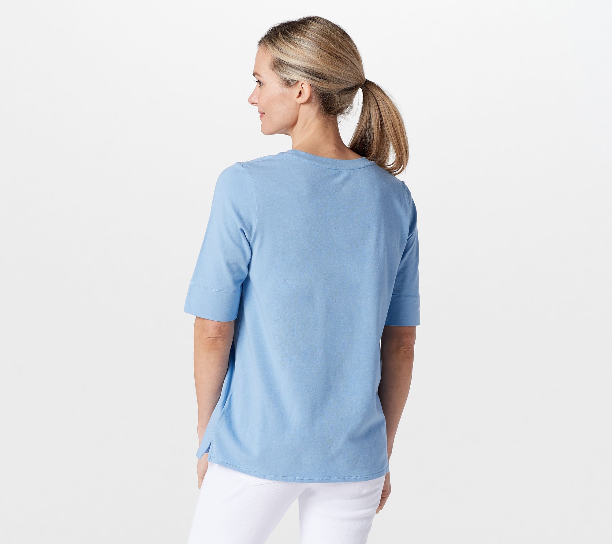 Cuddl Duds presents this two pack of cotton blend tops. Feature elbow sleeve length - scoop neckling - Side slits - Huggy logo *NOT A QVC FIT* Semi-Fitted: Follows the lines of the body with added wearing ease. Length: Missy Range: 26 3/4"-28 1/2". Plus Range: 29"-30". Content: 57% Cotton/38% Rayon/5% Spandex.___________________________ Care: MWC/GC/WLC/UONCBWN/TDL/RP/CIIN. COO: Imported.
