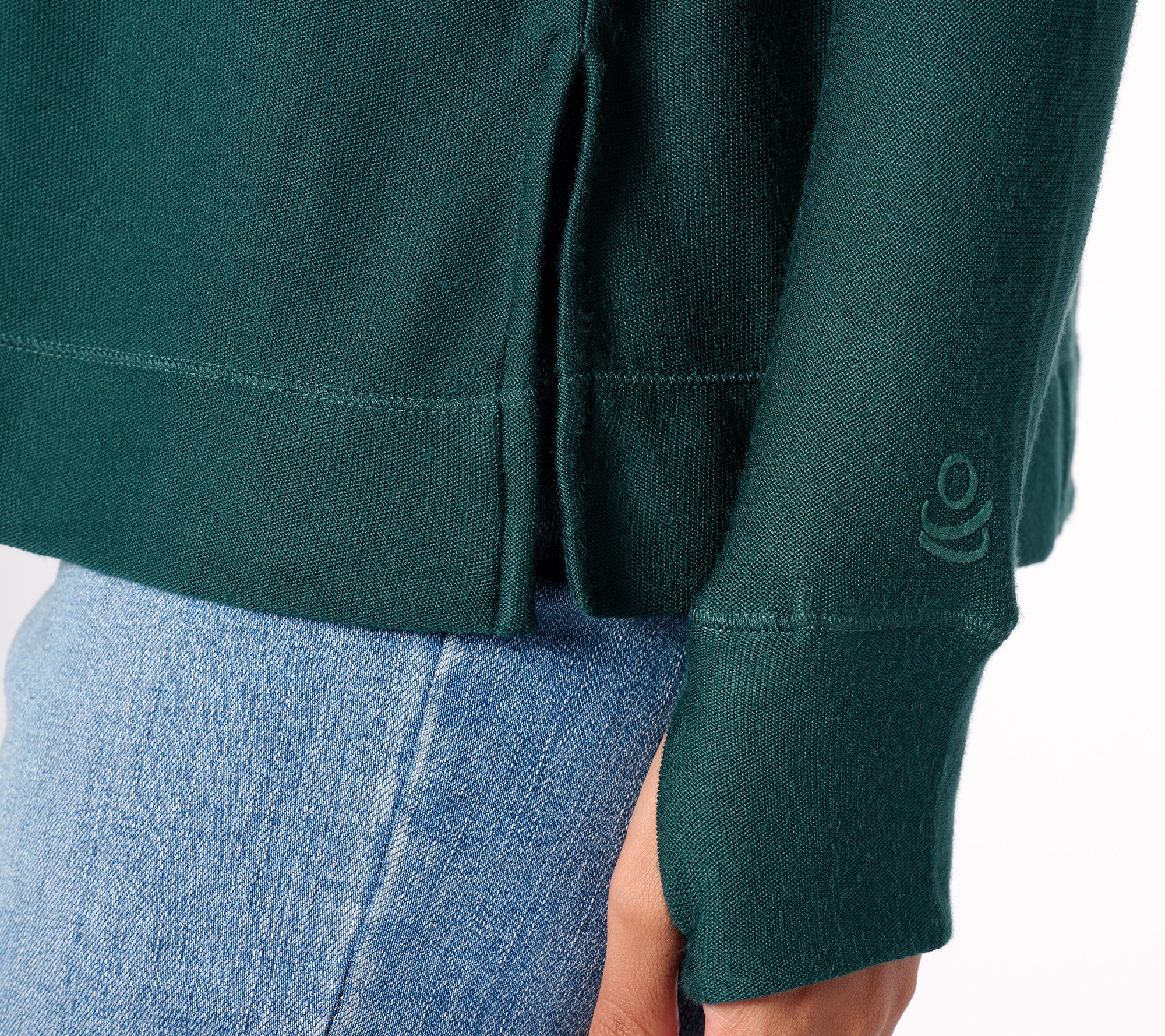 Features: split V-neckline, pullover style, long thumbhole sleeves, side slits