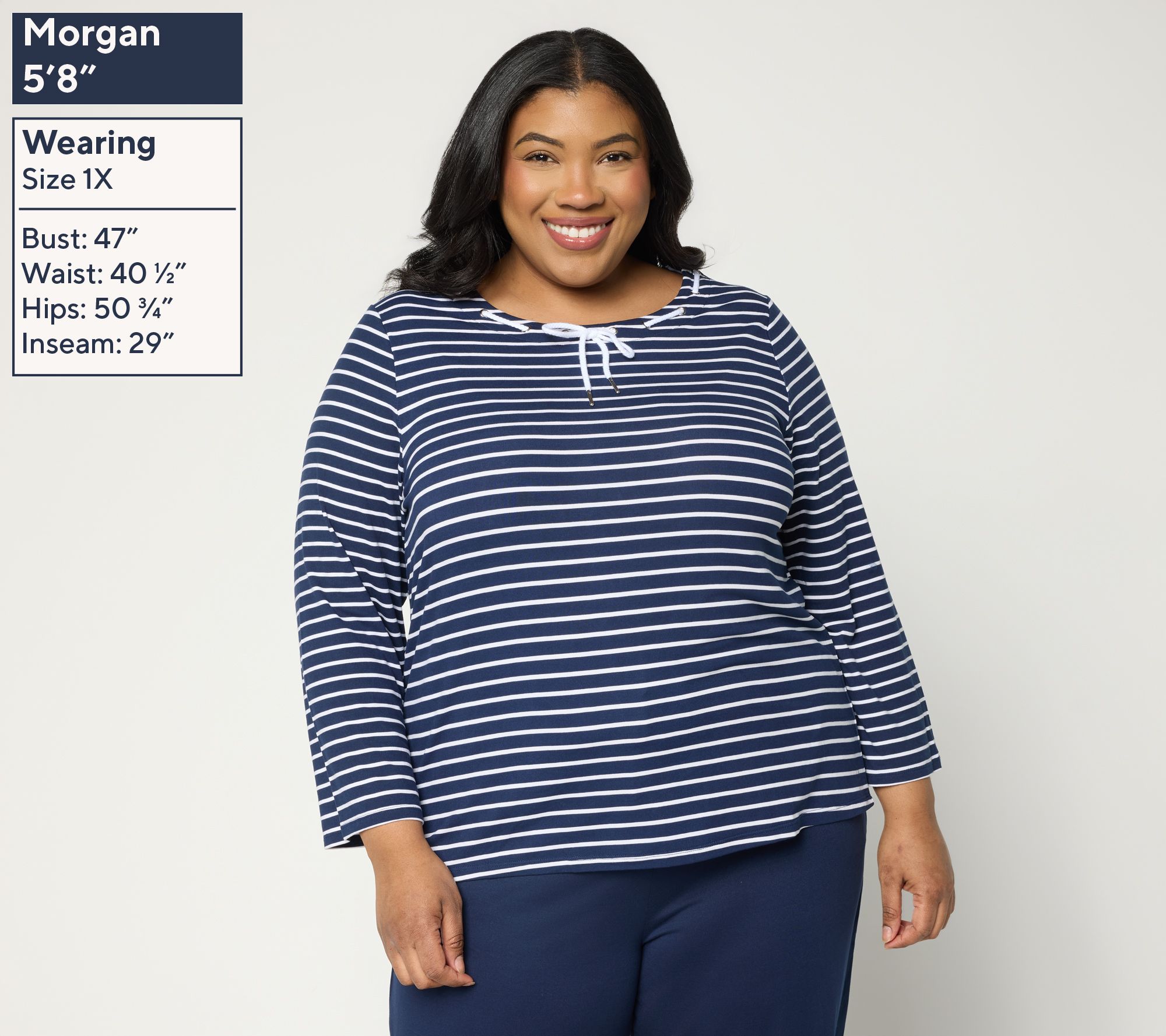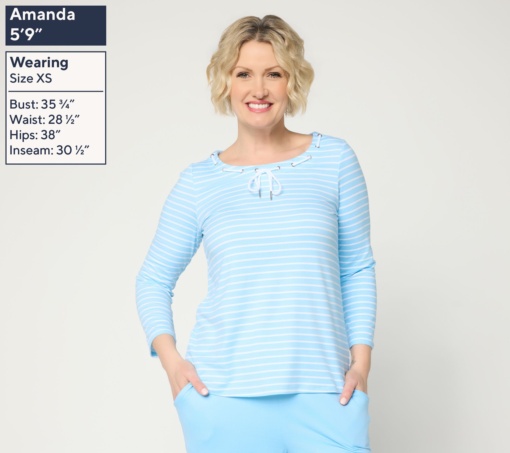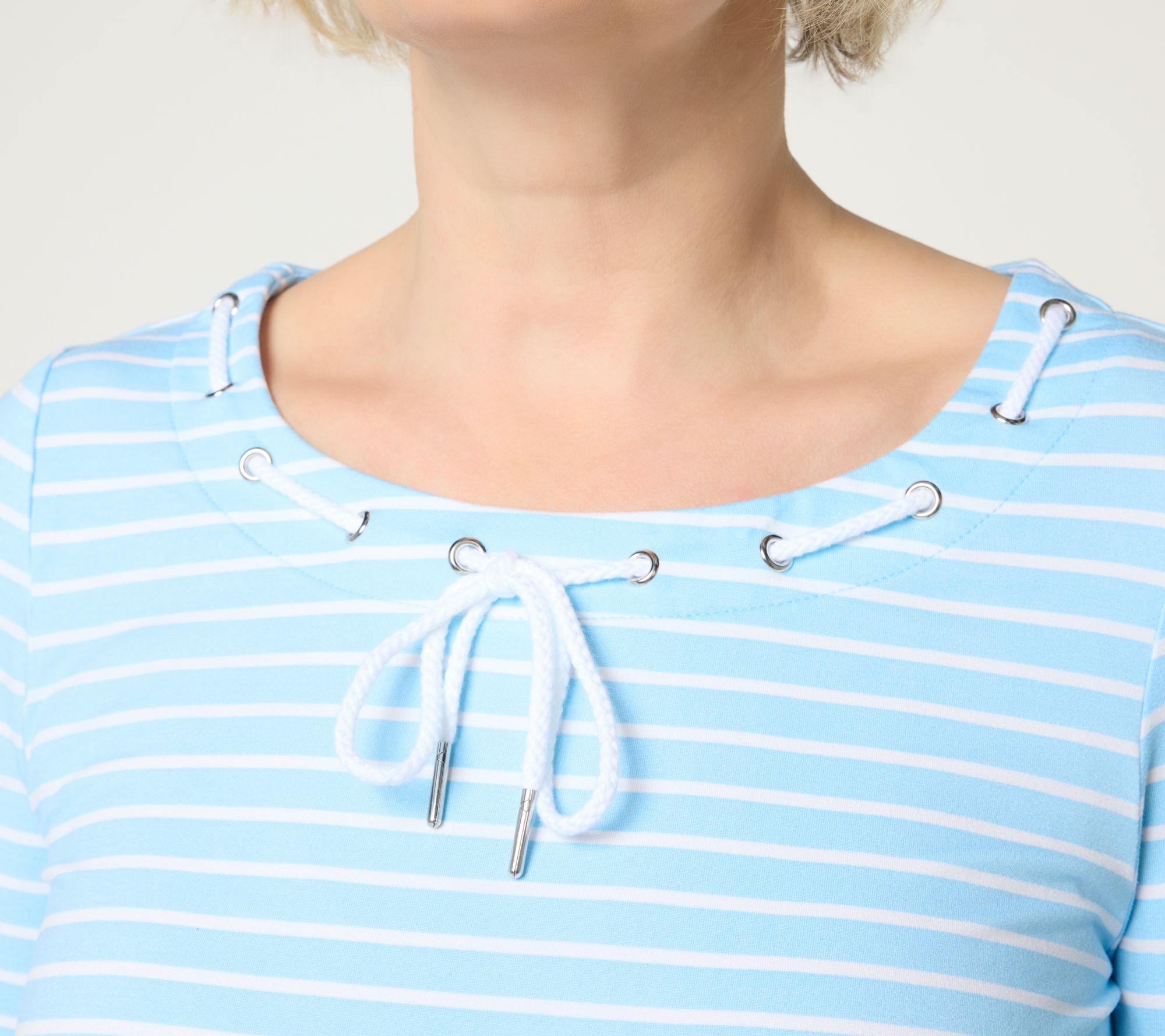 Features: scoop neckline with drawcord laced through grommets, 3/4-length sleeves, curved hem