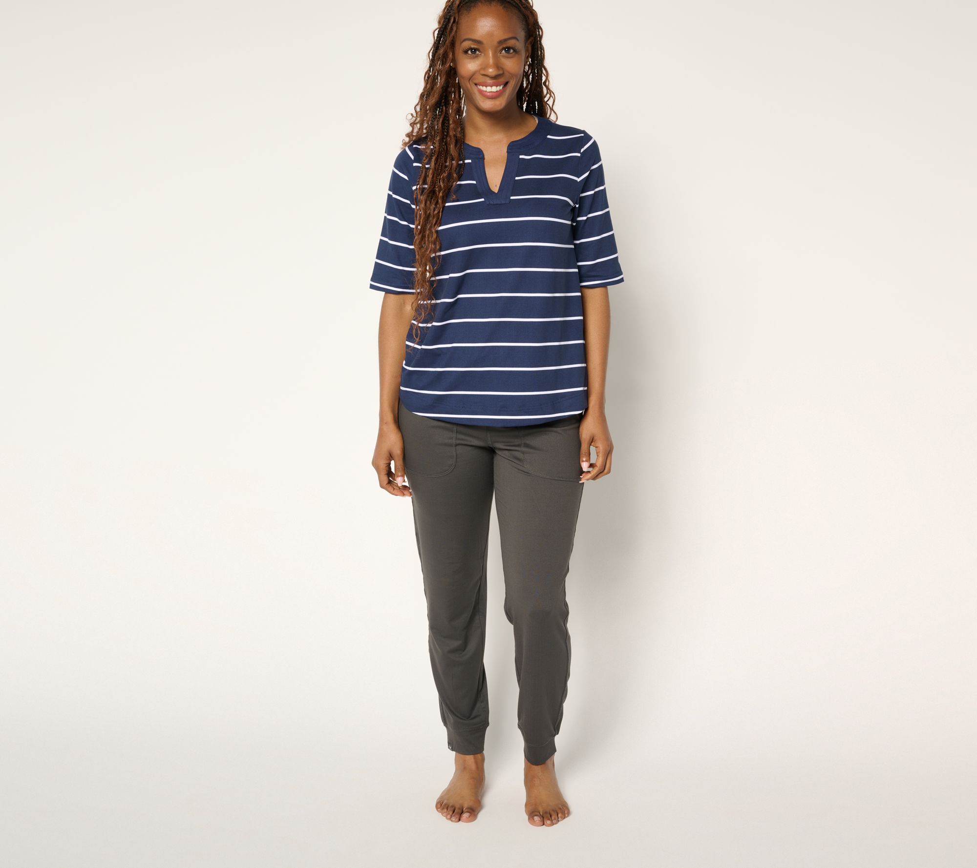 Take on the day nestled in the comfort of the Cuddl Duds Flexwear tee. A flattering split V-neck perfectly frames the face while the moisture-wicking fabric helps to keep you cool as a cucumber during your most active moments. From Cuddl Duds.